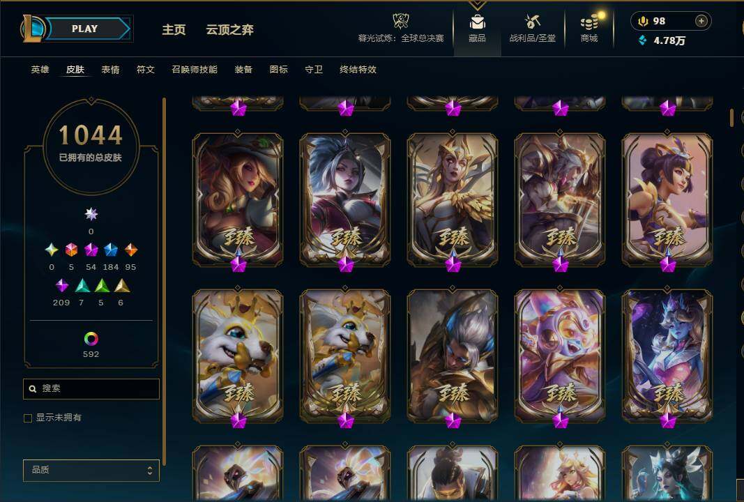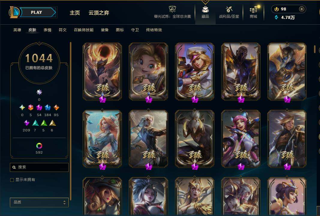 【至臻皮肤】 至臻魔女乐芙兰 至臻星之守护者索拉卡 至臻魅惑女巫莫甘娜 至臻电玩女神凯特琳 至臻暗星墨菲特 至臻焰执事布兰德 至臻黑夜使者李青 至臻飞升战神潘森 至臻灵能特工伊泽瑞尔 至臻战斗学院蕾欧娜 至臻青花瓷拉克丝 至臻绒毛菲兹 至臻女帝黛安娜 至臻星之守护者辛德拉 至臻奥术师佐伊 至臻海之歌萨勒芬妮 至臻真实伤害亚索 至臻幻灵战斗猫金克丝 至臻真实伤害赛娜 至臻月蚀骑士赛娜 至臻未来战士卢锡安 至臻真实伤害奇亚娜 至臻腥红之月亚托克斯 至臻未来战士锤石 至臻神龙尊者炎龙瑟提