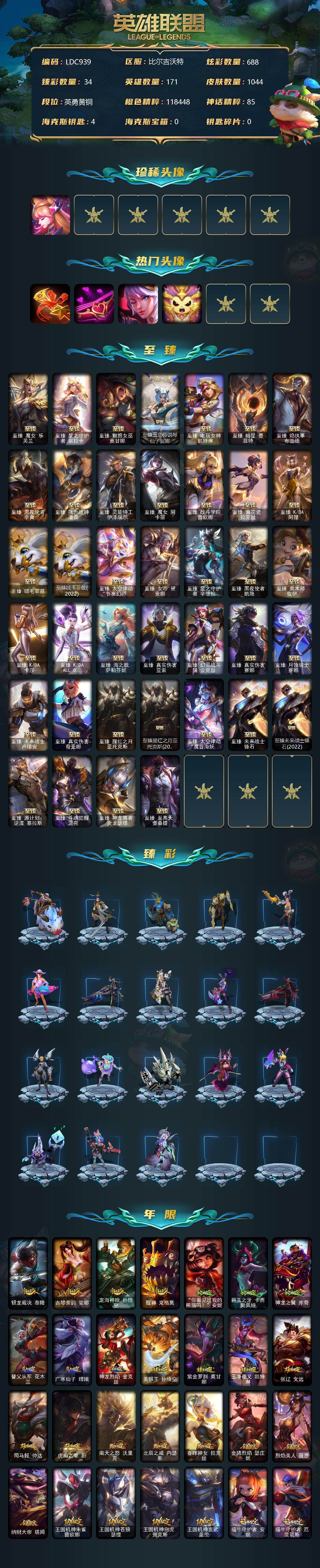 【LDC939】171英雄/1044皮肤/7终极/54神话/184限定/34臻彩/688炫彩/95传说/209史诗/青铜账号等级:537/星守阿狸头像/卡特琳娜的匕首头像/爱情之歌头像/觅心之翼奎因头像/星守索拉卡头像/至臻魔女乐芙兰/至臻星之守护者索拉卡/至臻魅惑女巫莫甘娜/至臻玉剑传说琴仙子娑娜/至臻电玩女神凯特琳/至臻暗星墨菲特/至臻焰执事布兰德/至臻黑夜使者李青/至臻飞升战神潘森/至臻灵能特工伊泽瑞尔/至臻魔女阿卡丽/至臻战斗学院蕾欧娜/至臻青花瓷拉克丝/至臻KDA阿狸/至臻绒毛菲兹/至臻绒毛菲兹(2022)/至臻太空律动节奏幻师璐璐/至臻女帝黛安娜/至臻星之守护者辛德拉/至臻黑夜使者凯隐/至臻奥术师佐伊/至臻KDA卡莎/至臻KDAALLOUT卡莎/至臻海之歌萨勒芬妮/至臻真实伤害亚索/至臻幻灵战斗猫金克丝/至臻真实伤害赛娜/至臻月蚀骑士赛娜/至臻未来战士卢锡安/至臻真实伤害奇亚娜/至臻腥红之月亚托克斯/至臻腥红之月亚托克斯(2022)/至臻太空律动魔音海妖娜美/至臻未来战士锤石/至臻未来战士锤石(2022)/至臻源计划逆流塞拉斯/至臻斗魂觉醒派克/至臻神龙尊者炎龙瑟提/至臻至高天奎桑提/剪纸仙灵嘉文四世日进斗金/定海神珍孙悟空四海扬威/天龙之子卡莎飞龙乘云/无畏骑士瑟庄妮赤子初心/玉剑传说无极白虎/墨之影武者亚索金墨耀影/冠军典狱长锤石凯旋圣装/冠军之隐劫凯旋圣装/墨之影武者易金墨耀影/雾雨之刃锐雯/泳池派对凯特琳粉红冰川/西部天使赛娜神选天使长/战斗学院卡特琳娜盛典礼服/咖啡甜心金克丝核桃巴菲/星之守护者金克丝黑洞/西部天使赛娜贝利尔之怠/弹幕天使卡莎炽天使公正/泳池派对奥莉安娜优雅珠光鲸/霸天巨兽雪崩墨菲特/星之吞噬者莫甘娜热情之末/幻灵战斗兔锐雯梦幻强袭/最终BOSS维迦里大魔王/幻灵战斗队长厄运小姐勇气赞歌/魔女阿卡丽虚荣/净雪之月莫甘娜冬虹/幻灵战斗兔阿萝拉梦幻强袭/神凰行者幽羽玄凰萨勒芬妮仙翰/墨之影武者永恩灵墨刻影/红莲之刃锐雯/北极星钢影卡蜜尔智慧纽带/心之钢伊泽瑞尔天纵才华/银龙裁决泰隆/古琴余韵娑娜/定海神珍孙悟空/醒狮克格莫/你看见过我的熊猫吗安妮/碧玉之牙卡西奥佩娅/神龙之翼库奇/替父从军花木兰/广寒仙子嫦娥/神龙烈焰金克丝/美猴王孙悟空/紫金罗刹莫甘娜/玉净夜叉凯特琳/张辽文远/司马懿仲达/虎痴之拳蔚/南天之怒沃里克/北辰之威内瑟斯/春晖神女拉克丝/金猪烈焰瑟庄妮/烈焰美人薇恩/纳财大帝塔姆/王国机神朱雀蕾欧娜/王国机神苍狼瑟提/王国机神白虎贾克斯/王国机神玄武盖伦/福牛守护者安妮/福牛守护者厄斐琉斯/福牛守护者菲奥娜/猛虎下山赵信/虎头虎脑崔丝塔娜/烈焰仙子黛安娜/天龙之子斯莫德/新创战纪希维尔/海克斯科技崔丝塔娜/海克斯科技斯维因/海克斯科技魔腾/海克斯科技嘉文四世/海克斯科技玛尔扎哈/海克斯科技克格莫/海克斯科技吉格斯/恐惧新星德莱厄斯/甜心宝贝安妮/甜心宝贝娑娜/碎心之拳蔚/穿心之剑菲奥娜/觅心萝莉金克丝/觅心猎手薇恩/觅心之翼奎因/觅心游侠卢锡安/觅心猫猫悠米/觅心魔灵奥莉安娜/幸福女神乐芙兰/冰雪风暴希维尔/冬境仙灵索拉卡/圣诞开心鬼提莫/圣诞精灵崔丝塔娜/圣诞狂欢努努和威朗普/圣诞糖果棒厄运小姐/圣诞狂欢基兰/狂心冰王图奇/阿木木“主人不要我了”/胡桃夹子萨科/冰封王子蒙多/平安夜女神娑娜/英勇玩具兵普朗克/邪恶圣诞老人维迦/夺命美人卡特琳娜/喜庆之树茂凯/雪默丁格/圣诞玩偶波比/冰雪驯鹿波比/圣诞老人古拉加斯/圣诞驯鹿克格莫/魄罗骑士瑟庄妮/雪球也能爆炸吉格斯/圣诞老人布隆/圣诞捣蛋鬼金克丝/冰雪节辛吉德/冰雪节玛尔扎哈/冰雪女神辛德拉/冰雪兽纳尔/大元素使拉克丝/DJ娑娜/KDAALLOUT萨勒芬妮独立音乐人/未来战士伊泽瑞尔/武装战姬厄运小姐/十周年纪念安妮/源代码乐芙兰/新卧虎藏龙贾克斯/暗星科加斯/神凰行者瑞羽圣凰艾尼维亚/黎明使者卡尔玛/至臻绒毛菲兹2022/至臻未来战士锤石2022/至臻腥红之月亚托克斯2022/至臻玉剑传说琴仙子/战熊骑士瑟庄妮/钢铁军团拉克丝/卧虎藏龙贾克斯/诺斯费拉图弗拉基米尔/送披萨的小姐姐希维尔/穿星魔锋赵信/冠军之血希瓦娜/冠军之隐劫/冠军之箭艾希/冠军之志瑞兹/Fnatic古拉加斯/Fnatic迦娜/Fnatic嘉文四世/Fnatic卡尔萨斯/Fnatic库奇/暗杀星奥莉安娜/暗杀星蒙多/暗杀星努努和威朗普/暗杀星慎/SKTT1贾克斯/SKTT1婕拉/SKTT1李青/SKTT1薇恩/SSW辛吉德/SSW图奇/SSW泰隆/SKTT1阿兹尔/SKTT1雷克顿/SKTT1瑞兹/SKTT1伊莉丝/SKTT1艾克/SKTT1烬/SKTT1辛德拉/SSG纳尔/SSG洛/FPX普朗克/FPX薇恩/安妮梦游仙境/勇敢的心德莱厄斯/电玩女神厄运小姐/电玩勇者锐雯/电玩女神阿狸/星之守护者伊泽瑞尔/玉剑传说舞剑仙/灵能特工易/神凰行者烈羽焰凰霞/神凰行者幽羽玄凰萨勒芬妮/玉剑传说无劫/玉剑传说神机花火/暗裔英雄盖伦/胜利女神希维尔/胜利之树茂凯/胜利枪神格雷福斯/胜利之剑亚托克斯/胜利女神瑟庄妮/胜利凤凰艾尼维亚/胜利之王泰达米尔/胜利巨口克格莫/海贼瑞兹/南瓜头费德提克/伯爵卡萨丁/大魔法锅布里茨/鬼影重重魔腾/鬼影森森茂凯/无头骑士赫卡里姆/魅惑女巫厄运小姐/魅惑女巫奈德丽/魅惑女巫悠米/魅惑女巫妮蔻/泳池派对奥莉安娜/泳池派对厄运小姐/泳池派对格雷福斯/泳池派对黑默丁格/泳池派对凯特琳/泳池派对雷克顿/泳池派对蕾欧娜/泳池派对李青/泳池派对瑟提/泳