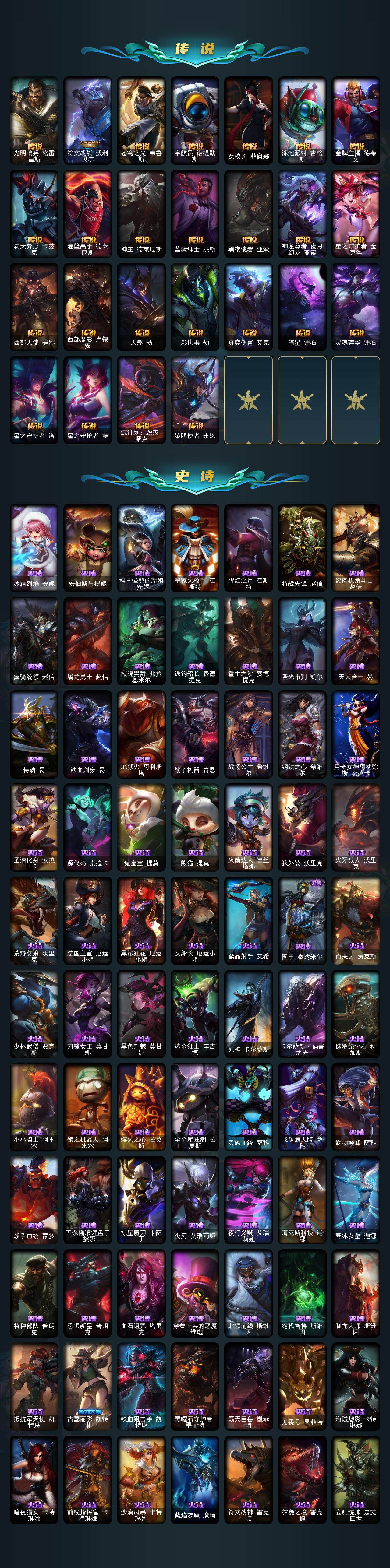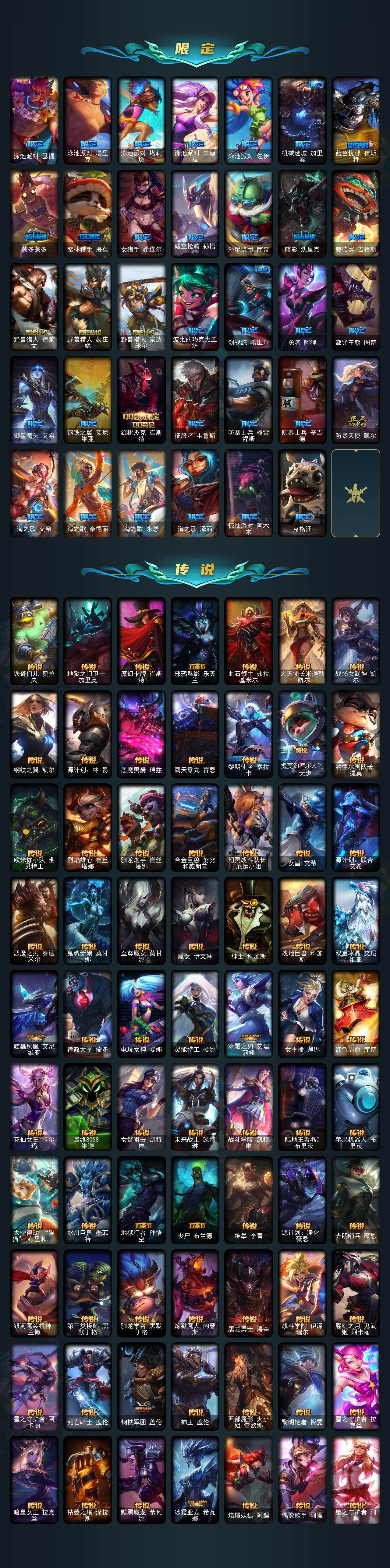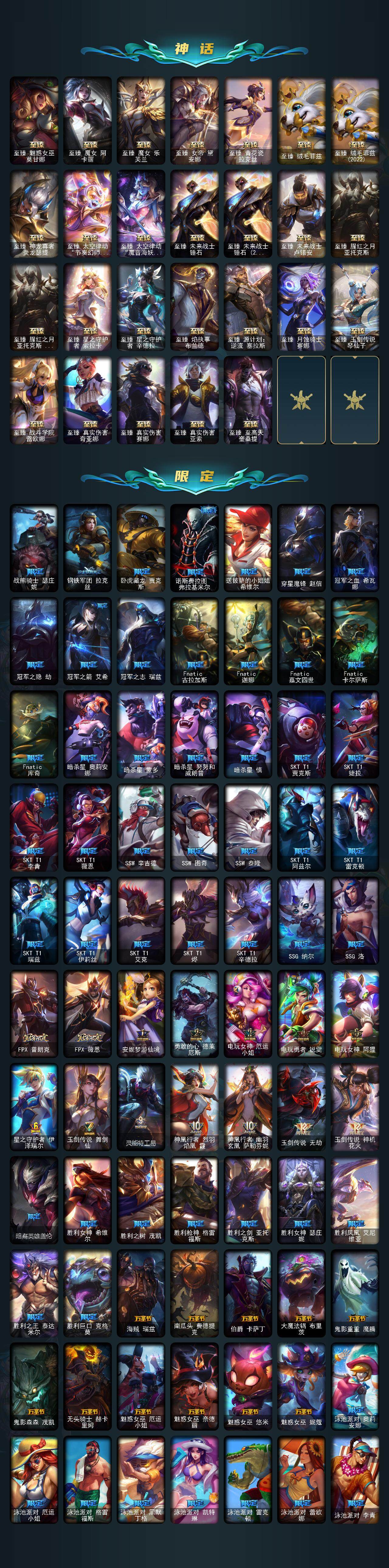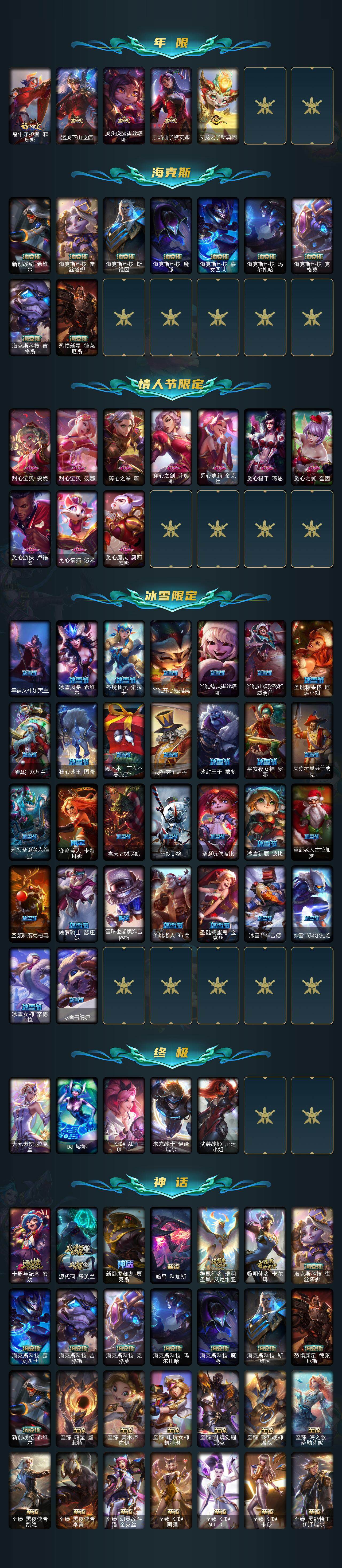 【年限皮肤】 银龙裁决泰隆 古琴余韵娑娜 醒狮克格莫 碧玉之牙卡西奥佩娅 神龙之翼库奇 替父从军花木兰 广寒仙子嫦娥 神龙烈焰金克丝 美猴王孙悟空 紫金罗刹莫甘娜 玉净夜叉凯特琳 张辽文远 司马懿仲达 虎痴之拳蔚 南天之怒沃里克 北辰之威内瑟斯 春晖神女拉克丝 金猪烈焰瑟庄妮 烈焰美人薇恩 纳财大帝塔姆 王国机神朱雀蕾欧娜 王国机神苍狼瑟提 王国机神白虎贾克斯 王国机神玄武盖伦 福牛守护者安妮 福牛守护者厄斐琉斯 福牛守护者菲奥娜