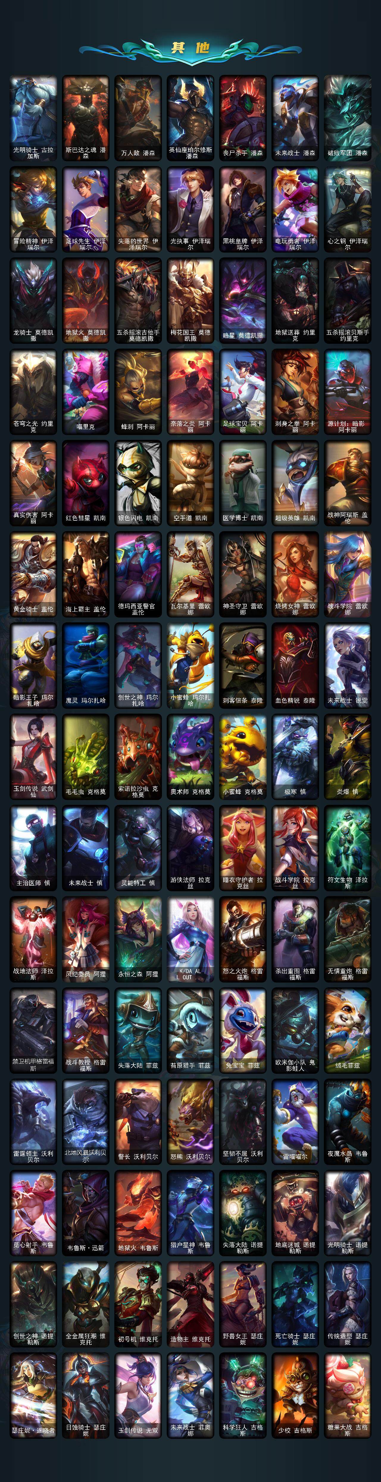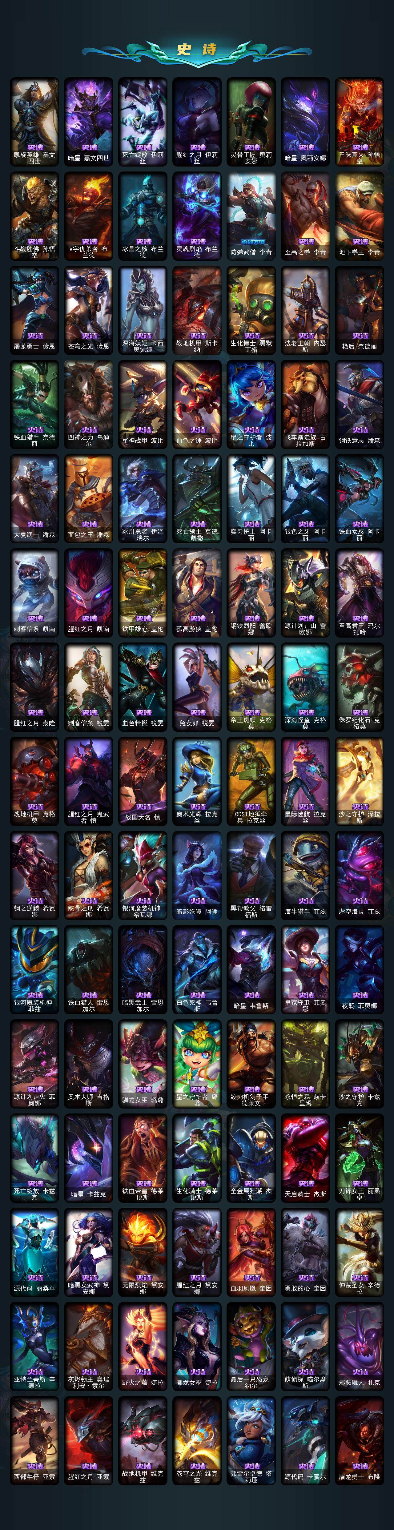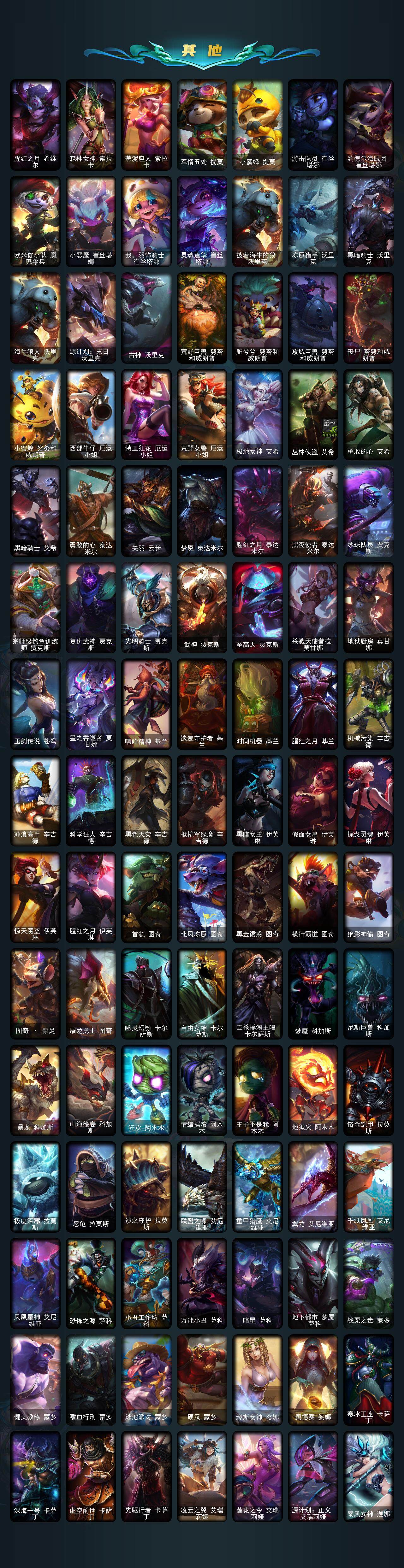 【年限皮肤】 银龙裁决泰隆 古琴余韵娑娜 醒狮克格莫 碧玉之牙卡西奥佩娅 神龙之翼库奇 替父从军花木兰 广寒仙子嫦娥 神龙烈焰金克丝 美猴王孙悟空 紫金罗刹莫甘娜 玉净夜叉凯特琳 张辽文远 司马懿仲达 虎痴之拳蔚 南天之怒沃里克 北辰之威内瑟斯 春晖神女拉克丝 金猪烈焰瑟庄妮 烈焰美人薇恩 纳财大帝塔姆 王国机神朱雀蕾欧娜 王国机神苍狼瑟提 王国机神白虎贾克斯 王国机神玄武盖伦 福牛守护者安妮 福牛守护者厄斐琉斯 福牛守护者菲奥娜