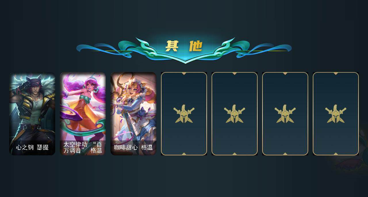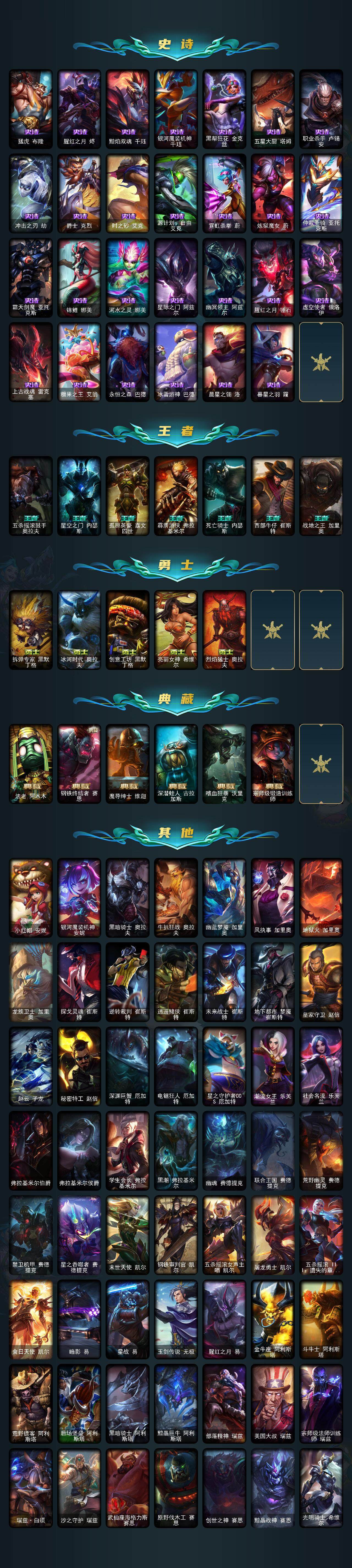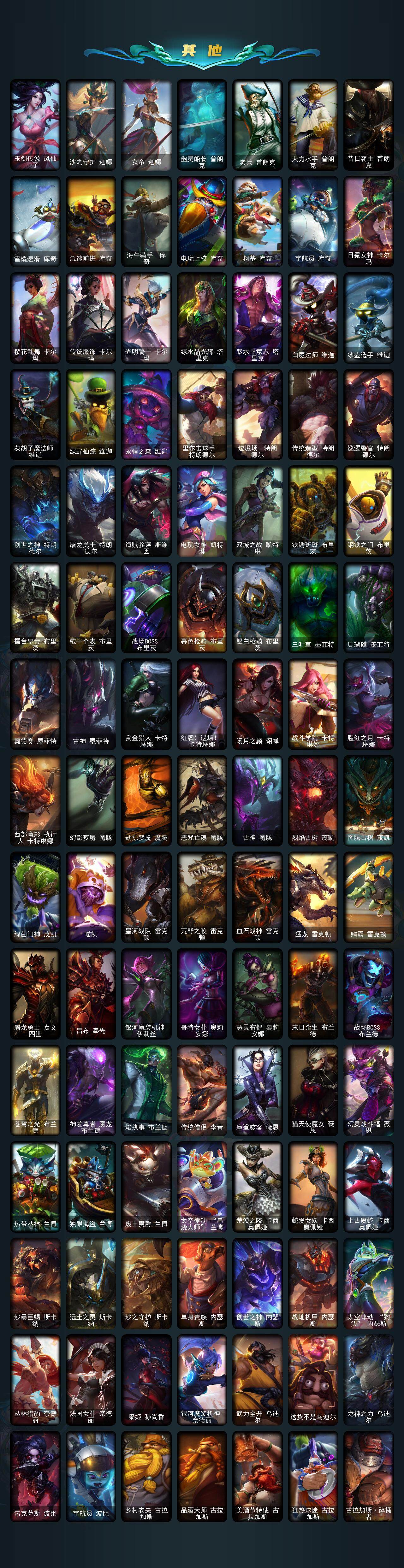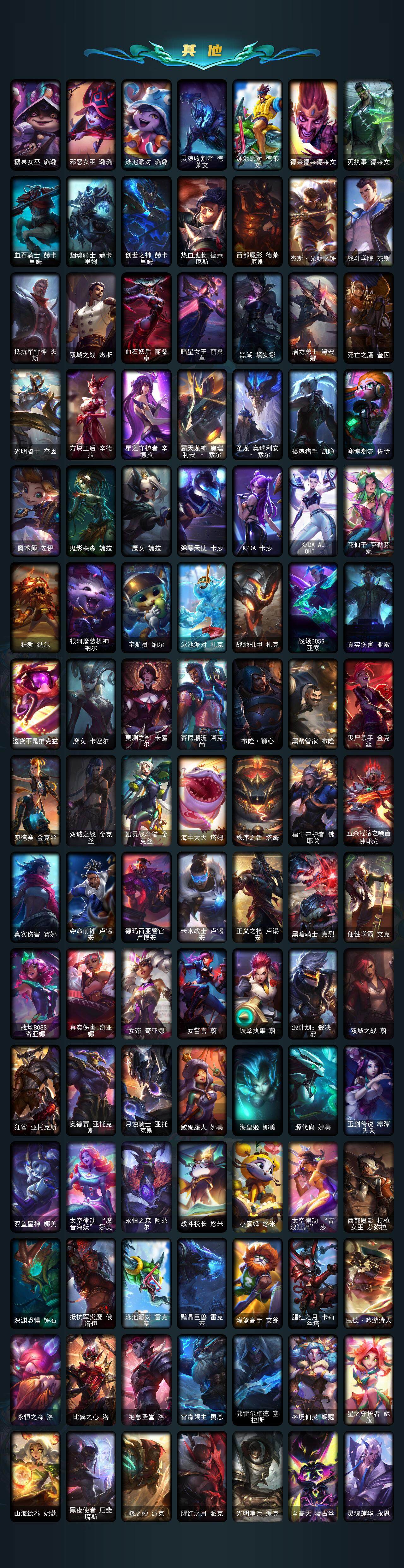 【年限皮肤】 银龙裁决泰隆 古琴余韵娑娜 醒狮克格莫 碧玉之牙卡西奥佩娅 神龙之翼库奇 替父从军花木兰 广寒仙子嫦娥 神龙烈焰金克丝 美猴王孙悟空 紫金罗刹莫甘娜 玉净夜叉凯特琳 张辽文远 司马懿仲达 虎痴之拳蔚 南天之怒沃里克 北辰之威内瑟斯 春晖神女拉克丝 金猪烈焰瑟庄妮 烈焰美人薇恩 纳财大帝塔姆 王国机神朱雀蕾欧娜 王国机神苍狼瑟提 王国机神白虎贾克斯 王国机神玄武盖伦 福牛守护者安妮 福牛守护者厄斐琉斯 福牛守护者菲奥娜