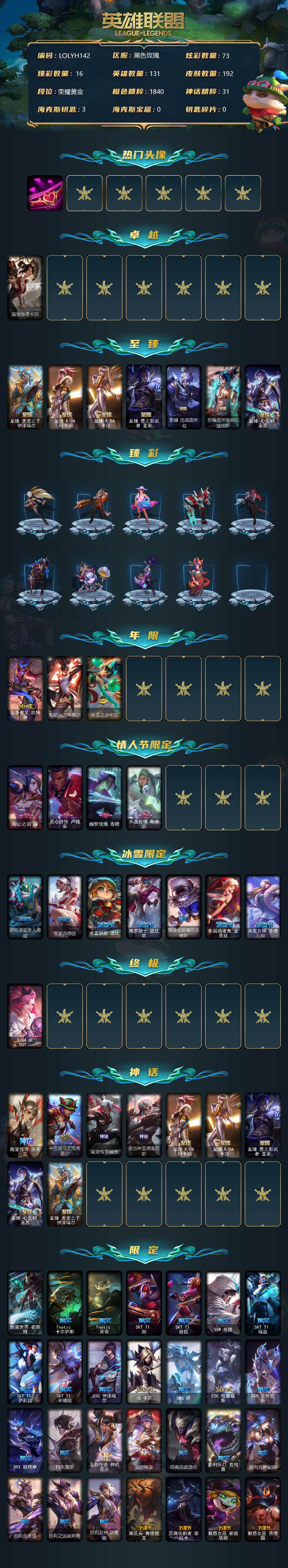 【LOLYH142】131英雄/192皮肤/3终极/11神话/51限定/16臻彩/73炫彩/20传说/13史诗/黄金账号等级:279/爱情之歌头像/殿堂传奇卡莎/至臻天龙之子伊泽瑞尔/至臻KDA阿卡丽/至臻KDA卡莎/至臻墨之影武者亚索/至臻灵魂莲华劫/至臻莲华温泉厄斐琉斯/至臻心之钢永恩/无畏猎手卡莎极境飞跃/无畏游侠卢锡安不败圣枪/泳池派对凯特琳粉红冰川/霸天战士雷恩加尔星啸天火/西部魔影卢锡安贝利尔之怠/玉剑传说无劫胭脂/咖啡甜心璐璐焦糖布丁/星之守护者金克丝黑洞/灵魂莲华卡西奥佩娅流火/海之歌永恩月夜潮汐/殿堂传奇乐芙兰登神/魔女阿卡丽虚荣/魔女阿狸饕餮/水晶玫瑰斯维因纯洁花蕾/玉净夜叉凯特琳/剪纸仙灵希维尔/天龙之子卡莎/甜心之羽霞/觅心游侠卢锡安/幽梦玫瑰泰隆/水晶玫瑰斯维因/邪恶圣诞老人维迦/雪装奈德丽/冰雪驯鹿波比/魄罗骑士瑟庄妮/雪球也能爆炸吉格斯/圣诞捣蛋鬼金克丝/冰雪女神辛德拉/KDAALLOUT萨勒芬妮独立音乐人/殿堂传奇乐芙兰/十五周年纪念希维尔/殿堂传奇薇恩/圣洁神王德莱厄斯/地底世界崔斯特/Fnatic卡尔萨斯/Fnatic库奇/SKTT1劫/SKTT1婕拉/SSW泰隆/SKTT1瑞兹/SKTT1伊莉丝/SKTT1辛德拉/SSG伊泽瑞尔/iG卡莎/DWG烬/EDG格雷福斯/DRX亚托克斯/DRX凯特琳/T1韦鲁斯/玉剑传说神机花火/女帝格温/暗裔英雄盖伦/胜利巨口克格莫/胜利女神娑娜/胜利剑圣易/胜利之运崔斯特/胜利女神菲奥娜/南瓜头费德提克/灵魂收割者索拉卡/魅惑女巫崔丝塔娜/魅惑女巫奈德丽/泳池派对布隆/泳池派对厄运小姐/泳池派对格雷福斯/泳池派对凯特琳/泳池派对瑟提/勇者奈德丽/斗魂觉醒伊芙琳/海之歌艾希/海之歌永恩/钢铁之翼凯尔/合金巨兽努努和威朗普/西部天使艾希/战地巨兽科加斯/电玩女神娑娜/女主播迦娜/花仙女王卡尔玛/女帝卡特琳娜/源计划泯灭雷克顿/星之守护者阿卡丽/暗星女王拉克丝/偶像歌手阿狸/灵魂莲华阿狸/神王德莱厄斯/心之钢凯隐/星之守护者金克丝/西部天使赛娜/西部魔影卢锡安/真实伤害艾克/暗星锤石/掠星魔刃卡萨丁/寒冰女皇迦娜/至高之拳李青/军神战甲波比/冰川勇者伊泽瑞尔/刺客信条锐雯/死亡绽放卡兹克/源代码丽桑卓/源计划风亚索/黑帮狂花金克丝/源计划雷卢锡安/源计划阴劫/幽冥领主阿兹尔/孤胆英豪嘉文四世/西部牛仔崔斯特/深潜蛙人古拉加斯/宗师级锻造训练师/风执事加里奥/太空律动万能舞王崔斯特/星之守护者COS厄加特/咖啡甜心弗拉基米尔/食日天使凯尔/无极执事易/黯晶巨牛阿利斯塔/美国大叔瑞兹/沙之守护瑞兹/伏虎之力希维尔/莲华温泉提莫/灵魂莲华崔丝塔娜/古神沃里克/神龙尊者苍龙艾希/宗师级钓鱼训练师贾克斯/玉剑传说苍鸾/KDA伊芙琳/糖果大战伊芙琳/黑夜使者伊芙琳/屠龙勇士图奇/健美教练蒙多/五杀摇滚III遗失的章节娑娜/星之守护者娑娜/源计划正义艾瑞莉娅/黎明使者迦娜/柯基库奇/宇航员维迦/绝息圣堂魔腾/猛龙雷克顿/黑夜使者嘉文四世/黑色玫瑰假面舞会伊莉丝/战斗学院孙悟空/灵魂莲华薇恩/灵魂莲华卡西奥佩娅/黑夜使者内瑟斯/西部魔影古拉加斯/暗星莫德凯撒/宇航员凯南/战斗学院蕾欧娜/小蜜蜂玛尔扎哈/虚空执事玛尔扎哈/小蜜蜂克格莫/电格莫/主治医师慎/荣誉使者慎/青花瓷拉克丝/KDA阿狸/魔女阿狸/战斗教授格雷福斯/莲华温泉沃利贝尔/猎户星神韦鲁斯/净雪之月韦鲁斯/造物主维克托/源计划统帅瑟庄妮/糖果女巫璐璐/邪恶女巫璐璐/破败军团德莱文/魂蔷薇德莱文/奥德赛卡兹克/战斗学院杰斯/黑潮黛安娜/女帝黛安娜/圣龙奥瑞利安索尔/魔女婕拉/KDA卡莎/墨之影武者卡莎/幽梦玫瑰泽丽/奥德赛金克丝/秩序之舌塔姆/福牛守护者佛耶戈/夺命前锋卢锡安/未来战士艾克/星之守护者艾克/永恒之森阿兹尔/战斗校长悠米/太空律动音浪狂舞莎弥拉/黯晶巨兽雷克塞/宇航员艾翁/比翼之心霞/太空律动创乐之神奥恩/嘟嘟奥恩/弗雷尔卓德塞拉斯/源计划逆流塞拉斯/黑夜使者厄斐琉斯/灵魂莲华厄斐琉斯/女帝芮尔/神龙尊者炎龙瑟提/魔域梦魇烈娜塔/魔女尼菈/心之钢奎桑提/斗魂觉醒纳亚菲利【按大区: 电信】