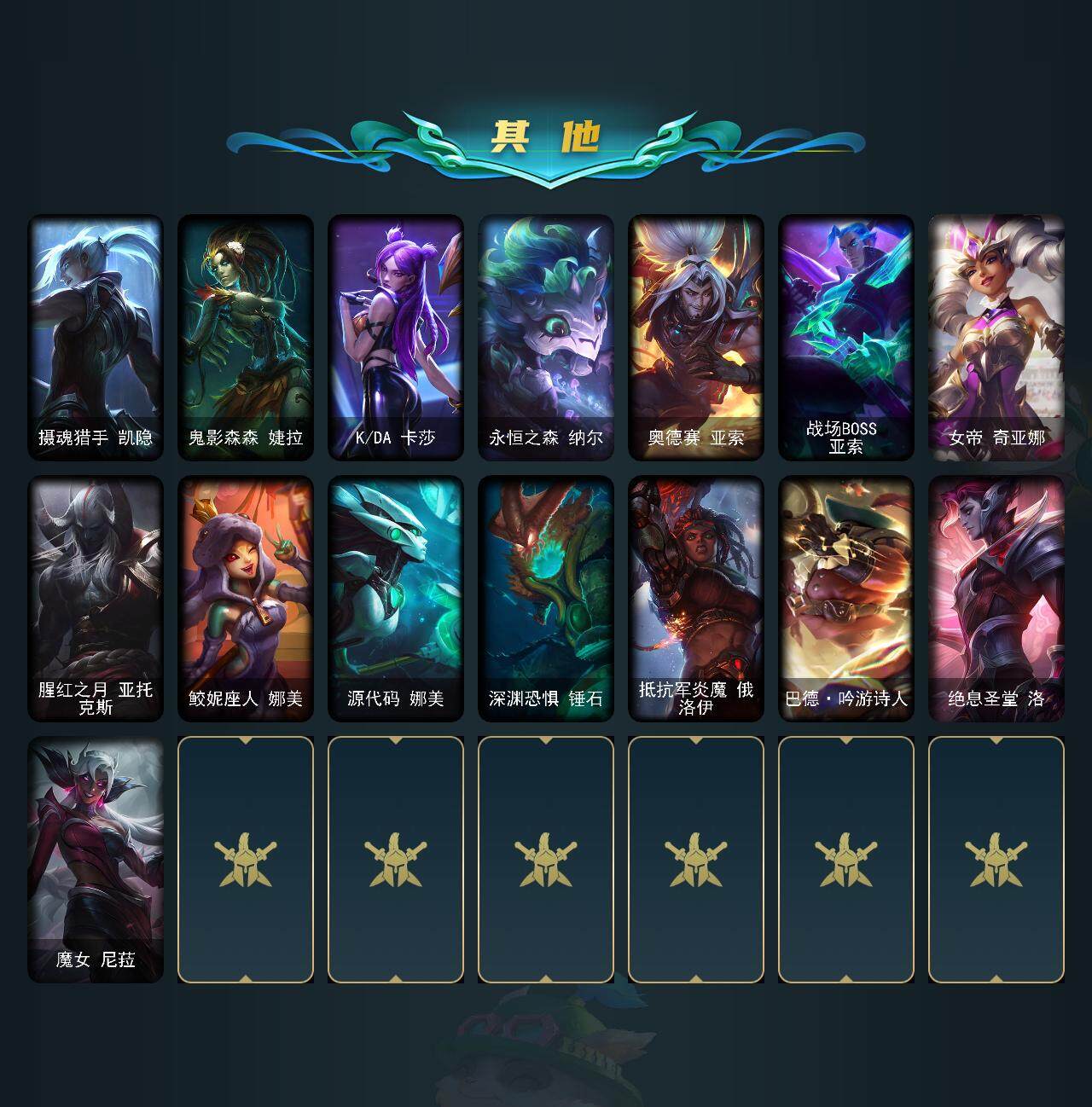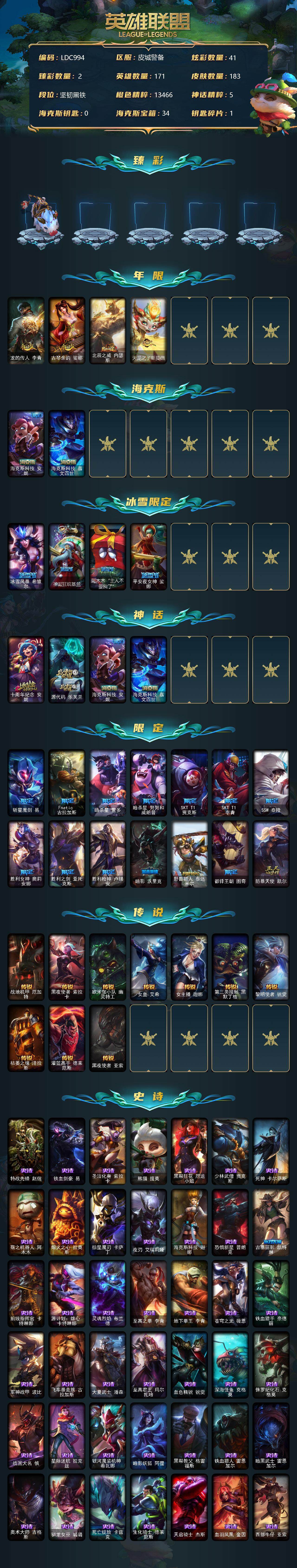 【LDC994】171英雄/183皮肤/4神话/22限定/2臻彩/41炫彩/10传说/50史诗/未定级/无畏骑士瑟庄妮赤子初心/魔女阿卡丽虚荣/龙的传人李青/古琴余韵娑娜/北辰之威内瑟斯/天龙之子斯莫德/海克斯科技安妮/海克斯科技嘉文四世/冰雪风暴希维尔/圣诞狂欢基兰/阿木木“主人不要我了”/平安夜女神娑娜/十周年纪念安妮/源代码乐芙兰/斩星魔剑易/Fnatic古拉加斯/暗杀星蒙多/暗杀星努努和威朗普/SKTT1贾克斯/SKTT1李青/SSW泰隆/胜利女神奥莉安娜/胜利之剑亚托克斯/胜利枪神卢锡安/暗影沃里克/野兽猎人泰达米尔/都铎王朝图奇/防暴天使凯尔/战地机甲厄加特/黑夜使者索拉卡/欧米伽小队幽灵特工/女皇艾希/女主播迦娜/第三类接触黑默丁格/黎明使者锐雯/枯萎之壤泽拉斯/灌篮高手德莱厄斯/黑夜使者亚索/特战先锋赵信/铁血剑豪易/圣洁化身索拉卡/熊猫提莫/黑帮狂花厄运小姐/少林武僧贾克斯/死神卡尔萨斯/殇之机器人阿木木/熔火之心拉莫斯/掠星魔刃卡萨丁/夜刃艾瑞莉娅/海克斯科技迦娜/恐惧新星普朗克/古墓丽影凯特琳/前线指挥官卡特琳娜/源计划雄心卡特琳娜/灵魂烈焰布兰德/至高之拳李青/地下拳王李青/苍穹之光薇恩/铁血猎手奈德丽/军神战甲波比/飞车暴走族古拉加斯/大夏武士潘森/至高君王玛尔扎哈/血色精锐锐雯/深海怪鱼克格莫/侏罗纪化石克格莫/战国大名慎/星际迷航拉克丝/银河魔装机神希瓦娜/暗影妖狐阿狸/黑帮教父格雷福斯/铁血猎人雷恩加尔/暗黑武士雷恩加尔/奥术大师吉格斯/驯龙女巫璐璐/死亡绽放卡兹克/生化骑士德莱厄斯/天启骑士杰斯/血羽凤凰奎因/西部牛仔亚索/源计划风亚索/腥红之月亚索/职业杀手卢锡安/爵士克烈/源计划自由艾克/霓虹杀拳蔚/上古战魂雷克塞/糖果之王艾翁/霹雳游侠弗拉基米尔/死亡骑士内瑟斯/战地之王加里奥/法老阿木木/魔导绅士维迦/风执事加里奥/黑暗骑士赵信/深渊巨蟹厄加特/潮流女王乐芙兰/弗拉基米尔伯爵/学生会长弗拉基米尔/幽魂费德提克/金牛座阿利斯塔/斗牛士阿利斯塔/美国大叔瑞兹/原野伐木工赛恩/森林女神索拉卡/绝息圣堂厄运小姐/梦魇泰达米尔/嘻哈精神基兰/机械污染辛吉德/黑暗女王伊芙琳/KDAALLOUT伊芙琳/黑金诱惑图奇/五杀摇滚III遗失的章节卡尔萨斯/尼斯巨兽科加斯/情绪摇滚阿木木/忍龟拉莫斯/联盟之喙艾尼维亚/千纸凤凰艾尼维亚/万能小丑萨科/战栗之毒蒙多/健美教练蒙多/嗜血行刑蒙多/缪斯女神娑娜/幽灵船长普朗克/老兵普朗克/绿水晶光辉塔里克/白魔法师维迦/垃圾场特朗德尔/传统造型特朗德尔/屠龙勇士特朗德尔/海贼参谋斯维因/铁锈斑斑布里茨/战场BOSS布里茨/珊瑚礁墨菲特/奥德赛墨菲特/星河战队雷克顿/血石战神雷克顿/哥特女仆奥莉安娜/恶灵布偶奥莉安娜/黑夜使者李青/独眼海盗兰博/单身贵族内瑟斯/丛林猎豹奈德丽/法国女仆奈德丽/龙神之力乌迪尔/品酒大师古拉加斯/丧尸杀手潘森/足球先生伊泽瑞尔/光执事伊泽瑞尔/龙骑士莫德凯撒/地狱送葬约里克/抵抗军灵魔约里克/蜂刺阿卡丽/源计划暗影阿卡丽/黄金骑士盖伦/海上霸主盖伦/魔灵玛尔扎哈/玉剑传说武剑仙/怒之火炮格雷福斯/苔原猎手菲兹/怒熊沃利贝尔/坚韧不屈沃利贝尔/雷喵喵尔/地底迷城诺提勒斯/造物主维克托/野兽女王瑟庄妮/糖果女巫璐璐/灵魂收割者德莱文/血石骑士赫卡里姆/魔女丽桑卓/摄魂猎手凯隐/鬼影森森婕拉/KDA卡莎/永恒之森纳尔/奥德赛亚索/战场BOSS亚索/女帝奇亚娜/腥红之月亚托克斯/鲛妮座人娜美/源代码娜美/深渊恐惧锤石/抵抗军炎魔俄洛伊/巴德吟游诗人/绝息圣堂洛/魔女尼菈【按大区: 电信】