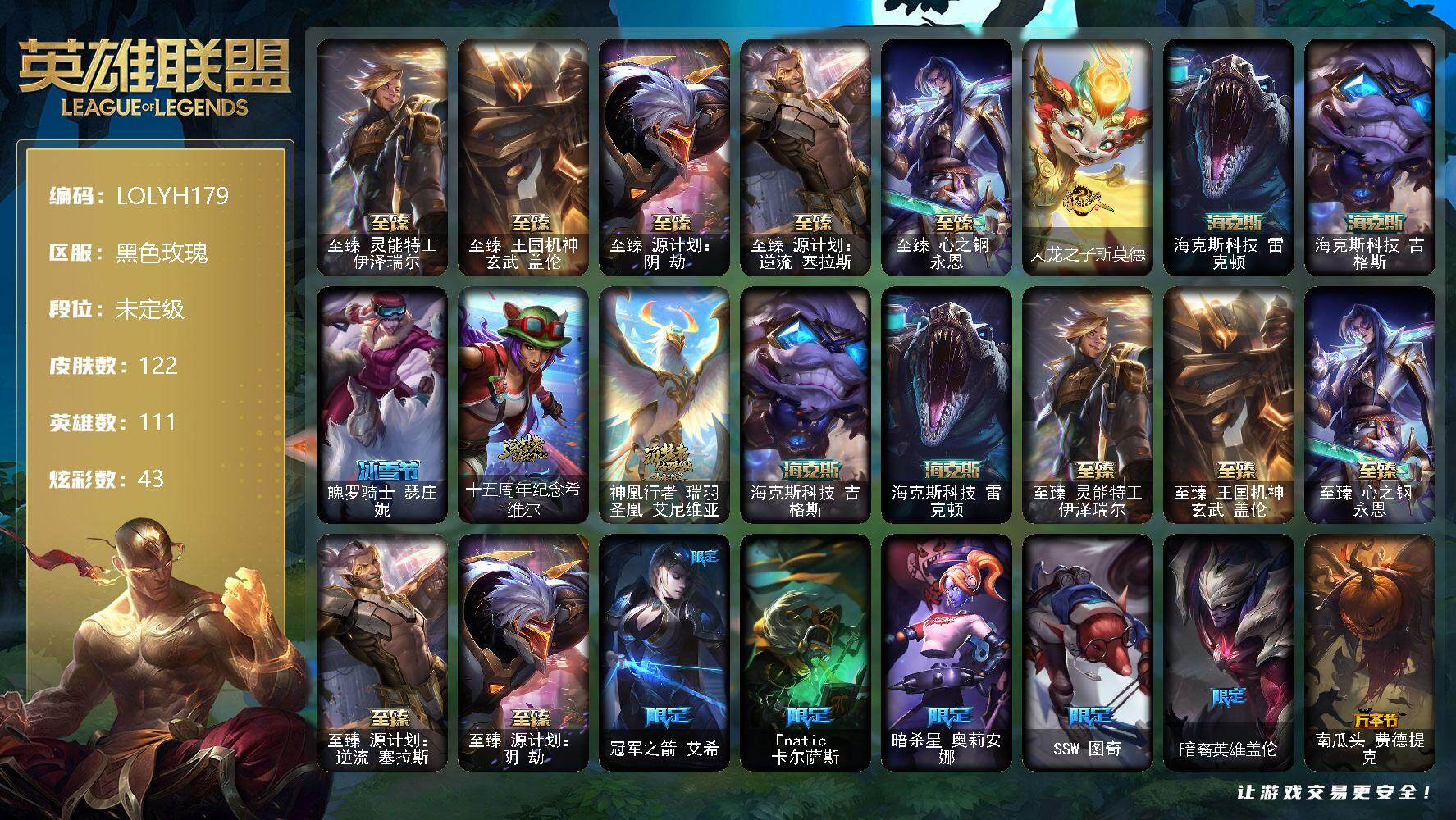 【LOLYH179】111英雄/122皮肤/9神话/9限定/4臻彩/43炫彩/15传说/19史诗/未定级/至臻灵能特工伊泽瑞尔/至臻王国机神玄武盖伦/至臻源计划阴劫/至臻源计划逆流塞拉斯/至臻心之钢永恩/无畏骑士瑟庄妮赤子初心/霸天异形卡兹克掠空魅影/可爱可爱粉红红布里茨/魔女阿卡丽虚荣/天龙之子斯莫德/海克斯科技雷克顿/海克斯科技吉格斯/魄罗骑士瑟庄妮/十五周年纪念希维尔/神凰行者瑞羽圣凰艾尼维亚/冠军之箭艾希/Fnatic卡尔萨斯/暗杀星奥莉安娜/SSW图奇/暗裔英雄盖伦/南瓜头费德提克/波比的巧克力工坊/邪鸦魅影乐芙兰/大天使长米迦勒凯尔/源计划林易/恶魔男爵瑞兹/约德尔国队长提莫/烈焰雄心崔丝塔娜/合金巨兽努努和威朗普/战地巨兽科加斯/黯晶凤凰艾尼维亚/冰川巨兽墨菲特/源计划超体莫德凯撒/枯萎之壤泽拉斯/黯黑魔龙希瓦娜/神龙尊者昼日真龙亚索/灵魂莲华瑟提/女船长厄运小姐/国王泰达米尔/少林武僧贾克斯/恐惧新星普朗克/暗星奥莉安娜/苍穹之光薇恩/四神之力乌迪尔/军神战甲波比/腥红之月鬼武者慎/战国大名慎/钢之逆鳞希瓦娜/银河魔装机神菲兹/铁血猎人雷恩加尔/星之守护者璐璐/源代码丽桑卓/野火之藤婕拉/黑帮狂花金克丝/时之砂艾克/幽冥领主阿兹尔/死亡骑士内瑟斯/咖啡甜心安妮/幽蓝梦魇加里奥/秘密特工赵信/弗拉基米尔伯爵/咖啡甜心弗拉基米尔/五杀摇滚女声主唱凯尔/玉剑传说无极/森林女神索拉卡/蕉泥座人索拉卡/星之守护者索拉卡/军情五处提莫/荒野巨兽努努和威朗普/攻城巨兽努努和威朗普/太空律动舞林双子努努和威朗普/光明骑士贾克斯/源计划孤狼贾克斯/玉剑传说苍鸾/腥红之月基兰/机械污染辛吉德/假面女皇伊芙琳/探戈灵魂伊芙琳/翼龙艾尼维亚/缪斯女神娑娜/雪橇速滑库奇/绿水晶光辉塔里克/白魔法师维迦/冰壶选手维迦/魔域梦魇特朗德尔/双城之战凯特琳/铁锈斑斑布里茨/暮色枪骑布里茨/银白枪骑布里茨/闭月之颜貂蝉/绿茵门神茂凯/小蜜蜂奥莉安娜/苍穹之光布兰德/焰执事布兰德/灵魂莲华薇恩/武力全开乌迪尔/心之钢伊泽瑞尔/喵里克/KDAALLOUT阿卡丽/魔女阿卡丽/空手道凯南/海上霸主盖伦/烧烤女神蕾欧娜/血色精锐泰隆/未来战士锐雯/山海绘卷克格莫/灵魂收割者德莱文/双城之战杰斯/女帝黛安娜/神龙尊者玉境灵龙卡莎/灵魂莲华亚索/断浪之刃亚索/糖果大战布隆/幽梦玫瑰泽丽/源计划疯狂金克丝/双城之战金克丝/未来战士卢锡安/任性学霸艾克/铁拳执事蔚/双城之战蔚/腥红之月亚托克斯/花仙骑士卡莉丝塔/巴德吟游诗人/绝息圣堂洛/神龙尊者炎龙瑟提/心之钢奎桑提【按大区: 电信】