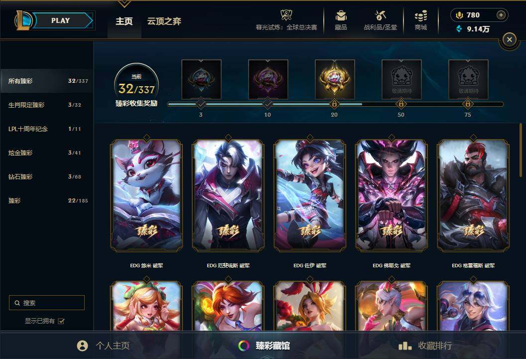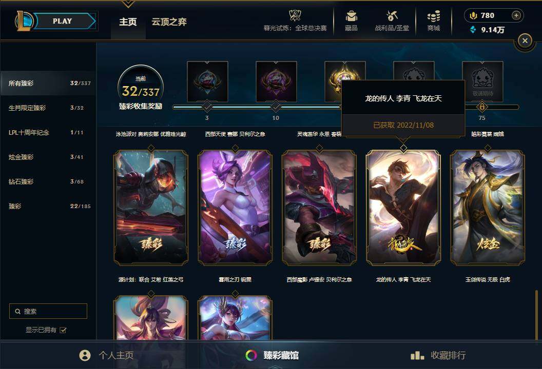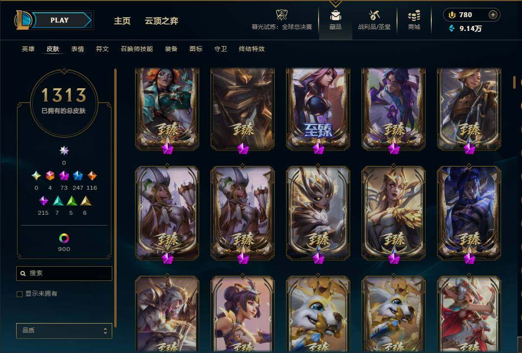 【至臻皮肤】 至臻魔女乐芙兰 至臻星之守护者索拉卡 至臻魅惑女巫厄运小姐 至臻电玩女神凯特琳 至臻暗星墨菲特 至臻黑夜使者李青 至臻飞升战神潘森 至臻灵能特工伊泽瑞尔 至臻青花瓷拉克丝 至臻绒毛菲兹 至臻神龙尊者均衡之龙沃利贝尔 至臻福牛守护者菲奥娜 至臻女帝黛安娜 至臻奥术师佐伊 至臻魔女婕拉 至臻海之歌萨勒芬妮 至臻幻灵战斗猫金克丝 至臻未来战士卢锡安 至臻星之守护者艾克 至臻真实伤害奇亚娜 至臻腥红之月亚托克斯 至臻神凰行者烈羽焰凰霞 至臻星之守护者妮蔻 至臻神龙尊者炎龙瑟提