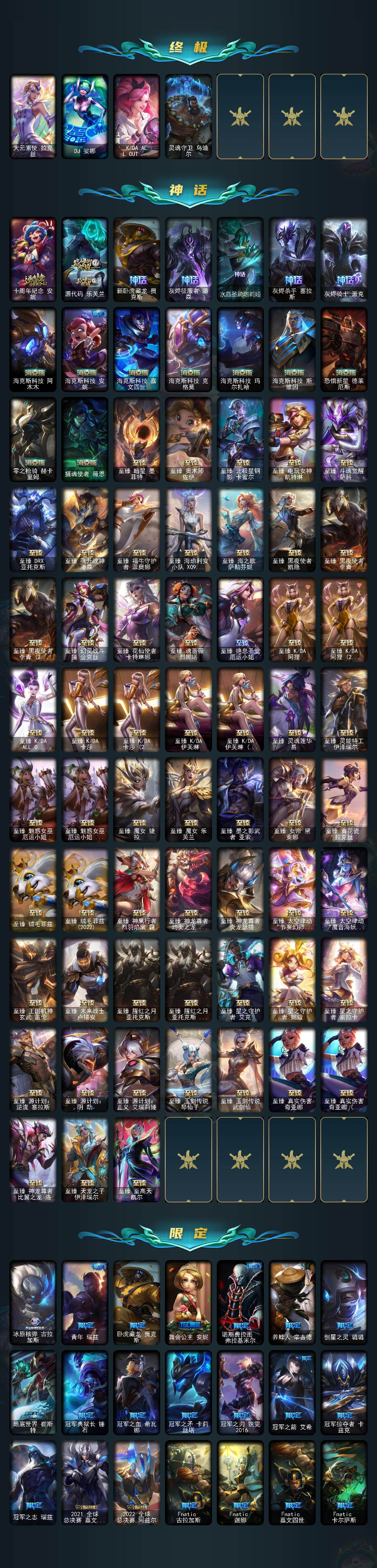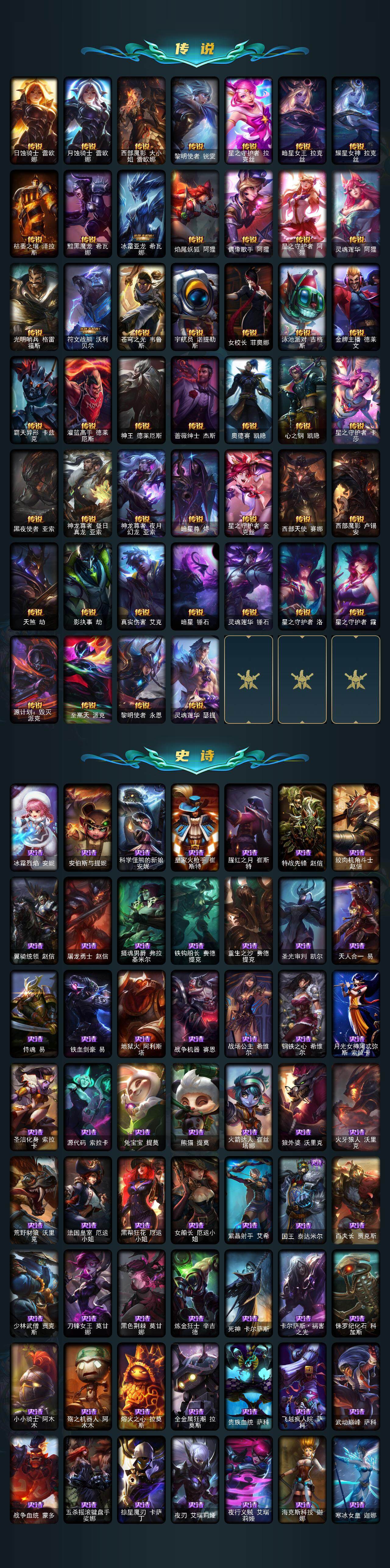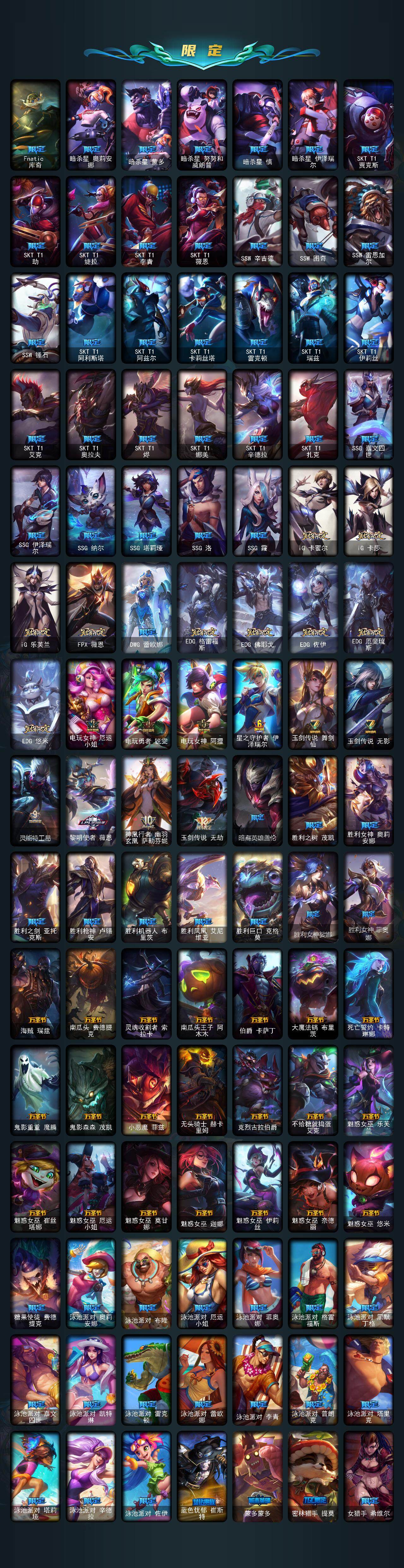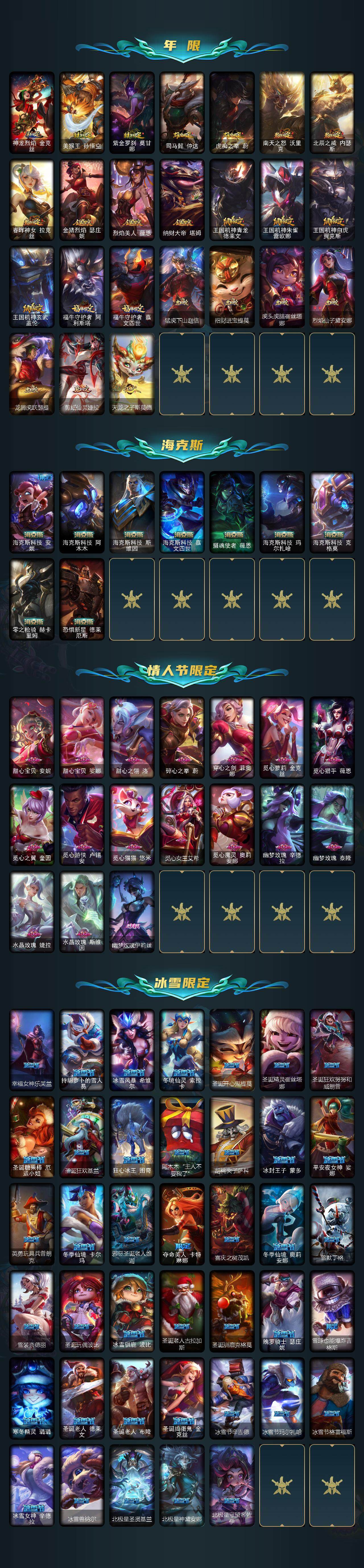 【年限皮肤】 龙的传人李青 古琴余韵娑娜 碧玉之牙卡西奥佩娅 神龙之翼库奇 替父从军花木兰 广寒仙子嫦娥 神龙烈焰金克丝 美猴王孙悟空 紫金罗刹莫甘娜 司马懿仲达 虎痴之拳蔚 南天之怒沃里克 北辰之威内瑟斯 春晖神女拉克丝 金猪烈焰瑟庄妮 烈焰美人薇恩 纳财大帝塔姆 王国机神青龙德莱文 王国机神朱雀蕾欧娜 王国机神白虎贾克斯 王国机神玄武盖伦 福牛守护者阿利斯塔 福牛守护者嘉文四世