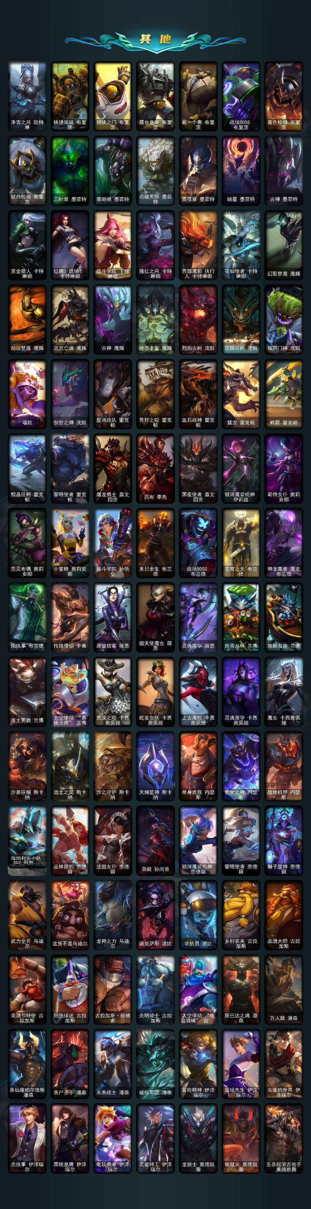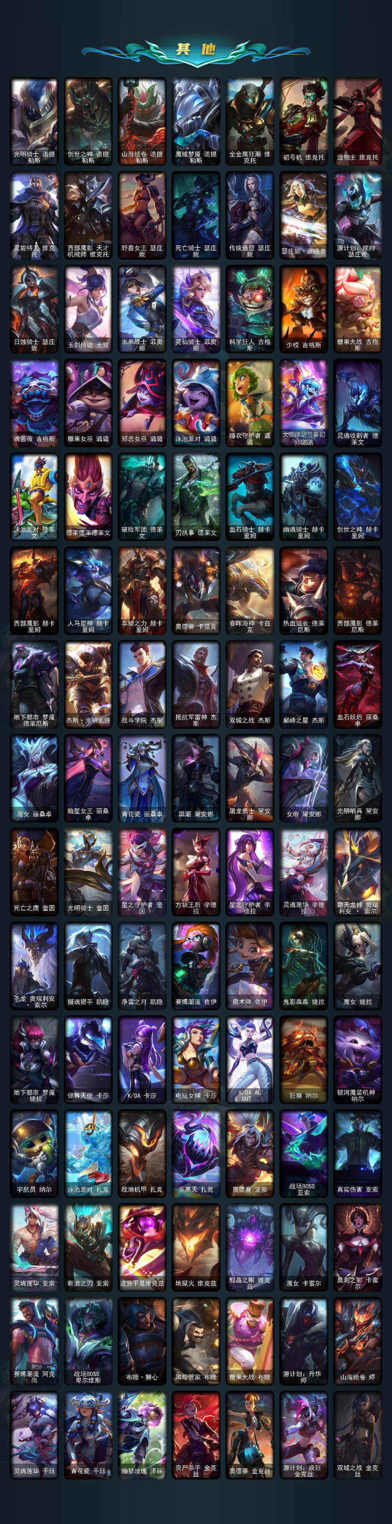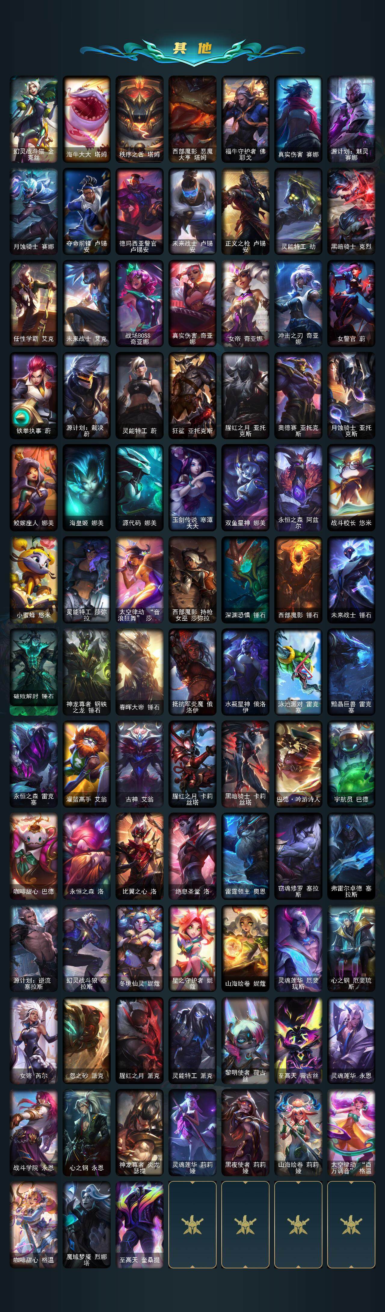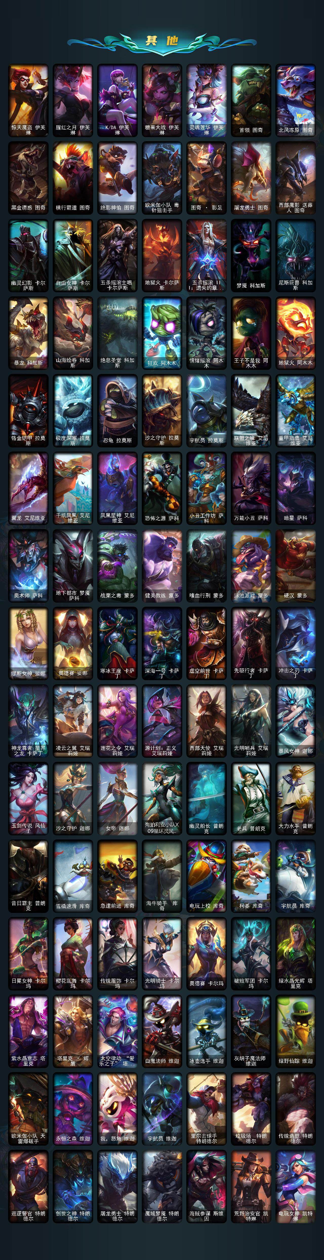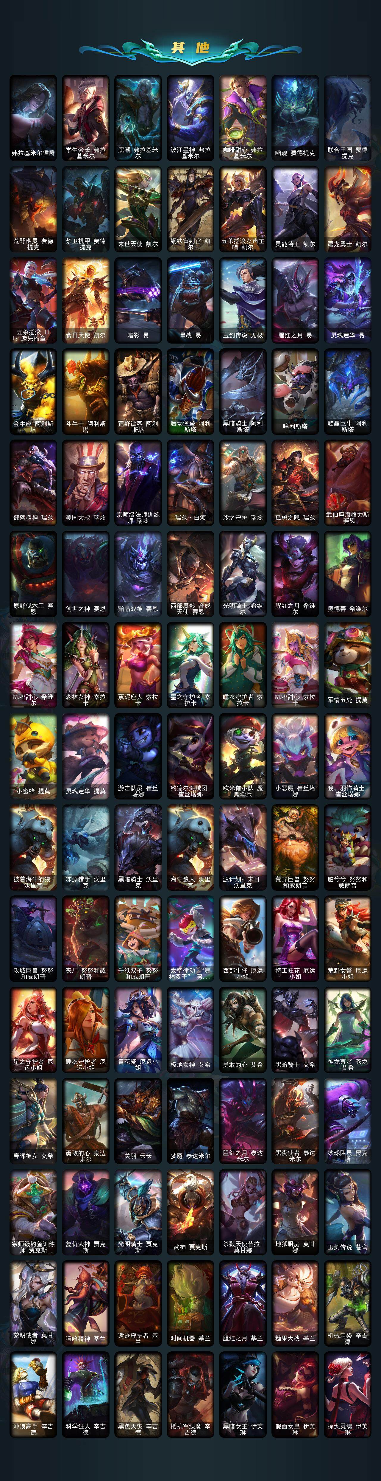 【年限皮肤】 龙的传人李青 古琴余韵娑娜 碧玉之牙卡西奥佩娅 神龙之翼库奇 替父从军花木兰 广寒仙子嫦娥 神龙烈焰金克丝 美猴王孙悟空 紫金罗刹莫甘娜 司马懿仲达 虎痴之拳蔚 南天之怒沃里克 北辰之威内瑟斯 春晖神女拉克丝 金猪烈焰瑟庄妮 烈焰美人薇恩 纳财大帝塔姆 王国机神青龙德莱文 王国机神朱雀蕾欧娜 王国机神白虎贾克斯 王国机神玄武盖伦 福牛守护者阿利斯塔 福牛守护者嘉文四世