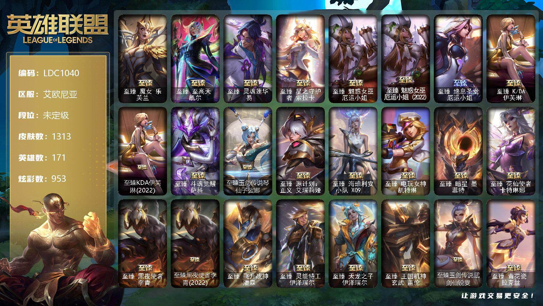 【LDC1040】171英雄/1313皮肤/6终极/73神话/247限定/32臻彩/953炫彩/116传说/215史诗/未定级账号等级:705/雪花头像/至爱的鹿头像/爱意绵绵头像/爱情之歌头像/觅心游侠卢锡安头像/银河魔装机神安妮头像/至臻魔女乐芙兰/至臻至高天凯尔/至臻灵魂莲华易/至臻星之守护者索拉卡/至臻魅惑女巫厄运小姐/至臻魅惑女巫厄运小姐(2022)/至臻绝息圣堂厄运小姐/至臻KDA伊芙琳/至臻KDA伊芙琳(2022)/至臻斗魂觉醒萨科/至臻玉剑传说琴仙子娑娜/至臻源计划正义艾瑞莉娅/至臻海珀利安小队X09星环灵风迦娜/至臻电玩女神凯特琳/至臻暗星墨菲特/至臻花仙使者卡特琳娜/至臻黑夜使者李青/至臻黑夜使者李青(2022)/至臻飞升战神潘森/至臻灵能特工伊泽瑞尔/至臻天龙之子伊泽瑞尔/至臻王国机神玄武盖伦/至臻玉剑传说武剑仙锐雯/至臻青花瓷拉克丝/至臻KDA阿狸/至臻KDA阿狸(2022)/至臻绒毛菲兹/至臻绒毛菲兹(2022)/至臻神龙尊者均衡之龙沃利贝尔/至臻福牛守护者菲奥娜/至臻太空律动节奏幻师璐璐/至臻女帝黛安娜/至臻黑夜使者凯隐/至臻奥术师佐伊/至臻魔女婕拉/至臻KDA卡莎/至臻KDAALLOUT卡莎/至臻KDA卡莎(2022)/至臻海之歌萨勒芬妮/至臻墨之影武者亚索/至臻北极星钢影卡蜜尔/至臻幻灵战斗猫金克丝/至臻未来战士卢锡安/至臻源计划阴劫/至臻星之守护者艾克/至臻真实伤害奇亚娜/至臻真实伤害奇亚娜(2022)/至臻腥红之月亚托克斯/至臻腥红之月亚托克斯(2022)/至臻DRX亚托克斯/至臻太空律动魔音海妖娜美/至臻神龙尊者比翼之龙洛/至臻神凰行者烈羽焰凰霞/至臻源计划逆流塞拉斯/至臻星之守护者妮蔻/至臻神龙尊者炎龙瑟提/至臻魂蔷薇烈娜塔/龙的传人李青飞龙在天/皓彩霓裳嫦娥/天龙之子卡莎飞龙乘云/无畏骑士瑟庄妮赤子初心/玉剑传说无极白虎/墨之影武者亚索金墨耀影/冠军之刃锐雯2016凯旋圣装/雾雨之刃锐雯/灵魂莲华永恩春晓/觅心萝莉金克丝是心动啊/玉剑传说无影竞星/玉剑传说舞剑仙承影/源计划毁灭派克幻灭/西部魔影卢锡安贝利尔之怠/源计划联合艾希红莲之弓/西部天使赛娜贝利尔之怠/山海绘卷科加斯朱红/泳池派对奥莉安娜优雅珠光鲸/星之守护者霞烈羽/屠龙勇士布隆金瞳龙首之盾/魔女阿卡丽虚荣/魔女阿狸饕餮/净雪之月莫甘娜冬虹/红莲之刃锐雯/心之钢伊泽瑞尔天纵才华/龙的传人李青/古琴余韵娑娜/你看见过我的熊猫吗安妮/碧玉之牙卡西奥佩娅/神龙之翼库奇/替父从军花木兰/广寒仙子嫦娥/神龙烈焰金克丝/美猴王孙悟空/紫金罗刹莫甘娜/司马懿仲达/虎痴之拳蔚/南天之怒沃里克/北辰之威内瑟斯/春晖神女拉克丝/金猪烈焰瑟庄妮/烈焰美人薇恩/纳财大帝塔姆/王国机神青龙德莱文/王国机神朱雀蕾欧娜/王国机神白虎贾克斯/王国机神玄武盖伦/福牛守护者阿利斯塔/福牛守护者嘉文四世/猛虎下山赵信/招财进宝提莫/虎头虎脑崔丝塔娜/烈焰仙子黛安娜/龙腾虎跃瑟提/剪纸仙灵婕拉/天龙之子斯莫德/海克斯科技安妮/海克斯科技阿木木/海克斯科技斯维因/海克斯科技嘉文四世/摄魂使者薇恩/海克斯科技玛尔扎哈/海克斯科技克格莫/零之枪骑赫卡里姆/恐惧新星德莱厄斯/甜心宝贝安妮/甜心宝贝娑娜/甜心之翎洛/碎心之拳蔚/穿心之剑菲奥娜/觅心萝莉金克丝/觅心猎手薇恩/觅心之翼奎因/觅心游侠卢锡安/觅心猫猫悠米/觅心女王艾希/觅心魔灵奥莉安娜/幽梦玫瑰辛德拉/幽梦玫瑰泰隆/水晶玫瑰婕拉/水晶玫瑰斯维因/幽梦玫瑰伊莉丝/幸福女神乐芙兰/持胡萝卜的雪人易/冰雪风暴希维尔/冬境仙灵索拉卡/圣诞开心鬼提莫/圣诞精灵崔丝塔娜/圣诞狂欢努努和威朗普/圣诞糖果棒厄运小姐/圣诞狂欢基兰/狂心冰王图奇/阿木木“主人不要我了”/胡桃夹子萨科/冰封王子蒙多/平安夜女神娑娜/英勇玩具兵普朗克/冬季仙境卡尔玛/邪恶圣诞老人维迦/夺命美人卡特琳娜/喜庆之树茂凯/冬季仙境奥莉安娜/雪默丁格/雪装奈德丽/圣诞玩偶波比/冰雪驯鹿波比/圣诞老人古拉加斯/圣诞驯鹿克格莫/魄罗骑士瑟庄妮/雪球也能爆炸吉格斯/寒冬精灵璐璐/圣诞老人德莱文/圣诞老人布隆/圣诞捣蛋鬼金克丝/冰雪节辛吉德/冰雪节玛尔扎哈/冰雪节格雷福斯/冰雪女神辛德拉/冰雪兽纳尔/北极星圣贤基兰/北极星神黛安娜/北极星守望者佐伊/大元素使拉克丝/DJ娑娜/KDAALLOUT萨勒芬妮独立音乐人/灵魂守卫乌迪尔/十周年纪念安妮/源代码乐芙兰/新卧虎藏龙贾克斯/灰烬征服者潘森/水晶圣骑塔莉娅/灰烬杀手塞拉斯/灰烬骑士派克/至臻真实伤害奇亚娜2022/至臻黑夜使者李青2022/至臻KDA阿狸2022/至臻KDA卡莎2022/至臻KDA伊芙琳2022/至臻魅惑女巫厄运小姐2022/至臻绒毛菲兹2022/至臻腥红之月亚托克斯2022/至臻玉剑传说琴仙子/至臻玉剑传说武剑仙/冰原核弹古拉加斯/青年瑞兹/卧虎藏龙贾克斯/舞会公主安妮/诺斯费拉图弗拉基米尔/养蜂人辛吉德/创星之灵璐璐/地底世界崔斯特/冠军典狱长锤石/冠军之血希瓦娜/冠军之矛卡莉丝塔/冠军之刃锐雯2016/冠军之箭艾希/冠军掠夺者卡兹克/冠军之志瑞兹/2021全球总决赛嘉文四世/2022全球总决赛阿兹尔/Fnatic古拉加斯/Fnatic迦娜/Fnatic嘉文四世/Fnatic卡尔萨斯/Fnatic库奇/暗杀星奥莉安娜/暗杀星蒙多/暗杀星努努和威朗普/暗杀星慎/暗杀星伊泽瑞尔/SKTT1贾克斯/SKTT1劫/SKTT1婕拉/SKTT1李青/SKTT1薇恩/SSW辛吉德/SSW图奇/SSW雷恩加尔/SSW锤石/SKTT1阿利斯塔/SKTT1阿兹尔/SKTT1卡莉丝塔/SKTT1雷克顿/SKTT1瑞兹/SKTT