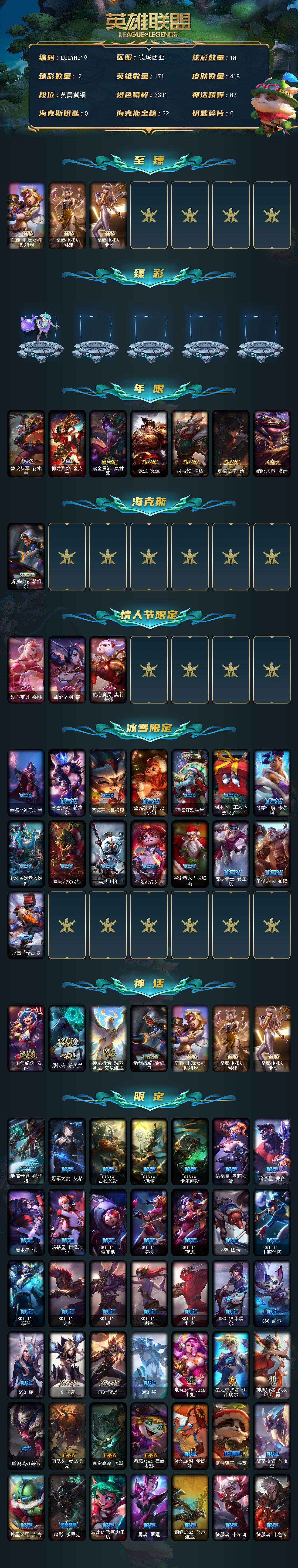 【LOLYH319】171英雄/418皮肤/7神话/72限定/2臻彩/18炫彩/30传说/104史诗/青铜账号等级:348/至臻电玩女神凯特琳/至臻KDA阿狸/至臻KDA卡莎/幻灵战斗蝠薇恩梦幻强袭/泳池派对奥莉安娜优雅珠光鲸/替父从军花木兰/神龙烈焰金克丝/紫金罗刹莫甘娜/张辽文远/司马懿仲达/虎痴之拳蔚/纳财大帝塔姆/新创战纪希维尔/甜心宝贝娑娜/甜心之羽霞/觅心魔灵奥莉安娜/幸福女神乐芙兰/冰雪风暴希维尔/圣诞开心鬼提莫/圣诞糖果棒厄运小姐/圣诞狂欢基兰/阿木木“主人不要我了”/冬季仙境卡尔玛/邪恶圣诞老人维迦/喜庆之树茂凯/雪默丁格/圣诞玩偶波比/圣诞老人古拉加斯/魄罗骑士瑟庄妮/圣诞老人布隆/冰雪节辛吉德/十周年纪念安妮/源代码乐芙兰/神凰行者瑞羽圣凰艾尼维亚/地底世界崔斯特/冠军之箭艾希/Fnatic古拉加斯/Fnatic迦娜/Fnatic卡尔萨斯/暗杀星奥莉安娜/暗杀星蒙多/暗杀星慎/暗杀星伊泽瑞尔/SKTT1贾克斯/SKTT1婕拉/SKTT1薇恩/SSW图奇/SKTT1卡莉丝塔/SKTT1瑞兹/SKTT1艾克/SKTT1烬/SKTT1娜美/SKTT1扎克/SSG伊泽瑞尔/SSG纳尔/SSG霞/iG卡莎/FPX薇恩/DWG烬/电玩女神厄运小姐/星之守护者伊泽瑞尔/神凰行者烈羽焰凰霞/暗裔英雄盖伦/南瓜头费德提克/鬼影森森茂凯/魅惑女巫崔丝塔娜/泳池派对蕾欧娜/密林猎手提莫/破空枪骑孙悟空/外星装甲库奇/暗影沃里克/波比的巧克力工坊/勇者阿狸/钢铁之翼艾尼维亚/征服者卡尔玛/征服者韦鲁斯/制胜金球拉莫斯/防暴天使凯尔/惊悚派对费德提克/警用试作体K9内瑟斯/克格汪/魔幻卡牌崔斯特/战地机甲厄加特/大天使长米迦勒凯尔/源计划林易/烈焰雄心崔丝塔娜/源计划联合艾希/西部天使艾希/绅士科加斯/双重冰晶艾尼维亚/黯晶凤凰艾尼维亚/律政大亨蒙多/电玩女神娑娜/女主播迦娜/红色男爵库奇/女警狙击凯特琳/陆地王者4WD布里茨/太空律动猫猫布里和里茨/冰川巨兽墨菲特/丧尸布兰德/神拳李青/第三类接触黑默丁格/炼狱魔犬内瑟斯/钢铁军团盖伦/日蚀骑士蕾欧娜/星之守护者拉克丝/星之守护者阿狸/宇航员诺提勒斯/女校长菲奥娜/暗星尊烬/西部魔影卢锡安/冰霜烈焰安妮/特战先锋赵信/翼骑统领赵信/摄魂男爵弗拉基米尔/铁钩船长费德提克/圣光审判凯尔/侍魂易/铁血剑豪易/地狱火阿利斯塔/钢铁之心希维尔/月光女神阿忒弥斯索拉卡/源代码索拉卡/兔宝宝提莫/熊猫提莫/火箭达人崔丝塔娜/女船长厄运小姐/紫晶射手艾希/国王泰达米尔/百夫长贾克斯/黑色荆棘莫甘娜/死神卡尔萨斯/小小骑士阿木木/殇之机器人阿木木/全金属狂潮拉莫斯/贵族血统萨科/战争血统蒙多/海克斯科技迦娜/寒冰女皇迦娜/血石诅咒塔里克/北领前线斯维因/绝代智将斯维因/抵抗军天使凯特琳/铁血狙击手凯特琳/黑曜石守护者墨菲特/海贼魅影卡特琳娜/沙漠风暴卡特琳娜/符文战神雷克顿/枯萎之壤雷克顿/凯旋英雄嘉文四世/腥红之月伊莉丝/灵骨工匠奥莉安娜/暗星奥莉安娜/三昧真火孙悟空/V字仇杀者布兰德/至高之拳李青/地下拳王李青/屠龙勇士薇恩/苍穹之光薇恩/深海妖姬卡西奥佩娅/战地机甲斯卡纳/生化博士黑默丁格/艳后奈德丽/铁血猎手奈德丽/四神之力乌迪尔/军神战甲波比/血色之锤波比/星之守护者波比/钢铁意志潘森/刺客信条凯南/孤高游侠盖伦/源计划山蕾欧娜/刺客信条锐雯/侏罗纪化石克格莫/战地机甲克格莫/腥红之月鬼武者慎/战国大名慎/奥术光辉拉克丝/星际迷航拉克丝/沙之守护泽拉斯/钢之逆鳞希瓦娜/骸骨之爪希瓦娜/银河魔装机神希瓦娜/虚空海灵菲兹/白色死神韦鲁斯/暗星韦鲁斯/源计划火菲奥娜/绞肉机刽子手德莱文/生化骑士德莱厄斯/全金属狂潮杰斯/天启骑士杰斯/血羽凤凰奎因/勇敢的心奎因/亚特兰蒂斯辛德拉/灰烬领主奥瑞利安索尔/邪恶魔人扎克/源计划风亚索/屠龙勇士布隆/猛虎布隆/西部牛仔烬/腥红之月烬/黯焰双魂千珏/银河魔装机神千珏/职业杀手卢锡安/冲击之刃劫/霓虹杀拳蔚/炼狱魔女蔚/仲裁圣骑亚托克斯/河水之灵娜美/星际之门阿兹尔/幽冥领主阿兹尔/腥红之月锤石/糖果之王艾翁/永恒之森巴德/暮星之羽霞/星空之门内瑟斯/孤胆英豪嘉文四世/霹雳游侠弗拉基米尔/创意工坊黑默丁格/亮丽女神希维尔/烈焰猛士奥拉夫/法老阿木木/钢铁终结者赛恩/魔导绅士维迦/深潜蛙人古拉加斯/幽蓝梦魇加里奥/风执事加里奥/逆转裁判崔斯特/未来战士崔斯特/皇家守卫赵信/赵云子龙/秘密特工赵信/深渊巨蟹厄加特/电锯狂人厄加特/社会名流乐芙兰/弗拉基米尔伯爵/学生会长弗拉基米尔/联合王国费德提克/荒野幽灵费德提克/末世天使凯尔/五杀摇滚女声主唱凯尔/灵能特工凯尔/星战易/灵魂莲华易/金牛座阿利斯塔/后场堡垒阿利斯塔/黑暗骑士阿利斯塔/部落精神瑞兹/宗师级法师训练师瑞兹/瑞兹白须/武仙座海格力斯赛恩/光明骑士希维尔/蕉泥座人索拉卡/星之守护者索拉卡/游击队员崔丝塔娜/约德尔海贼团崔丝塔娜/小恶魔崔丝塔娜/披着海牛的狼沃里克/黑暗骑士沃里克/海牛狼人沃里克/荒野巨兽努努和威朗普/脏兮兮努努和威朗普/攻城巨兽努努和威朗普/西部牛仔厄运小姐/特工狂花厄运小姐/荒野女警厄运小姐/极地女神艾希/勇敢的心艾希/黑暗骑士艾希/勇敢的心泰达米尔/冰球队员贾克斯/复仇武神贾克斯/地狱厨房莫甘娜/玉剑传说苍鸾/嘻哈精神基兰/时间机器基兰/机械污染辛吉德/冲浪高手辛吉德/科学狂人辛吉德/假面女皇伊芙琳/探戈灵魂伊芙琳/糖果