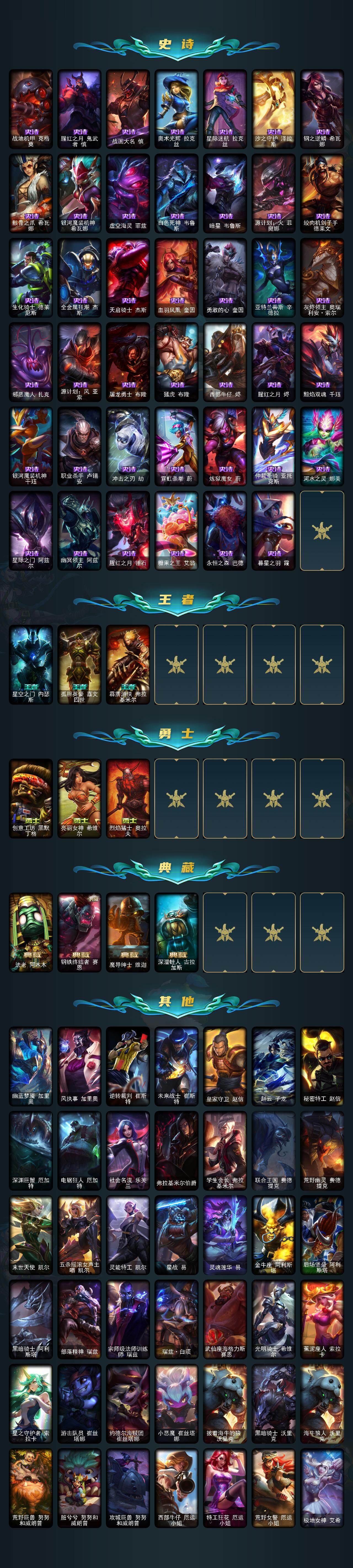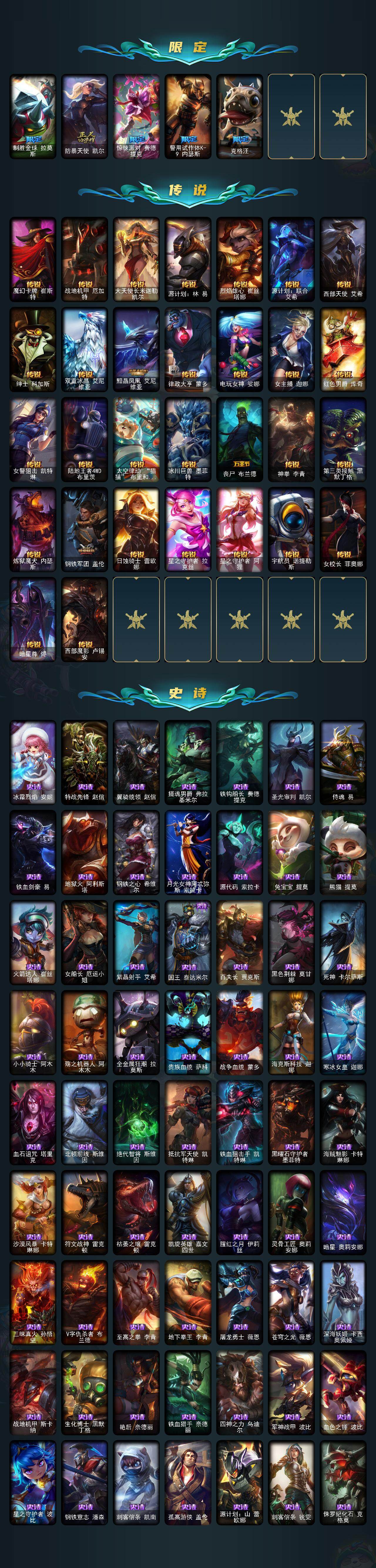 【年限皮肤】 替父从军花木兰 神龙烈焰金克丝 紫金罗刹莫甘娜 张辽文远 司马懿仲达 虎痴之拳蔚 纳财大帝塔姆