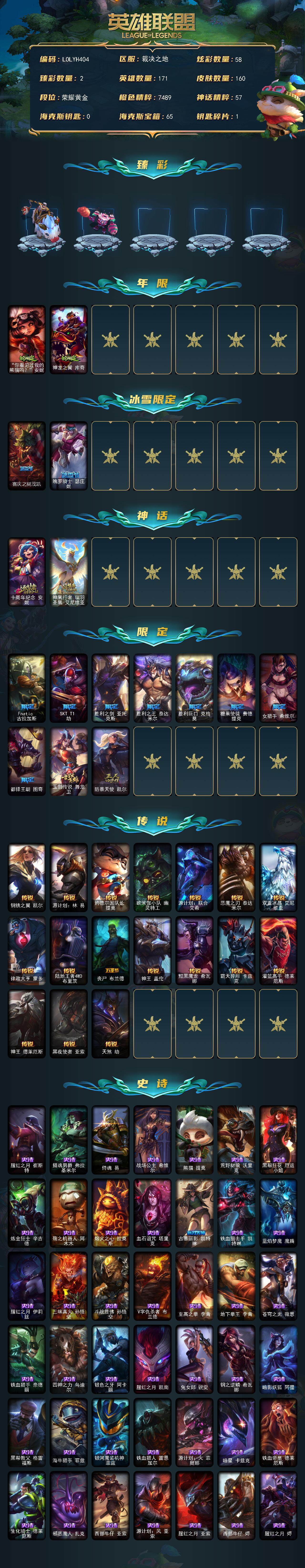 【LOLYH404】171英雄/160皮肤/2神话/14限定/2臻彩/58炫彩/17传说/47史诗/黄金账号等级:301/无畏骑士瑟庄妮赤子初心/可爱可爱粉红红布里茨/你看见过我的熊猫吗安妮/神龙之翼库奇/喜庆之树茂凯/魄罗骑士瑟庄妮/十周年纪念安妮/神凰行者瑞羽圣凰艾尼维亚/Fnatic古拉加斯/SKTT1劫/胜利之剑亚托克斯/胜利之王泰达米尔/胜利巨口克格莫/糖果使徒费德提克/女猎手希维尔/都铎王朝图奇/玉剑传说舞龙卫/防暴天使凯尔/钢铁之翼凯尔/源计划林易/约德尔国队长提莫/欧米伽小队幽灵特工/源计划联合艾希/恶魔之刃泰达米尔/双重冰晶艾尼维亚/律政大亨蒙多/陆地王者4WD布里茨/丧尸布兰德/神王盖伦/黯黑魔龙希瓦娜/霸天异形卡兹克/灌篮高手德莱厄斯/神王德莱厄斯/黑夜使者亚索/天煞劫/腥红之月崔斯特/摄魂男爵弗拉基米尔/侍魂易/战场公主希维尔/熊猫提莫/荒野豺狼沃里克/黑帮狂花厄运小姐/炼金狂士辛吉德/殇之机器人阿木木/熔火之心拉莫斯/血石诅咒塔里克/古墓丽影凯特琳/铁血狙击手凯特琳/蓝焰梦魔魔腾/腥红之月伊莉丝/三昧真火孙悟空/斗战胜佛孙悟空/V字仇杀者布兰德/至高之拳李青/地下拳王李青/苍穹之光薇恩/铁血猎手奈德丽/四神之力乌迪尔/银色之牙阿卡丽/腥红之月凯南/兔女郎锐雯/钢之逆鳞希瓦娜/暗影妖狐阿狸/黑帮教父格雷福斯/海牛猎手菲兹/银河魔装机神菲兹/铁血猎人雷恩加尔/源计划火菲奥娜/暗星卡兹克/铁血帝皇德莱厄斯/生化骑士德莱厄斯/邪恶魔人扎克/西部牛仔亚索/源计划风亚索/腥红之月亚索/西部牛仔烬/腥红之月烬/源计划雷卢锡安/冲击之刃劫/源计划阴劫/炼狱魔女蔚/霸天剑魔亚托克斯/孤胆英豪嘉文四世/战地之王加里奥/冰河时代奥拉夫/小红帽安妮/银河魔装机神安妮/幽蓝梦魇加里奥/风执事加里奥/探戈灵魂崔斯特/皇家守卫赵信/社会名流乐芙兰/弗拉基米尔伯爵/末世天使凯尔/暗影易/玉剑传说无极/腥红之月易/美国大叔瑞兹/宗师级法师训练师瑞兹/攻城巨兽努努和威朗普/丧尸努努和威朗普/关羽云长/复仇武神贾克斯/光明骑士贾克斯/机械污染辛吉德/假面女皇伊芙琳/惊天魔盗伊芙琳/首领图奇/五杀摇滚主唱卡尔萨斯/情绪摇滚阿木木/铬金铠甲拉莫斯/恐怖之源萨科/万能小丑萨科/泳池派对蒙多/虚空前世卡萨丁/先驱行者卡萨丁/莲花之令艾瑞莉娅/急速前进库奇/灰胡子魔法师维迦/荒野治安官凯特琳/铁锈斑斑布里茨/戴一个表布里茨/暮色枪骑布里茨/银白枪骑布里茨/石破天惊墨菲特/红牌退场卡特琳娜/烈焰古树茂凯/荒野之咬雷克顿/猛龙雷克顿/鳄霸雷克顿/吕布奉先/传统僧侣李青/黑夜使者李青/摩登骇客薇恩/猎天使魔女薇恩/武力全开乌迪尔/英仙座珀尔修斯潘森/光执事伊泽瑞尔/五杀摇滚吉他手莫德凯撒/奈落之炎阿卡丽/银色闪电凯南/空手道凯南/海上霸主盖伦/刺客信条泰隆/毛毛虫克格莫/雷霆领主沃利贝尔/坚韧不屈沃利贝尔/全金属狂潮维克托/造物主维克托/野兽女王瑟庄妮/玉剑传说无双/科学狂人吉格斯/糖果女巫璐璐/创世之神赫卡里姆/热血班长德莱厄斯/弹幕天使卡莎/战场BOSS亚索/真实伤害亚索/灵能特工劫/灌篮高手艾翁/窃魂修罗塞拉斯/怨之砂派克【按大区: 电信】