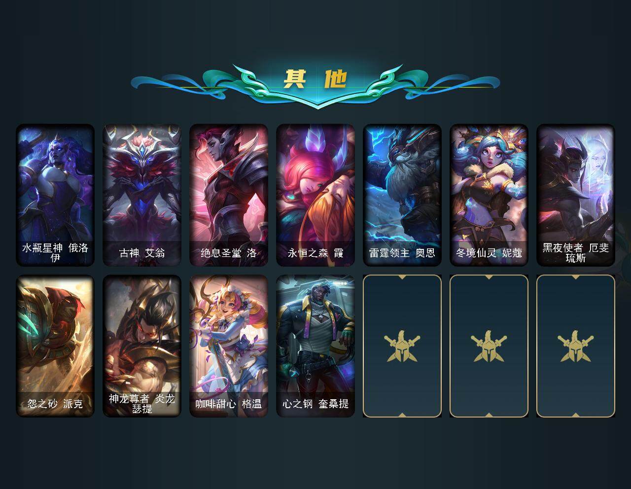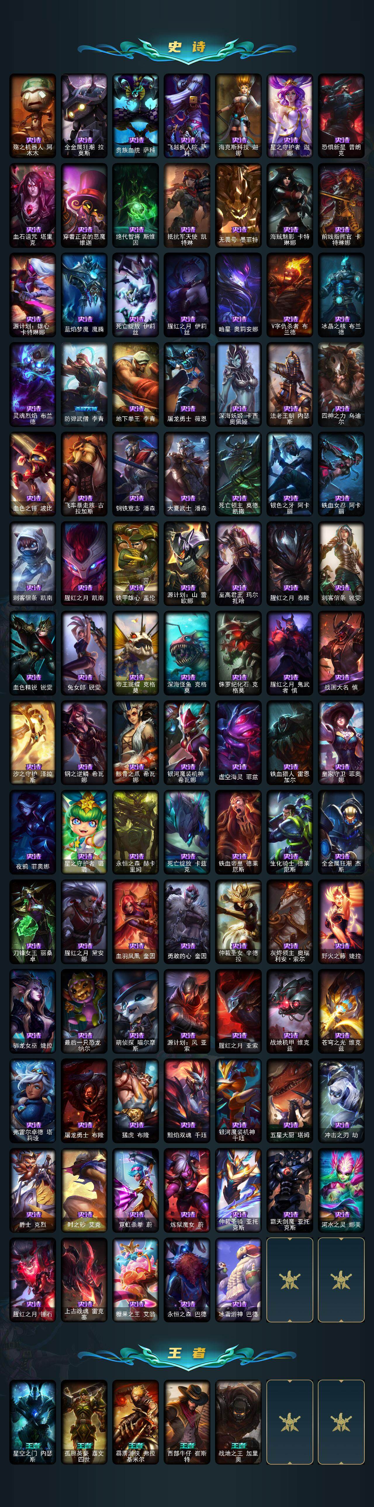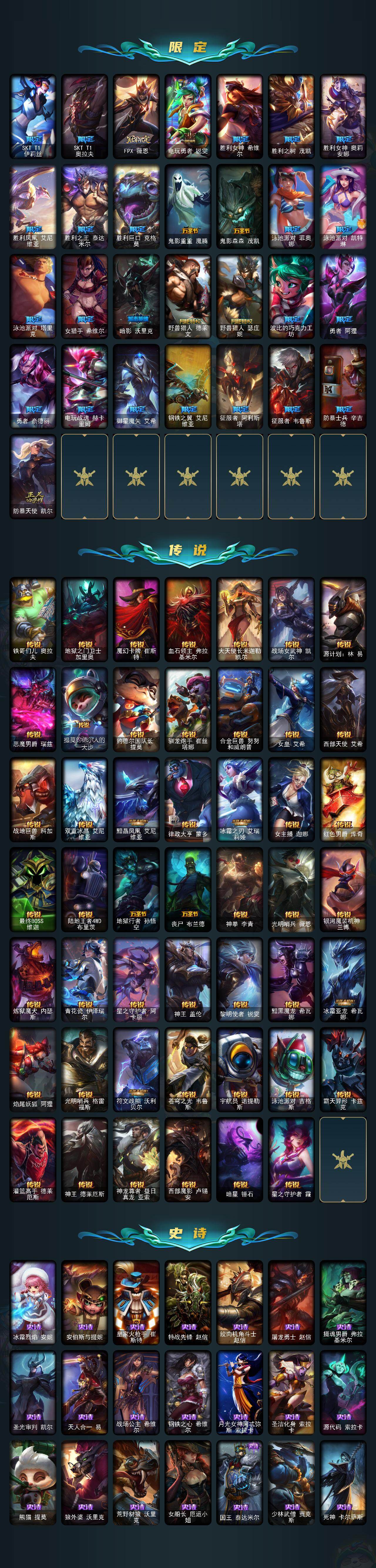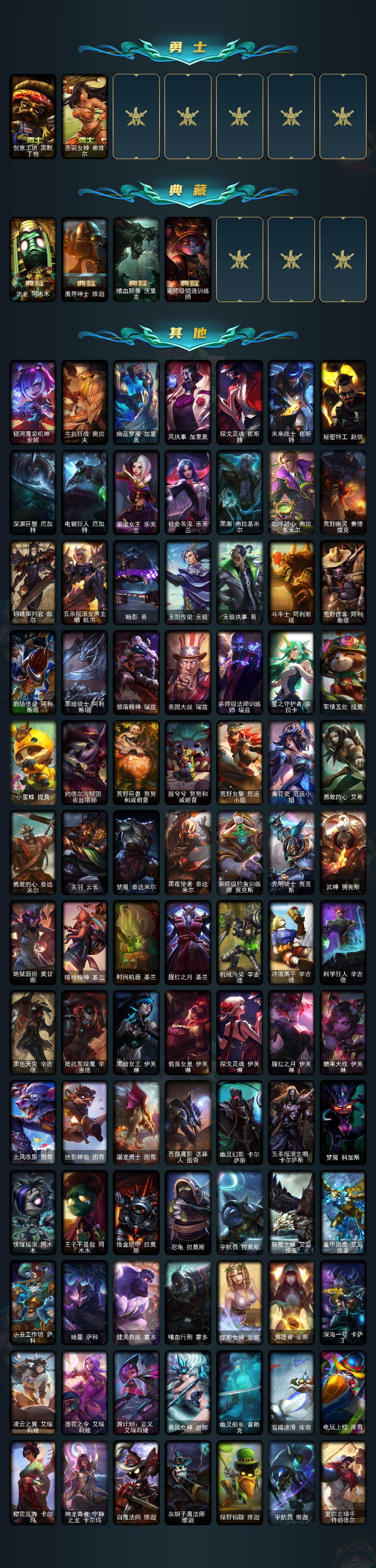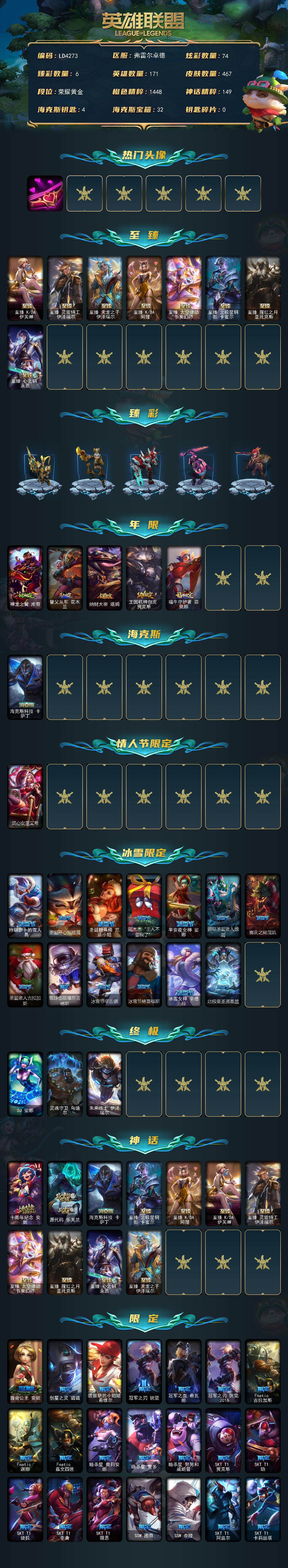 【LD4273】171英雄/467皮肤/3终极/11神话/69限定/6臻彩/74炫彩/48传说/117史诗/黄金/爱情之歌头像/至臻KDA伊芙琳/至臻灵能特工伊泽瑞尔/至臻天龙之子伊泽瑞尔/至臻KDA阿狸/至臻太空律动节奏幻师璐璐/至臻北极星钢影卡蜜尔/至臻腥红之月亚托克斯/至臻心之钢永恩/吕布奉先炫金战神/替父从军花木兰炫金龙刃/冠军之刃锐雯2016凯旋圣装/霸天战士雷恩加尔星啸天火/源计划毁灭派克幻灭/黎明使者锐雯黑夜使者/神龙之翼库奇/替父从军花木兰/纳财大帝塔姆/王国机神白虎贾克斯/福牛守护者菲奥娜/海克斯科技卡萨丁/觅心女王艾希/持胡萝卜的雪人易/圣诞开心鬼提莫/圣诞糖果棒厄运小姐/阿木木“主人不要我了”/平安夜女神娑娜/邪恶圣诞老人维迦/喜庆之树茂凯/圣诞老人古拉加斯/雪球也能爆炸吉格斯/冰雪节辛吉德/冰雪节格雷福斯/冰雪女神辛德拉/北极星圣贤基兰/DJ娑娜/灵魂守卫乌迪尔/未来战士伊泽瑞尔/十周年纪念安妮/源代码乐芙兰/舞会公主安妮/创星之灵璐璐/送披萨的小姐姐希维尔/冠军之刃锐雯/冠军之血希瓦娜/冠军之刃锐雯2016/Fnatic古拉加斯/Fnatic迦娜/Fnatic嘉文四世/暗杀星奥莉安娜/暗杀星蒙多/暗杀星努努和威朗普/SKTT1贾克斯/SKTT1劫/SKTT1婕拉/SKTT1李青/SKTT1薇恩/SSW图奇/SSW泰隆/SKTT1阿兹尔/SKTT1卡莉丝塔/SKTT1伊莉丝/SKTT1奥拉夫/FPX薇恩/电玩勇者锐雯/胜利女神希维尔/胜利之树茂凯/胜利女神奥莉安娜/胜利凤凰艾尼维亚/胜利之王泰达米尔/胜利巨口克格莫/鬼影重重魔腾/鬼影森森茂凯/泳池派对菲奥娜/泳池派对凯特琳/泳池派对塔里克/女猎手希维尔/暗影沃里克/野兽猎人德莱文/野兽猎人瑟庄妮/波比的巧克力工坊/勇者阿狸/勇者奈德丽/电玩战魂赫卡里姆/御星魔矢艾希/钢铁之翼艾尼维亚/征服者阿利斯塔/征服者韦鲁斯/防暴士兵辛吉德/防暴天使凯尔/铁哥们儿奥拉夫/地狱之门卫士加里奥/魔幻卡牌崔斯特/血石领主弗拉基米尔/大天使长米迦勒凯尔/战场女武神凯尔/源计划林易/恶魔男爵瑞兹/提莫约德尔人的一大步/约德尔国队长提莫/驯龙炮手崔丝塔娜/合金巨兽努努和威朗普/女皇艾希/西部天使艾希/战地巨兽科加斯/双重冰晶艾尼维亚/黯晶凤凰艾尼维亚/律政大亨蒙多/冰霜之刃艾瑞莉娅/女主播迦娜/红色男爵库奇/最终BOSS维迦/陆地王者4WD布里茨/地狱行者孙悟空/丧尸布兰德/神拳李青/光明哨兵薇恩/银河魔装机神兰博/炼狱魔犬内瑟斯/青花瓷伊泽瑞尔/星之守护者阿卡丽/神王盖伦/黎明使者锐雯/黯黑魔龙希瓦娜/冰霜亚龙希瓦娜/焰尾妖狐阿狸/光明哨兵格雷福斯/符文战熊沃利贝尔/苍穹之光韦鲁斯/宇航员诺提勒斯/泳池派对吉格斯/霸天异形卡兹克/灌篮高手德莱厄斯/神王德莱厄斯/神龙尊者昼日真龙亚索/西部魔影卢锡安/暗星锤石/星之守护者霞/冰霜烈焰安妮/安伯斯与提妮/皇家火枪手崔斯特/特战先锋赵信/绞肉机角斗士赵信/屠龙勇士赵信/摄魂男爵弗拉基米尔/圣光审判凯尔/天人合一易/战场公主希维尔/钢铁之心希维尔/月光女神阿忒弥斯索拉卡/圣洁化身索拉卡/源代码索拉卡/熊猫提莫/狼外婆沃里克/荒野豺狼沃里克/女船长厄运小姐/国王泰达米尔/少林武僧贾克斯/死神卡尔萨斯/殇之机器人阿木木/全金属狂潮拉莫斯/贵族血统萨科/飞越疯人院萨科/海克斯科技迦娜/星之守护者迦娜/恐惧新星普朗克/血石诅咒塔里克/穿着正装的恶魔维迦/绝代智将斯维因/抵抗军天使凯特琳/无畏号墨菲特/海贼魅影卡特琳娜/前线指挥官卡特琳娜/源计划雄心卡特琳娜/蓝焰梦魔魔腾/死亡绽放伊莉丝/腥红之月伊莉丝/暗星奥莉安娜/V字仇杀者布兰德/冰晶之核布兰德/灵魂烈焰布兰德/防弹武僧李青/地下拳王李青/屠龙勇士薇恩/深海妖姬卡西奥佩娅/法老王朝内瑟斯/四神之力乌迪尔/血色之锤波比/飞车暴走族古拉加斯/钢铁意志潘森/大夏武士潘森/死亡领主莫德凯撒/银色之牙阿卡丽/铁血女忍阿卡丽/刺客信条凯南/腥红之月凯南/铁甲雄心盖伦/源计划山蕾欧娜/至高君王玛尔扎哈/腥红之月泰隆/刺客信条锐雯/血色精锐锐雯/兔女郎锐雯/帝王斑蝶克格莫/深海怪鱼克格莫/侏罗纪化石克格莫/腥红之月鬼武者慎/战国大名慎/沙之守护泽拉斯/钢之逆鳞希瓦娜/骸骨之爪希瓦娜/银河魔装机神希瓦娜/虚空海灵菲兹/铁血猎人雷恩加尔/皇家守卫菲奥娜/夜鸦菲奥娜/星之守护者璐璐/永恒之森赫卡里姆/死亡绽放卡兹克/铁血帝皇德莱厄斯/生化骑士德莱厄斯/全金属狂潮杰斯/刀锋女王丽桑卓/腥红之月黛安娜/血羽凤凰奎因/勇敢的心奎因/仲裁圣女辛德拉/灰烬领主奥瑞利安索尔/野火之藤婕拉/驯龙女巫婕拉/最后一只恐龙纳尔/萌侦探喵尔摩斯/源计划风亚索/腥红之月亚索/战地机甲维克兹/苍穹之光维克兹/弗雷尔卓德塔莉垭/屠龙勇士布隆/猛虎布隆/黯焰双魂千珏/银河魔装机神千珏/五星大厨塔姆/冲击之刃劫/爵士克烈/时之砂艾克/霓虹杀拳蔚/炼狱魔女蔚/仲裁圣骑亚托克斯/霸天剑魔亚托克斯/河水之灵娜美/腥红之月锤石/上古战魂雷克塞/糖果之王艾翁/永恒之森巴德/冰雪游神巴德/星空之门内瑟斯/孤胆英豪嘉文四世/霹雳游侠弗拉基米尔/西部牛仔崔斯特/战地之王加里奥/创意工坊黑默丁格/亮丽女神希维尔/法老阿木木/魔导绅士维迦/嗜血狂暴沃里克/宗师级锻造训练师/银河魔装机神安妮/牛扒狂战奥拉夫/幽蓝梦魇加里奥/风执事加里奥/探戈灵魂崔斯特/未来战士崔斯特/秘密特工赵信/深渊巨