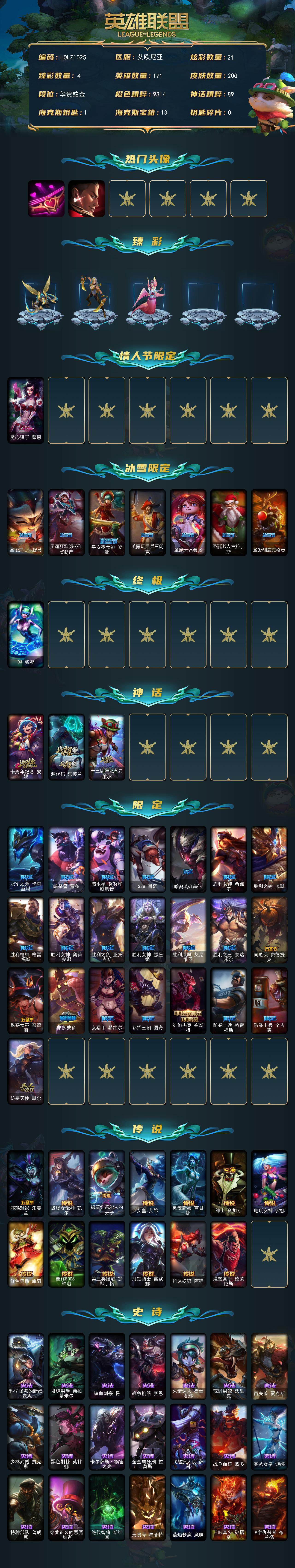 【LOLZ1025】171英雄/200皮肤/1终极/3神话/30限定/4臻彩/21炫彩/13传说/52史诗/铂金/爱情之歌头像/觅心游侠卢锡安头像/冠军掠夺者卡兹克凯旋圣装/闭月之颜貂蝉炫金莲华/玉剑传说苍鸾丁香/魔女阿卡丽虚荣/觅心猎手薇恩/圣诞开心鬼提莫/圣诞狂欢努努和威朗普/平安夜女神娑娜/英勇玩具兵普朗克/圣诞玩偶波比/圣诞老人古拉加斯/圣诞驯鹿克格莫/DJ娑娜/十周年纪念安妮/源代码乐芙兰/十五周年纪念希维尔/冠军之矛卡莉丝塔/暗杀星蒙多/暗杀星努努和威朗普/SSW图奇/暗裔英雄盖伦/胜利女神希维尔/胜利之树茂凯/胜利枪神格雷福斯/胜利女神奥莉安娜/胜利之剑亚托克斯/胜利女神瑟庄妮/胜利凤凰艾尼维亚/胜利之王泰达米尔/南瓜头费德提克/魅惑女巫奈德丽/蒙多蒙多/女猎手希维尔/都铎王朝图奇/红桃杰克崔斯特/防暴士兵格雷福斯/防暴士兵辛吉德/防暴天使凯尔/邪鸦魅影乐芙兰/战场女武神凯尔/提莫约德尔人的一大步/女皇艾希/鬼魂新娘莫甘娜/绅士科加斯/电玩女神娑娜/红色男爵库奇/最终BOSS维迦/第三类接触黑默丁格/月蚀骑士蕾欧娜/焰尾妖狐阿狸/灌篮高手德莱厄斯/科学怪熊的新娘安妮/摄魂男爵弗拉基米尔/铁血剑豪易/战争机器赛恩/火箭达人崔丝塔娜/荒野豺狼沃里克/百夫长贾克斯/少林武僧贾克斯/黑色荆棘莫甘娜/卡尔萨斯祸害之光/全金属狂潮拉莫斯/飞越疯人院萨科/战争血统蒙多/寒冰女皇迦娜/特种部队普朗克/穿着正装的恶魔维迦/绝代智将斯维因/无畏号墨菲特/蓝焰梦魔魔腾/三昧真火孙悟空/V字仇杀者布兰德/地下拳王李青/生化博士黑默丁格/法老王朝内瑟斯/铁血猎手奈德丽/四神之力乌迪尔/血色之锤波比/钢铁烈阳蕾欧娜/至高君王玛尔扎哈/血色精锐锐雯/侏罗纪化石克格莫/腥红之月鬼武者慎/星际迷航拉克丝/沙之守护泽拉斯/铁血猎人雷恩加尔/永恒之森赫卡里姆/沙之守护卡兹克/刀锋女王丽桑卓/暗黑女武神黛安娜/血羽凤凰奎因/勇敢的心奎因/亚特兰蒂斯辛德拉/最后一只恐龙纳尔/源计划风亚索/源代码卡蜜尔/冲击之刃劫/源计划阴劫/炼狱魔女蔚/星际之门阿兹尔/腥红之月锤石/糖果之王艾翁/永恒之森巴德/霹雳游侠弗拉基米尔/拆弹专家黑默丁格/创意工坊黑默丁格/亮丽女神希维尔/烈焰猛士奥拉夫/嗜血狂暴沃里克/黑暗骑士奥拉夫/风执事加里奥/地狱火加里奥/探戈灵魂崔斯特/逆转裁判崔斯特/秘密特工赵信/弗拉基米尔侯爵/联合王国费德提克/末世天使凯尔/美国大叔瑞兹/武仙座海格力斯赛恩/原野伐木工赛恩/灵魂莲华崔丝塔娜/源计划末日沃里克/勇敢的心艾希/宗师级钓鱼训练师贾克斯/黑色天灾辛吉德/北风冻原图奇/横行霸道图奇/情绪摇滚阿木木/王子不是我阿木木/沙之守护拉莫斯/泳池派对蒙多/虚空前世卡萨丁/莲花之令艾瑞莉娅/暴风女神迦娜/沙之守护迦娜/幽灵船长普朗克/老兵普朗克/急速前进库奇/樱花乱舞卡尔玛/里尔击球手特朗德尔/垃圾场特朗德尔/海贼参谋斯维因/双城之战凯特琳/戴一个表布里茨/暮色枪骑布里茨/赏金猎人卡特琳娜/劫掠梦魇魔腾/烈焰古树茂凯/喵凯/猛龙雷克顿/星之守护者奥莉安娜/摩登骇客薇恩/热带丛林兰博/沙暴巨蝎斯卡纳/沙之守护斯卡纳/天蝎星神斯卡纳/银河魔装机神奈德丽/这货不是乌迪尔/宇航员波比/乡村农夫古拉加斯/品酒大师古拉加斯/美酒节特使古拉加斯/英仙座珀尔修斯潘森/足球先生伊泽瑞尔/黑桃皇牌伊泽瑞尔/龙骑士莫德凯撒/梅花国王莫德凯撒/蜂刺阿卡丽/奈落之炎阿卡丽/空手道凯南/瓦尔基里蕾欧娜/神圣守卫蕾欧娜/未来战士锐雯/索诺拉沙虫克格莫/主治医师慎/失落大陆菲兹/苔原猎手菲兹/雷霆领主沃利贝尔/光明哨兵雷恩加尔/韦鲁斯迅箭/造物主维克托/野兽女王瑟庄妮/科学狂人吉格斯/少校吉格斯/灵魂收割者德莱文/人马星神赫卡里姆/西部魔影德莱厄斯/双城之战杰斯/血石妖后丽桑卓/黑潮黛安娜/死亡之鹰奎因/弹幕天使卡莎/KDAALLOUT卡莎/银河魔装机神纳尔/布隆狮心/双城之战金克丝/海牛大大塔姆/正义之枪卢锡安/野火首领艾克/双城之战蔚/源代码娜美/玉剑传说寒潭夭夭/宇航员巴德【按大区: 电信】