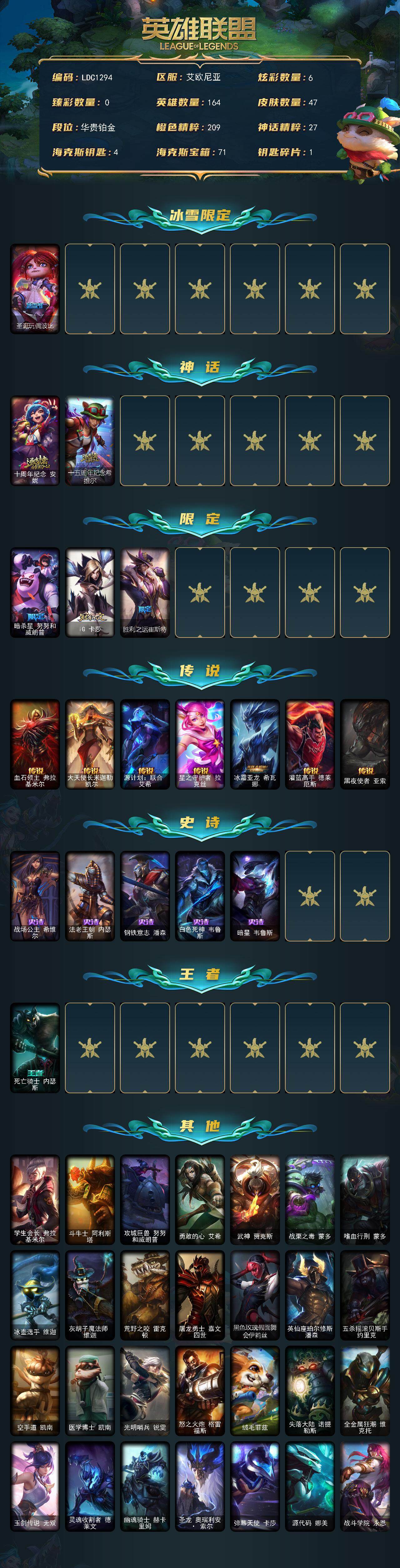 【LDC1294】164英雄/47皮肤/2神话/4限定/6炫彩/7传说/5史诗/铂金账号等级:235/圣诞玩偶波比/十周年纪念安妮/十五周年纪念希维尔/暗杀星努努和威朗普/iG卡莎/胜利之运崔斯特/血石领主弗拉基米尔/大天使长米迦勒凯尔/源计划联合艾希/星之守护者拉克丝/冰霜亚龙希瓦娜/灌篮高手德莱厄斯/黑夜使者亚索/战场公主希维尔/法老王朝内瑟斯/钢铁意志潘森/白色死神韦鲁斯/暗星韦鲁斯/死亡骑士内瑟斯/学生会长弗拉基米尔/斗牛士阿利斯塔/攻城巨兽努努和威朗普/勇敢的心艾希/武神贾克斯/战栗之毒蒙多/嗜血行刑蒙多/冰壶选手维迦/灰胡子魔法师维迦/荒野之咬雷克顿/屠龙勇士嘉文四世/黑色玫瑰假面舞会伊莉丝/英仙座珀尔修斯潘森/五杀摇滚贝斯手约里克/空手道凯南/医学博士凯南/光明哨兵锐雯/怒之火炮格雷福斯/绒毛菲兹/失落大陆诺提勒斯/全金属狂潮维克托/玉剑传说无双/灵魂收割者德莱文/幽魂骑士赫卡里姆/圣龙奥瑞利安索尔/弹幕天使卡莎/源代码娜美/战斗学院永恩【按大区: 电信】