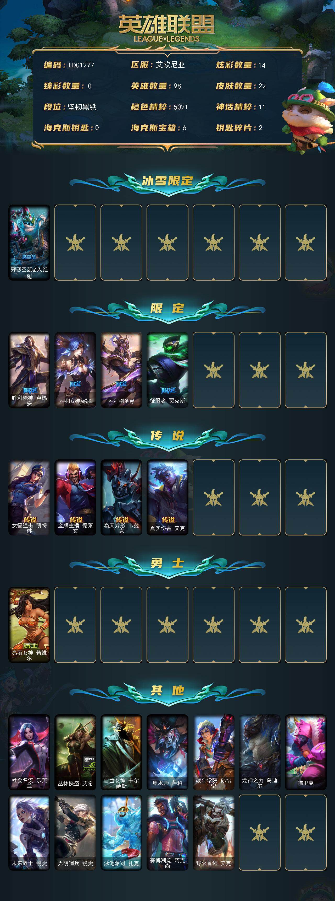 【LDC1277】98英雄/22皮肤/5限定/14炫彩/4传说/未定级账号等级:113/邪恶圣诞老人维迦/胜利枪神卢锡安/胜利女神娑娜/胜利剑圣易/征服者贾克斯/女警狙击凯特琳/金牌主播德莱文/霸天异形卡兹克/真实伤害艾克/亮丽女神希维尔/社会名流乐芙兰/丛林侠盗艾希/自由女神卡尔萨斯/奥术师萨科/战斗学院孙悟空/龙神之力乌迪尔/喵里克/未来战士锐雯/光明哨兵锐雯/泳池派对扎克/赛博潮流阿克尚/野火首领艾克【按大区: 电信】