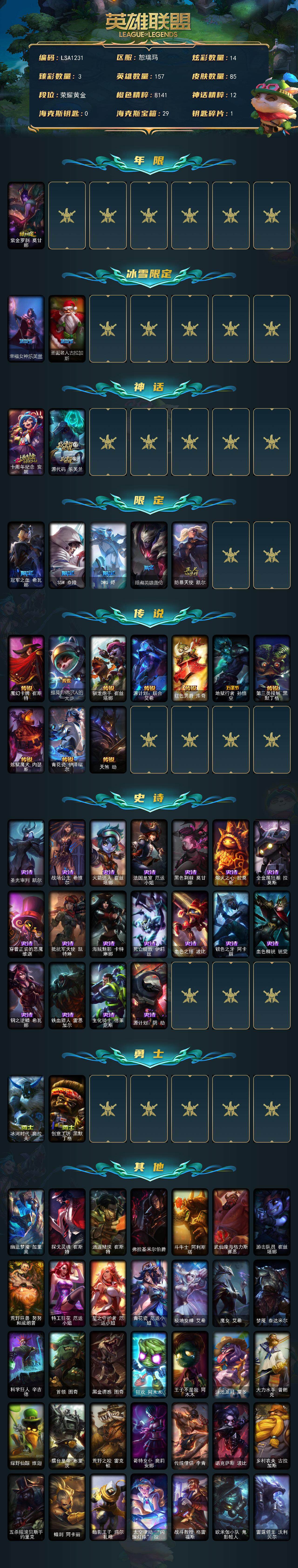 【LSA1231】157英雄/85皮肤/2神话/8限定/3臻彩/14炫彩/10传说/18史诗/黄金账号等级:161/水晶玫瑰迦娜甜蜜花蕾/红莲之刃锐雯/预知之眼亚索不怠/紫金罗刹莫甘娜/幸福女神乐芙兰/圣诞老人古拉加斯/十周年纪念安妮/源代码乐芙兰/冠军之血希瓦娜/SSW泰隆/DWG烬/暗裔英雄盖伦/防暴天使凯尔/魔幻卡牌崔斯特/提莫约德尔人的一大步/驯龙炮手崔丝塔娜/源计划联合艾希/红色男爵库奇/地狱行者孙悟空/第三类接触黑默丁格/炼狱魔犬内瑟斯/青花瓷伊泽瑞尔/天煞劫/圣光审判凯尔/战场公主希维尔/火箭达人崔丝塔娜/法国皇室厄运小姐/黑色荆棘莫甘娜/熔火之心拉莫斯/全金属狂潮拉莫斯/穿着正装的恶魔维迦/抵抗军天使凯特琳/海贼魅影卡特琳娜/死亡绽放伊莉丝/血色之锤波比/银色之牙阿卡丽/血色精锐锐雯/钢之逆鳞希瓦娜/铁血猎人雷恩加尔/生化骑士德莱厄斯/源计划阴劫/冰河时代奥拉夫/创意工坊黑默丁格/幽蓝梦魇加里奥/探戈灵魂崔斯特/逍遥赌侠崔斯特/弗拉基米尔伯爵/斗牛士阿利斯塔/武仙座海格力斯赛恩/游击队员崔丝塔娜/荒野巨兽努努和威朗普/特工狂花厄运小姐/星之守护者厄运小姐/青花瓷厄运小姐/极地女神艾希/魔女艾希/梦魇泰达米尔/科学狂人辛吉德/首领图奇/黑金诱惑图奇/狂欢阿木木/王子不是我阿木木/泳池派对蒙多/大力水手普朗克/绿野仙踪维迦/擂台皇帝布里茨/荒野之咬雷克顿/哥特女仆奥莉安娜/传统僧侣李青/诺克萨斯波比/乡村农夫古拉加斯/五杀摇滚贝斯手约里克/蜂刺阿卡丽/暗影王子玛尔扎哈/太空律动闪耀灯球拉克丝/战斗教授格雷福斯/欧米伽小队鬼影蛙人/雷霆领主沃利贝尔/坚韧不屈沃利贝尔/夜魔水晶韦鲁斯/日蚀骑士瑟庄妮/血石骑士赫卡里姆/幽魂骑士赫卡里姆/KDAALLOUT卡莎/战地机甲扎克/星之守护者赛娜/泳池派对雷克塞/黑暗骑士卡莉丝塔【按大区: 网通】