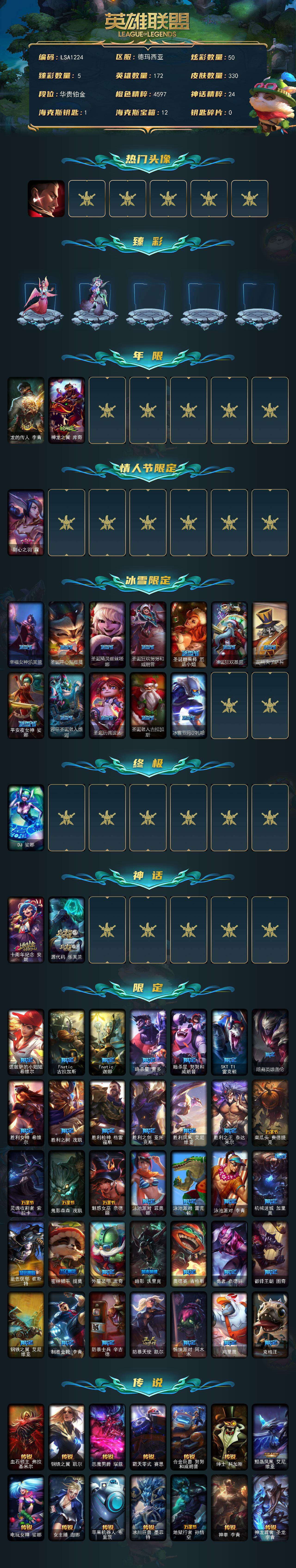 【LSA1224】172英雄/330皮肤/1终极/2神话/50限定/5臻彩/50炫彩/24传说/88史诗/铂金账号等级:465/觅心游侠卢锡安头像/天龙之子卡莎飞龙乘云/玉剑传说苍鸾丁香/魔女阿卡丽虚荣/净雪之月莫甘娜冬虹/花仙子崔丝塔娜蓝闪/龙的传人李青/神龙之翼库奇/甜心之羽霞/幸福女神乐芙兰/圣诞开心鬼提莫/圣诞精灵崔丝塔娜/圣诞狂欢努努和威朗普/圣诞糖果棒厄运小姐/圣诞狂欢基兰/胡桃夹子萨科/平安夜女神娑娜/邪恶圣诞老人维迦/圣诞玩偶波比/圣诞老人古拉加斯/冰雪节玛尔扎哈/DJ娑娜/十周年纪念安妮/源代码乐芙兰/送披萨的小姐姐希维尔/Fnatic古拉加斯/Fnatic迦娜/暗杀星蒙多/暗杀星努努和威朗普/SKTT1雷克顿/暗裔英雄盖伦/胜利女神希维尔/胜利之树茂凯/胜利枪神格雷福斯/胜利之剑亚托克斯/胜利凤凰艾尼维亚/胜利之王泰达米尔/南瓜头费德提克/灵魂收割者索拉卡/鬼影森森茂凯/魅惑女巫奈德丽/泳池派对菲奥娜/泳池派对雷克顿/泳池派对李青/机械迷城加里奥/蓝色忧郁崔斯特/密林猎手提莫/外星装甲库奇/暗影沃里克/奥德赛吉格斯/勇者奈德丽/都铎王朝图奇/钢铁之翼艾尼维亚/制胜金靴李青/防暴士兵辛吉德/防暴天使凯尔/惊悚派对阿木木/鸡里奥/克格汪/血石领主弗拉基米尔/钢铁之翼凯尔/恶魔男爵瑞兹/霸天零式赛恩/合金巨兽努努和威朗普/绅士科加斯/黯晶凤凰艾尼维亚/电玩女神娑娜/女主播迦娜/苹果机器人布里茨/冰川巨兽墨菲特/地狱行者孙悟空/神拳李青/神龙尊者圣龙李青/源计划净化薇恩/第三类接触黑默丁格/星之守护者拉克丝/黯黑魔龙希瓦娜/焰尾妖狐阿狸/偶像歌手阿狸/符文战熊沃利贝尔/女校长菲奥娜/灌篮高手德莱厄斯/海魔至尊亚托克斯/科学怪熊的新娘安妮/绞肉机角斗士赵信/重生之沙费德提克/战争机器赛恩/战场公主希维尔/源代码索拉卡/熊猫提莫/狼外婆沃里克/荒野豺狼沃里克/国王泰达米尔/百夫长贾克斯/黑色荆棘莫甘娜/炼金狂士辛吉德/死神卡尔萨斯/小小骑士阿木木/熔火之心拉莫斯/贵族血统萨科/飞越疯人院萨科/战争血统蒙多/海克斯科技迦娜/寒冰女皇迦娜/穿着正装的恶魔维迦/北领前线斯维因/抵抗军天使凯特琳/铁血狙击手凯特琳/黑曜石守护者墨菲特/无畏号墨菲特/前线指挥官卡特琳娜/符文战神雷克顿/暗星嘉文四世/死亡绽放伊莉丝/V字仇杀者布兰德/冰晶之核布兰德/防弹武僧李青/至高之拳李青/地下拳王李青/屠龙勇士薇恩/深海妖姬卡西奥佩娅/生化博士黑默丁格/法老王朝内瑟斯/四神之力乌迪尔/军神战甲波比/飞车暴走族古拉加斯/大夏武士潘森/铁血女忍阿卡丽/铁甲雄心盖伦/钢铁烈阳蕾欧娜/至高君王玛尔扎哈/血色精锐锐雯/帝王斑蝶克格莫/深海怪鱼克格莫/腥红之月鬼武者慎/星际迷航拉克丝/沙之守护泽拉斯/钢之逆鳞希瓦娜/黑帮教父格雷福斯/海牛猎手菲兹/铁血猎人雷恩加尔/白色死神韦鲁斯/源计划火菲奥娜/永恒之森赫卡里姆/死亡绽放卡兹克/天启骑士杰斯/暗黑女武神黛安娜/无限烈焰黛安娜/血羽凤凰奎因/勇敢的心奎因/仲裁圣女辛德拉/灰烬领主奥瑞利安索尔/野火之藤婕拉/最后一只恐龙纳尔/萌侦探喵尔摩斯/邪恶魔人扎克/西部牛仔亚索/猛虎布隆/腥红之月烬/银河魔装机神千珏/黑帮狂花金克丝/五星大厨塔姆/冲击之刃劫/源计划阴劫/时之砂艾克/霓虹杀拳蔚/炼狱魔女蔚/霸天剑魔亚托克斯/河水之灵娜美/腥红之月锤石/上古战魂雷克塞/星空之门内瑟斯/孤胆英豪嘉文四世/死亡骑士内瑟斯/战地之王加里奥/拆弹专家黑默丁格/冰河时代奥拉夫/创意工坊黑默丁格/亮丽女神希维尔/烈焰猛士奥拉夫/法老阿木木/深潜蛙人古拉加斯/宗师级锻造训练师/黑暗骑士奥拉夫/幽蓝梦魇加里奥/风执事加里奥/探戈灵魂崔斯特/逆转裁判崔斯特/逍遥赌侠崔斯特/皇家守卫赵信/深渊巨蟹厄加特/电锯狂人厄加特/潮流女王乐芙兰/社会名流乐芙兰/弗拉基米尔伯爵/学生会长弗拉基米尔/联合王国费德提克/荒野幽灵费德提克/末世天使凯尔/暗影易/玉剑传说无极/斗牛士阿利斯塔/荒野镖客阿利斯塔/哞利斯塔/宗师级法师训练师瑞兹/武仙座海格力斯赛恩/原野伐木工赛恩/森林女神索拉卡/游击队员崔丝塔娜/约德尔海贼团崔丝塔娜/荒野巨兽努努和威朗普/脏兮兮努努和威朗普/攻城巨兽努努和威朗普/西部牛仔厄运小姐/破败军团厄运小姐/勇敢的心艾希/勇敢的心泰达米尔/复仇武神贾克斯/嘻哈精神基兰/机械污染辛吉德/科学狂人辛吉德/黑暗女王伊芙琳/惊天魔盗伊芙琳/首领图奇/黑金诱惑图奇/横行霸道图奇/绝影神偷图奇/自由女神卡尔萨斯/五杀摇滚主唱卡尔萨斯/暴龙科加斯/情绪摇滚阿木木/王子不是我阿木木/铬金铠甲拉莫斯/重甲猎鹰艾尼维亚/恐怖之源萨科/万能小丑萨科/战栗之毒蒙多/健美教练蒙多/深海一号卡萨丁/虚空前世卡萨丁/先驱行者卡萨丁/凌云之翼艾瑞莉娅/暴风女神迦娜/幽灵船长普朗克/老兵普朗克/日冕女神卡尔玛/樱花乱舞卡尔玛/绿水晶光辉塔里克/紫水晶意志塔里克/冰壶选手维迦/灰胡子魔法师维迦/绿野仙踪维迦/里尔击球手特朗德尔/垃圾场特朗德尔/传统造型特朗德尔/戴一个表布里茨/战场BOSS布里茨/珊瑚礁墨菲特/赏金猎人卡特琳娜/红牌退场卡特琳娜/幻影梦魔魔腾/劫掠梦魇魔腾/烈焰古树茂凯/荒野之咬雷克顿/鳄霸雷克顿/屠龙勇士嘉文四世/哥特女仆奥莉安娜/末日余生布兰德/战场BOSS布兰德/热带丛林兰博/独眼海盗兰博