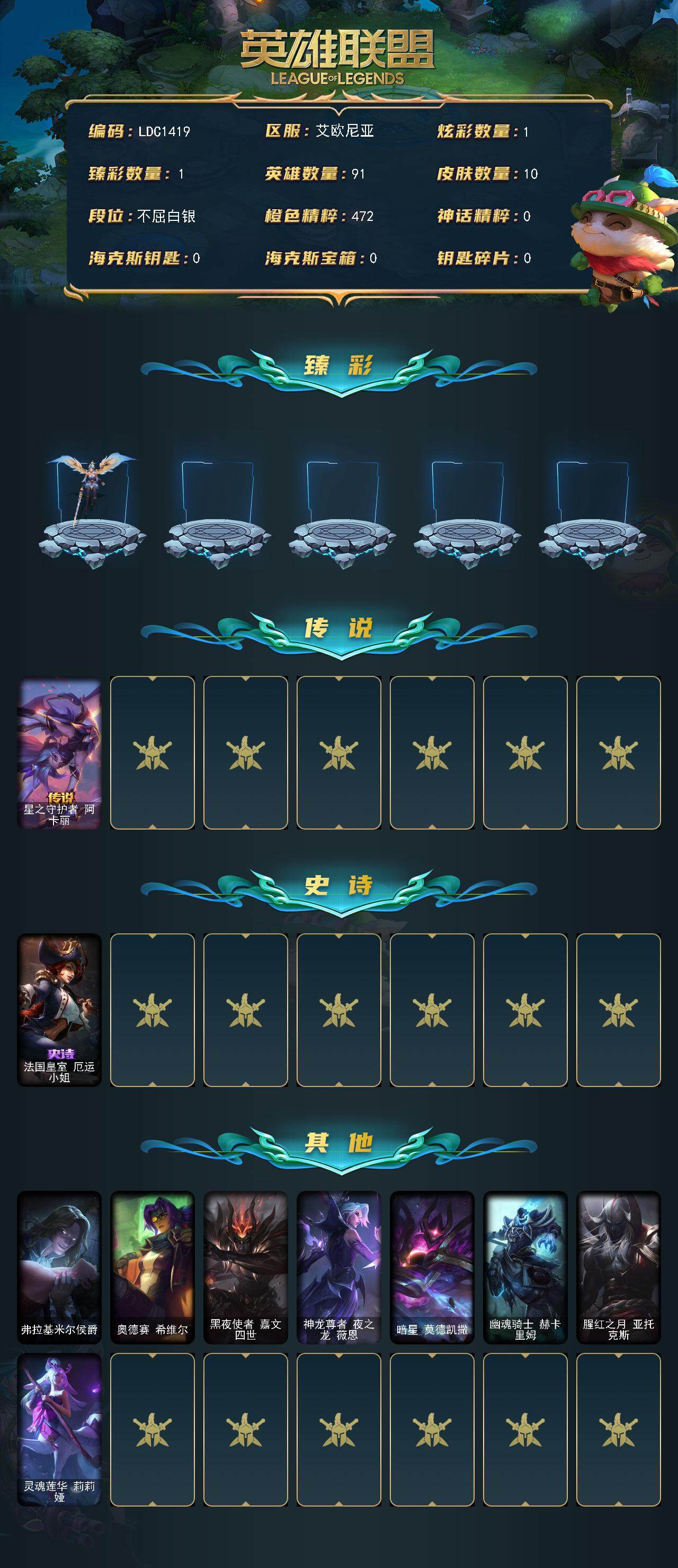 【LDC1419】91英雄/10皮肤/1臻彩/1炫彩/1传说/1史诗/白银账号等级:44/玉剑传说翼剑仙珠光/星之守护者阿卡丽/法国皇室厄运小姐/弗拉基米尔侯爵/奥德赛希维尔/黑夜使者嘉文四世/神龙尊者夜之龙薇恩/暗星莫德凯撒/幽魂骑士赫卡里姆/腥红之月亚托克斯/灵魂莲华莉莉娅【按大区: 电信】
