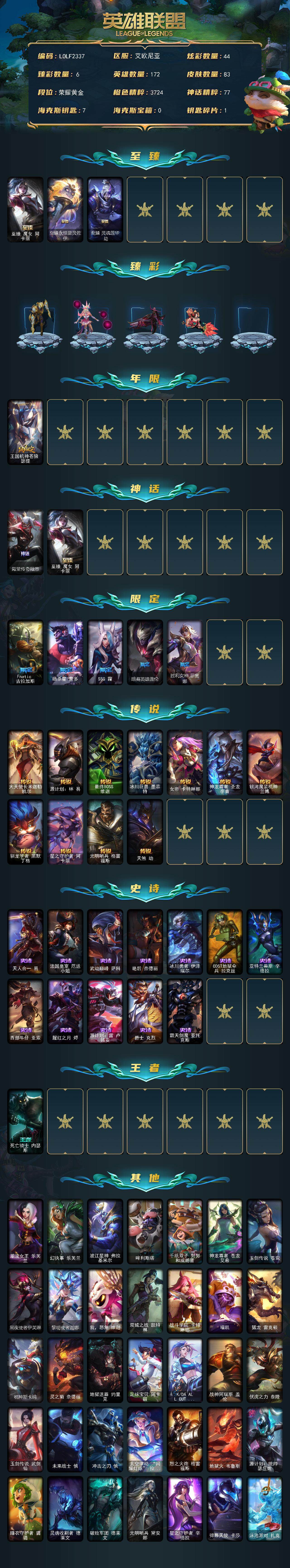 【LOLF2337】172英雄/83皮肤/4神话/6限定/6臻彩/44炫彩/11传说/12史诗/黄金/至臻魔女阿卡丽/至臻永恒星灵佐伊/至臻灵魂莲华劫/冠军之隐劫凯旋圣装/星之守护者娑娜未来之光/星之守护者辛德拉未来之光/西部天使赛娜贝利尔之怠/玉剑传说寒潭夭夭胭脂/王国机神苍狼瑟提/殿堂传奇薇恩/Fnatic古拉加斯/暗杀星蒙多/SSG霞/暗裔英雄盖伦/胜利女神菲奥娜/大天使长米迦勒凯尔/源计划林易/最终BOSS维迦/冰川巨兽墨菲特/女帝卡特琳娜/神龙尊者圣龙李青/银河魔装机神兰博/驯龙学者黑默丁格/星之守护者阿卡丽/光明哨兵格雷福斯/天煞劫/天人合一易/法国皇室厄运小姐/武动巅峰萨科/艳后奈德丽/冰川勇者伊泽瑞尔/ODST地狱伞兵拉克丝/亚特兰蒂斯辛德拉/西部牛仔亚索/腥红之月烬/源计划雷卢锡安/爵士克烈/霸天剑魔亚托克斯/死亡骑士内瑟斯/潮流女王乐芙兰/幻执事乐芙兰/波江星神弗拉基米尔/哞利斯塔/千纸双子努努和威朗普/神龙尊者苍龙艾希/玉剑传说苍鸾/黑夜使者伊芙琳/黎明使者迦娜/我怒角维迦/双城之战凯特琳/战斗学院卡特琳娜/喵凯/猛龙雷克顿/机神斯卡纳/灵之菊奈德丽/地狱送葬约里克/足球宝贝阿卡丽/KDAALLOUT阿卡丽/战神阿瑞斯盖伦/伏虎之力泰隆/玉剑传说武剑仙/未来战士慎/冲击之刃慎/太空律动闪耀灯球拉克丝/怒之火炮格雷福斯/地狱火韦鲁斯/源计划统帅瑟庄妮/睡衣守护者璐璐/灵魂收割者德莱文/破败军团德莱文/光明哨兵黛安娜/星之守护者辛德拉/弹幕天使卡莎/泳池派对扎克/女帝奇亚娜/月蚀骑士亚托克斯/海皇姬娜美/玉剑传说寒潭夭夭/未来战士锤石/破败解封锤石/泳池派对雷克塞/巴德吟游诗人/源计划逆流塞拉斯/小蜜蜂妮蔻/灵魂莲华厄斐琉斯/战斗学院永恩/墨之影武者永恩/神龙尊者炎龙瑟提【按大区: 电信】