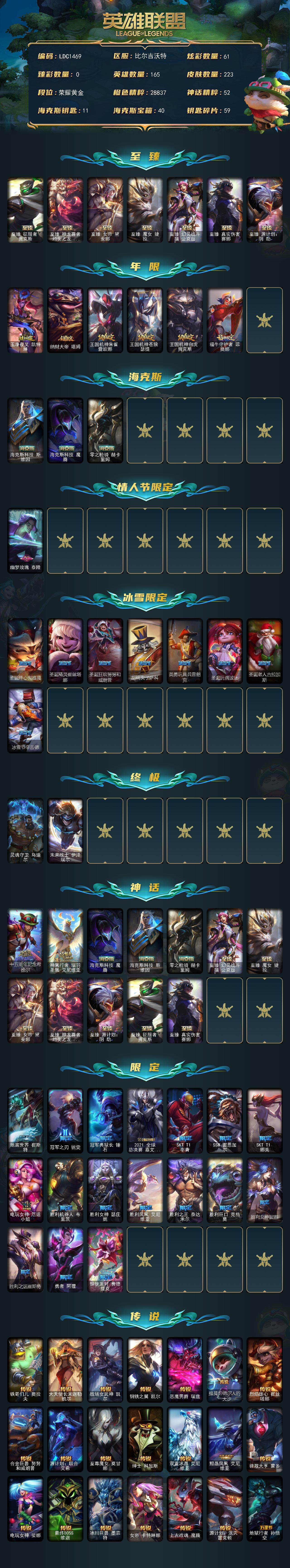 【LDC1469】165英雄/223皮肤/2终极/12神话/32限定/61炫彩/37传说/43史诗/黄金账号等级:385/至臻征服者贾克斯/至臻神龙尊者均衡之龙沃利贝尔/至臻女帝黛安娜/至臻魔女婕拉/至臻幻灵战斗猫金克丝/至臻真实伤害赛娜/至臻源计划阴劫/玉净夜叉凯特琳/纳财大帝塔姆/王国机神朱雀蕾欧娜/王国机神苍狼瑟提/王国机神白虎贾克斯/福牛守护者菲奥娜/海克斯科技斯维因/海克斯科技魔腾/零之枪骑赫卡里姆/幽梦玫瑰泰隆/圣诞开心鬼提莫/圣诞精灵崔丝塔娜/圣诞狂欢努努和威朗普/胡桃夹子萨科/英勇玩具兵普朗克/圣诞玩偶波比/圣诞老人古拉加斯/冰雪节辛吉德/灵魂守卫乌迪尔/未来战士伊泽瑞尔/十五周年纪念希维尔/神凰行者瑞羽圣凰艾尼维亚/地底世界崔斯特/冠军之刃锐雯/冠军典狱长锤石/2021全球总决赛嘉文四世/SKTT1李青/SSW雷恩加尔/SKTT1娜美/电玩女神厄运小姐/胜利机器人布里茨/胜利女神瑟庄妮/胜利凤凰艾尼维亚/胜利之王泰达米尔/胜利巨口克格莫/胜利女神娑娜/胜利之运崔斯特/勇者阿狸/惊悚派对费德提克/铁哥们儿奥拉夫/大天使长米迦勒凯尔/战场女武神凯尔/钢铁之翼凯尔/恶魔男爵瑞兹/提莫约德尔人的一大步/烈焰雄心崔丝塔娜/合金巨兽努努和威朗普/源计划联合艾希/至尊魔女莫甘娜/绅士科加斯/双重冰晶艾尼维亚/黯晶凤凰艾尼维亚/律政大亨蒙多/电玩女神娑娜/最终BOSS维迦/冰川巨兽墨菲特/女帝卡特琳娜/上古战魂魔腾/源计划泯灭雷克顿/地狱行者孙悟空/银河魔装机神兰博/屠龙勇士潘森/青花瓷伊泽瑞尔/源计划超体莫德凯撒/死亡骑士盖伦/神王盖伦/黯黑魔龙希瓦娜/偶像歌手阿狸/苍穹之光韦鲁斯/宇航员诺提勒斯/泳池派对吉格斯/霸天异形卡兹克/神王德莱厄斯/奥德赛凯隐/真实伤害艾克/灵魂莲华瑟提/屠龙勇士赵信/摄魂男爵弗拉基米尔/战场公主希维尔/源代码索拉卡/死神卡尔萨斯/侏罗纪化石科加斯/武动巅峰萨科/掠星魔刃卡萨丁/夜刃艾瑞莉娅/绝代智将斯维因/前线指挥官卡特琳娜/蓝焰梦魔魔腾/暗星嘉文四世/灵魂烈焰布兰德/战地机甲斯卡纳/血色之锤波比/飞车暴走族古拉加斯/大夏武士潘森/铁血女忍阿卡丽/钢铁烈阳蕾欧娜/腥红之月鬼武者慎/钢之逆鳞希瓦娜/银河魔装机神希瓦娜/虚空海灵菲兹/银河魔装机神菲兹/奥术大师吉格斯/永恒之森赫卡里姆/暗星卡兹克/生化骑士德莱厄斯/全金属狂潮杰斯/源代码丽桑卓/血羽凤凰奎因/最后一只恐龙纳尔/邪恶魔人扎克/源代码卡蜜尔/黯焰双魂千珏/银河魔装机神千珏/源计划阴劫/时之砂艾克/霓虹杀拳蔚/霸天剑魔亚托克斯/腥红之月锤石/虚空使者俄洛伊/霹雳游侠弗拉基米尔/战地之王加里奥/黑暗骑士奥拉夫/风执事加里奥/未来战士崔斯特/弗拉基米尔侯爵/玉剑传说无极/瑞兹白须/武仙座海格力斯赛恩/星之守护者索拉卡/欧米伽小队魔鬼伞兵/黑暗骑士沃里克/脏兮兮努努和威朗普/星之守护者厄运小姐/梦魇泰达米尔/光明骑士贾克斯/武神贾克斯/冲浪高手辛吉德/黑暗女王伊芙琳/KDAALLOUT伊芙琳/自由女神卡尔萨斯/王子不是我阿木木/铬金铠甲拉莫斯/泳池派对蒙多/奥德赛娑娜/莲花之令艾瑞莉娅/海牛骑手库奇/电玩上校库奇/日冕女神卡尔玛/紫水晶意志塔里克/里尔击球手特朗德尔/双城之战凯特琳/战场BOSS布里茨/绿茵门神茂凯/喵凯/猛龙雷克顿/鳄霸雷克顿/银河魔装机神伊莉丝/黑色玫瑰假面舞会伊莉丝/恶灵布偶奥莉安娜/战斗学院孙悟空/末日余生布兰德/战场BOSS布兰德/沙之守护斯卡纳/太空律动狗头内瑟斯/丛林猎豹奈德丽/银河魔装机神奈德丽/这货不是乌迪尔/龙神之力乌迪尔/丧尸杀手潘森/黑桃皇牌伊泽瑞尔/电玩勇者伊泽瑞尔/梅花国王莫德凯撒/苍穹之光约里克/足球宝贝阿卡丽/银色闪电凯南/医学博士凯南/小蜜蜂玛尔扎哈/荣誉使者玛尔扎哈/未来战士锐雯/小蜜蜂克格莫/炎爆慎/主治医师慎/战斗学院拉克丝/无情重炮格雷福斯/战斗教授格雷福斯/失落大陆菲兹/兔宝宝菲兹/雷霆领主沃利贝尔/雷喵喵尔/野兽女王瑟庄妮/未来战士菲奥娜/灵魂收割者德莱文/幽魂骑士赫卡里姆/创世之神赫卡里姆/热血班长德莱厄斯/杰斯光明之锤/双城之战杰斯/血石妖后丽桑卓/女帝黛安娜/黑夜使者凯隐/弹幕天使卡莎/银河魔装机神纳尔/泳池派对扎克/莫测之影卡蜜尔/荣誉使者阿克尚/奥德赛金克丝/双城之战金克丝/任性学霸艾克/双城之战蔚/破败解封锤石/泳池派对雷克塞/灌篮高手艾翁/绝息圣堂洛/雷霆领主奥恩/怨之砂派克/战斗学院永恩【按大区: 网通】