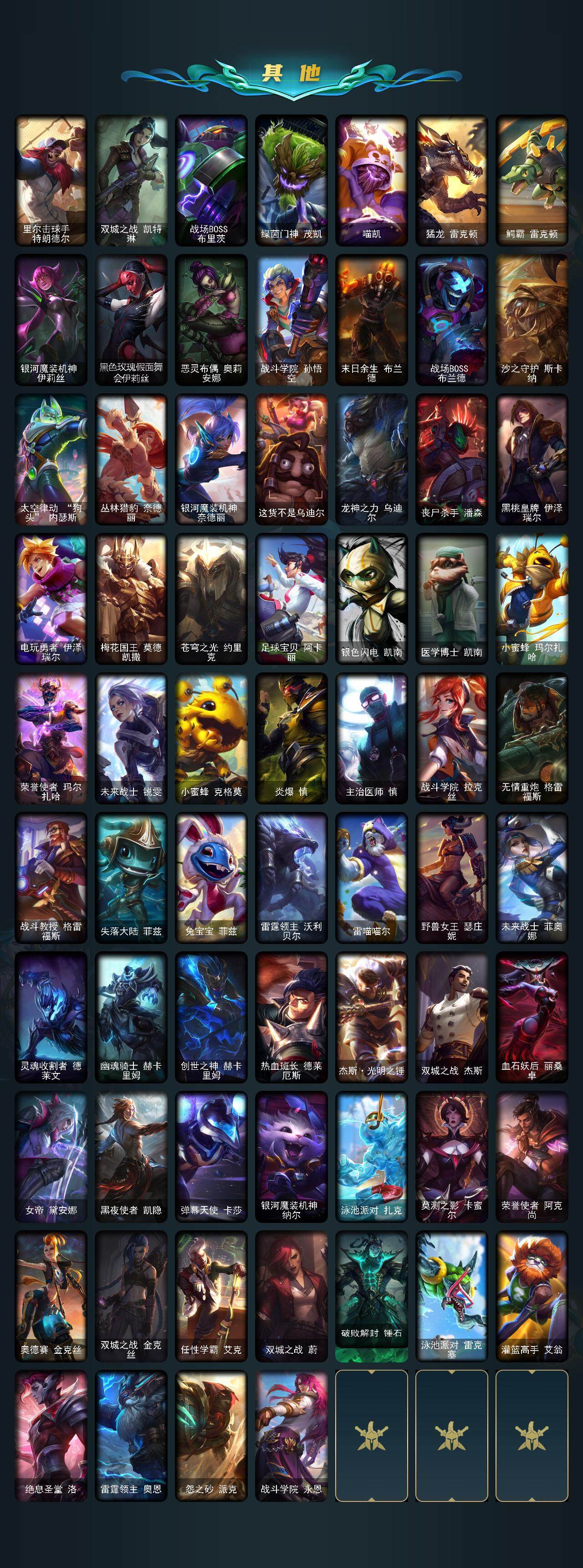 【年限皮肤】 玉净夜叉凯特琳 纳财大帝塔姆 王国机神朱雀蕾欧娜 王国机神苍狼瑟提 王国机神白虎贾克斯 福牛守护者菲奥娜