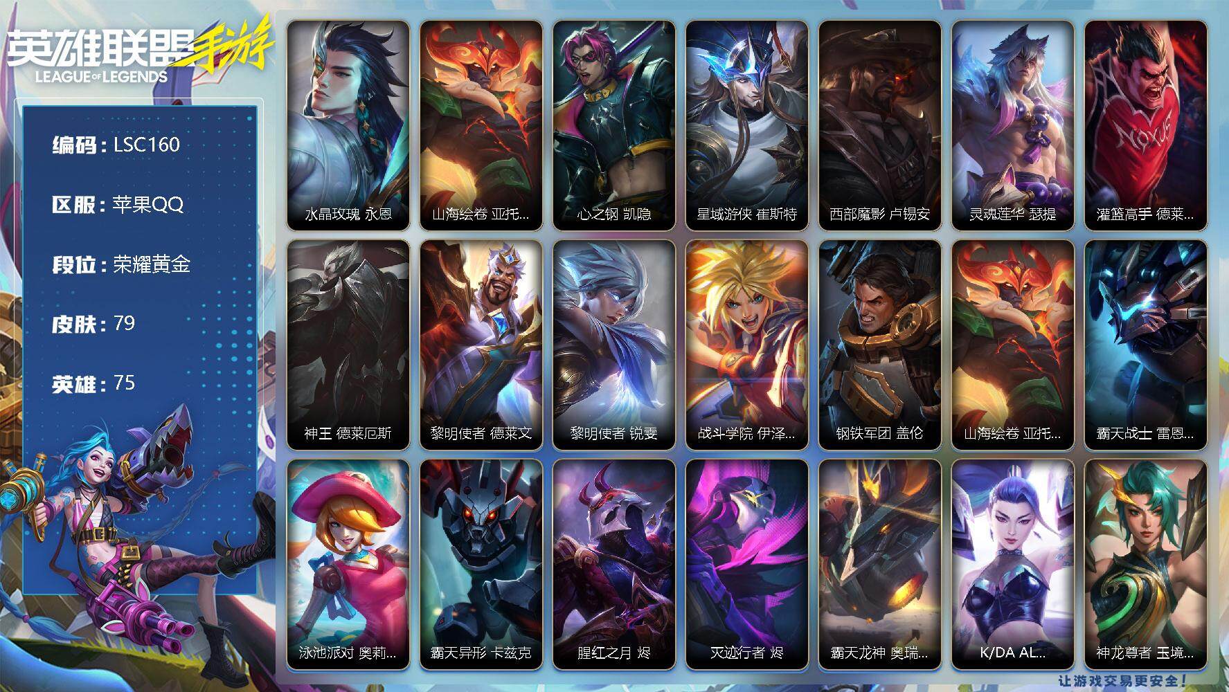 【LSC160】75英雄/79皮肤/荣耀黄金/水晶玫瑰 永恩/山海绘卷 亚托克斯/心之钢 凯隐/星域游侠崔斯特/西部魔影卢锡安/灵魂莲华 瑟提/灌篮高手/神王-德莱厄斯/黎明使者 德莱文/黎明使者瑞文/战斗学院伊泽瑞尔/钢铁军团盖伦/霸天战士-雷恩加尔/泳池派对奥利安娜/霸天异形-卡兹克/腥红之月烬/灭迹行者 烬/霸天龙神奥瑞利安索尔/K/DA-卡莎/神龙尊者 玉境灵龙 卡莎/猎龙勇士潘森/苹果机器人布里茨/战场之王布里茨/灵能特工 凯尔/太空律动 “百万调音” 格温/魔女 卡蜜尔/水晶玫瑰永恩/泳池派对 格雷福斯/星之守护者迦娜/灵魂收割者德莱文/破败军团 德莱文/霸天巨兽墨菲特/绒毛菲兹/柚子软糖 菲兹/电玩勇者瑞文/玉剑传说 武剑仙 锐雯/白色死神维鲁斯/暗星维鲁斯/源计划-卡特琳娜/死亡誓约卡特琳娜/战斗学院卡特琳娜/星之守护者伊泽瑞尔/地狱火 加里奥/战斗学院 阿克尚/天启骑士 杰斯/神奇先驱 杰斯/泳池派对雷克顿/黯晶巨鳄 雷克顿/斗魂觉醒 卡莉丝塔/s1光耀之刃/s2光耀之芒/s5绯金魅影/s6绯金丽刃/s7绯金战斧/S11王牌勇将/s12龙冕先锋/s13龙冕御盾/s17冠翎御风使/暗黑武士 雷恩加尔/苍穹之光 薇恩/时之砂 艾克/光耀之刃 泰达米尔/秘密特工 赵信/龙冕先锋 赵信/死亡绽放 卡兹克/末路狂花 金克丝/光耀之芒 金克丝/龙冕御盾 布隆/绯金魅影 伊芙琳/绯金丽刃 菲奥娜/西部牛仔 亚索/焰尾妖狐 阿狸/绝命枪手 卢锡安/熊猫 提莫/冰霜亚龙 希瓦娜/女警官 蔚/孤胆英豪 嘉文四世/超级英雄 凯南/创世魔神 内瑟斯/冠翎御风使 迦娜/金牌主播 德莱文/德莱德莱 德莱文/绯金战斧 德莱文/极地女神 艾希/苍穹之光 韦鲁斯/铁哥们儿 奥拉夫/王牌勇将 奥拉夫/铁血狙击手 凯特琳/腥红之月 锤石
