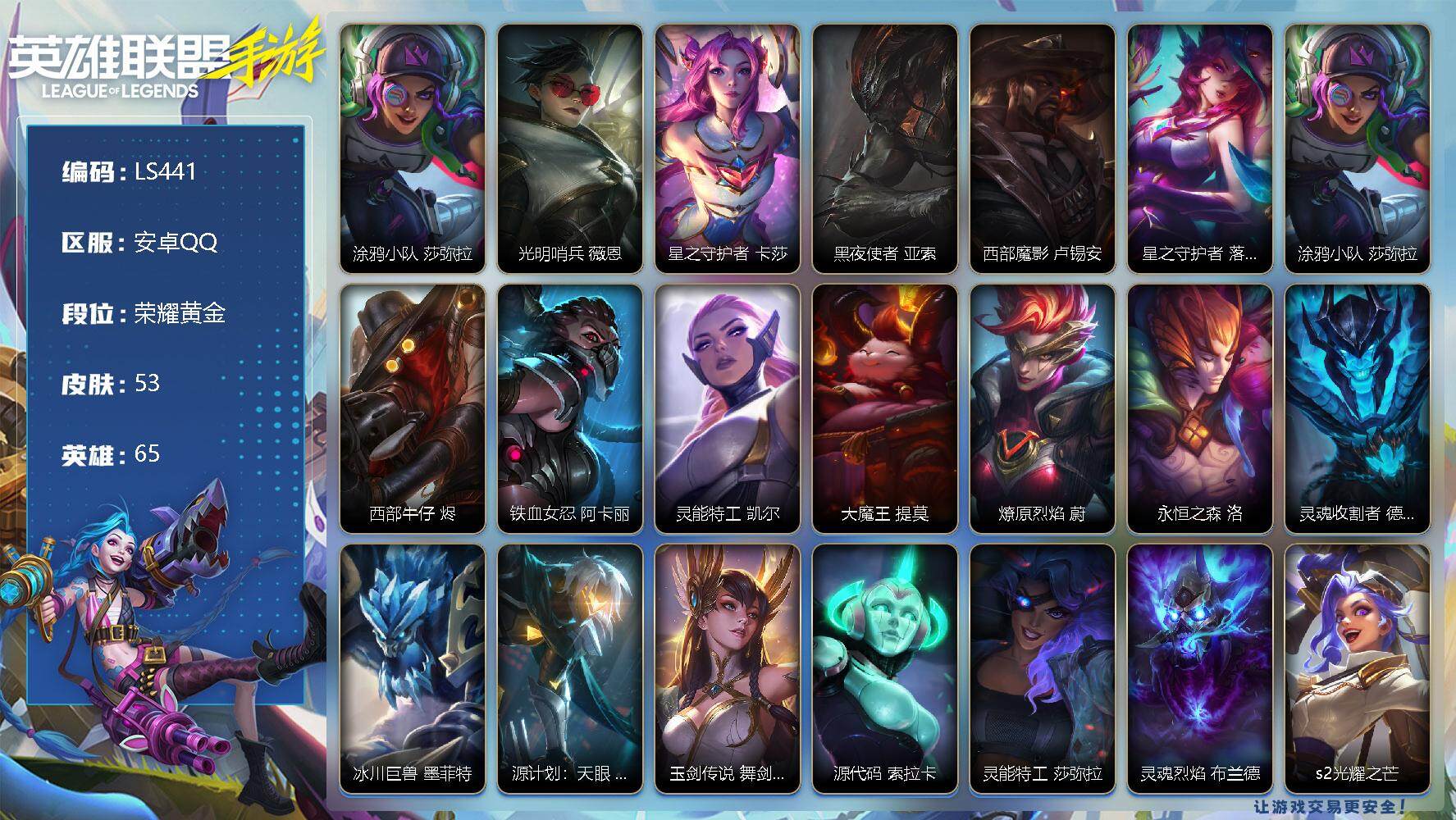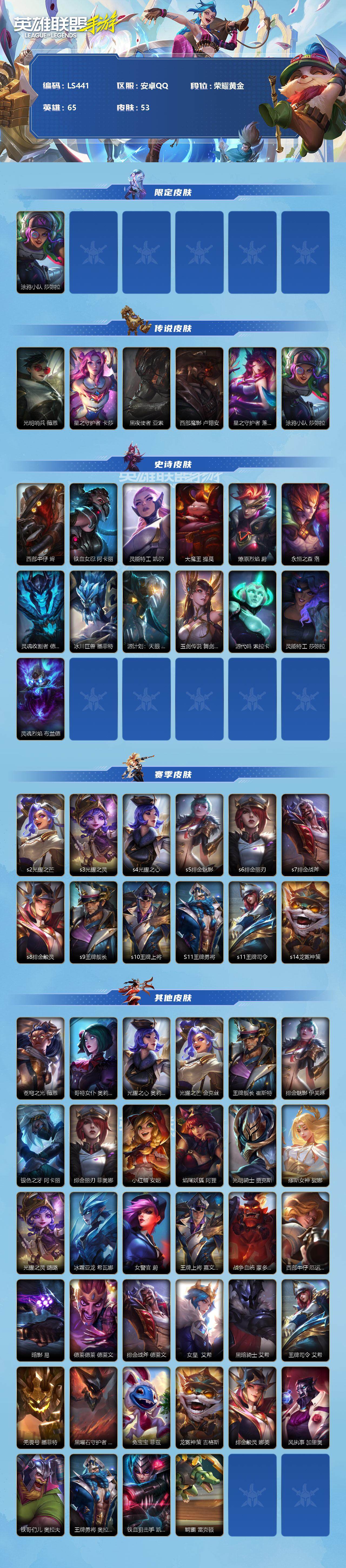 【LS441】65英雄/53皮肤/6传说/13史诗/荣耀黄金/涂鸦小队 莎弥拉/光明哨兵薇恩/星之守护者 卡莎/黑夜使者亚索/西部魔影卢锡安/星之守护者 落 霞/涂鸦小队莎弥拉/西部牛仔 烬/铁血女忍阿卡丽/灵能特工 凯尔/大魔王提莫/燎原烈焰 蔚/永恒之森 洛/灵魂收割者德莱文/冰川巨兽墨菲特/源计划:天眼 韦鲁斯/玉剑传说 舞剑仙 艾瑞莉娅/源代码索拉卡/灵能特工 莎弥拉/灵魂烈焰布兰德/s2光耀之芒/s3光耀之灵/s4光耀之心/s5绯金魅影/s6绯金丽刃/s7绯金战斧/s8绯金鮫灵/s9王牌舰长/s10王牌上将/S11王牌勇将/s11王牌司令/s14龙冕神策/苍穹之光 薇恩/哥特女仆 奥莉安娜/光耀之心 奥莉安娜/光耀之芒 金克丝/王牌舰长 崔斯特/绯金魅影 伊芙琳/银色之牙 阿卡丽/绯金丽刃 菲奥娜/小红帽 安妮/焰尾妖狐 阿狸/光明骑士 贾克斯/缪斯女神 娑娜/光耀之灵 璐璐/冰霜亚龙 希瓦娜/女警官 蔚/王牌上将 嘉文四世/战争血统 蒙多医生/西部牛仔 厄运小姐/暗影 易/德莱德莱 德莱文/绯金战斧 德莱文/女皇 艾希/黑暗骑士 艾希/王牌司令 艾希/无畏号 墨菲特/黑曜石守护者 墨菲特/兔宝宝 菲兹/龙冕神策 吉格斯/绯金鲛灵 娜美/风执事 加里奥/铁哥们儿 奥拉夫/王牌勇将 奥拉夫/铁血狙击手 凯特琳/鳄霸 雷克顿【二次实名: 可二次】