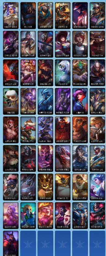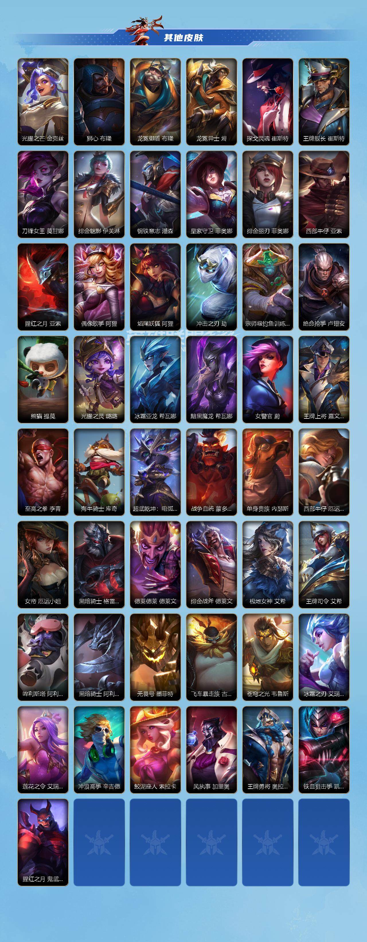 【史诗皮肤】 地狱火阿木木 霸天战士-雷恩加尔 丧尸努努和威朗普 猎龙勇士赵信 霸天龙神奥瑞利安索尔 弹幕天使卡莎 福牛守护者菲奥娜 福牛守护者安妮 星之守护者璐璐 源计划裁决蔚 暮星之羽霞 晨星之翎洛 福牛守护者嘉文四世 地下拳王李青 玉剑传说无极易 福牛守护者德莱厄斯 灵魂收割者德莱文 奥术大师吉格斯 电玩勇者瑞文 白色死神维鲁斯 暗星维鲁斯 星之守护者伊泽瑞尔