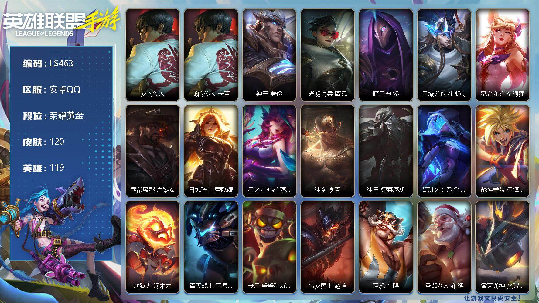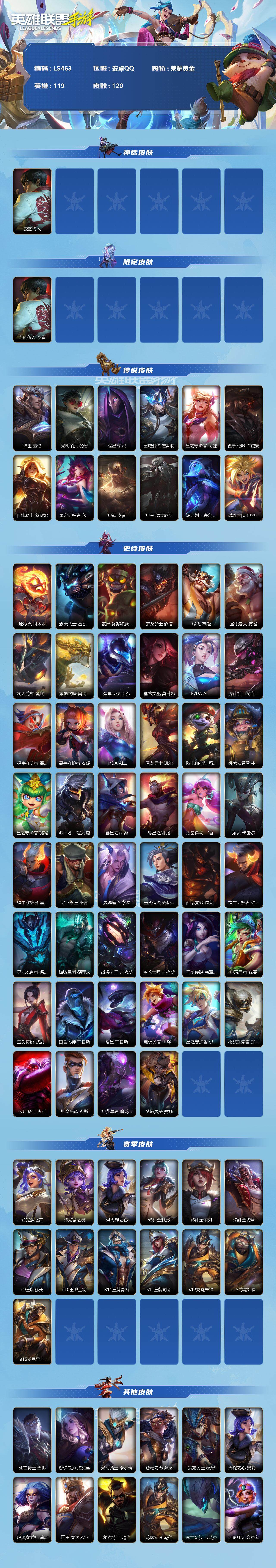 【LS463】119英雄/120皮肤/荣耀黄金/龙的传人 李青/神王盖伦/光明哨兵薇恩/暗星尊 烬/星域游侠崔斯特/星之守护者-阿狸/西部魔影卢锡安/日蚀骑士 蕾欧娜/星之守护者 落 霞/神拳-李青/神王-德莱厄斯/源计划联合艾希/战斗学院伊泽瑞尔/地狱火阿木木/霸天战士-雷恩加尔/丧尸努努和威朗普/猎龙勇士赵信/猛虎 布隆/圣诞老人 布隆/霸天龙神奥瑞利安索尔/东恒之曜 奥瑞利安·索尔/弹幕天使卡莎/魅惑女巫 莫甘娜/K/DA-阿卡丽/源计划-菲奥娜/福牛守护者菲奥娜/福牛守护者安妮/K/DA-阿狸/屠龙勇士 凯尔/欧米伽小队 魔鬼伞兵 崔丝塔娜/娜就去看看 崔丝塔娜/星之守护者璐璐/源计划裁决蔚/暮星之羽霞/晨星之翎洛/太空律动 “百万调音” 格温/魔女 卡蜜尔/福牛守护者嘉文四世/地下拳王李青/灵魂莲华 永恩/玉剑传说无极易/西部魔影 德莱厄斯/福牛守护者德莱厄斯/灵魂收割者德莱文/破败军团 德莱文/战场之王 吉格斯/奥术大师吉格斯/玉剑传说 寒潭夭夭 娜美/电玩勇者瑞文/玉剑传说 武剑仙 锐雯/白色死神维鲁斯/暗星维鲁斯/电玩勇者 伊泽瑞尔/星之守护者伊泽瑞尔/秘旅探索者 加里奥/天启骑士 杰斯/神奇先驱 杰斯/神龙尊者 魔龙 布兰德/梦境灵探 赛娜/s2光耀之芒/s3光耀之灵/s4光耀之心/s5绯金魅影/s6绯金丽刃/s7绯金战斧/s9王牌舰长/s10王牌上将/S11王牌勇将/s11王牌司令/s12龙冕先锋/s13龙冕御盾/s15龙冕异士/死亡骑士 盖伦/游侠法师 拉克丝/光明骑士 卡尔玛/苍穹之光 薇恩/猎龙勇士 薇恩/光耀之心 奥莉安娜/暗黑女武神 黛安娜/国王 泰达米尔/秘密特工 赵信/龙冕先锋 赵信/死亡绽放 卡兹克/末路狂花 金克丝/光耀之芒 金克丝/狮心 布隆/龙冕御盾 布隆/龙冕异士 烬/探戈灵魂 崔斯特/王牌舰长 崔斯特/刀锋女王 莫甘娜/绯金魅影 伊芙琳/钢铁意志 潘森/皇家守卫 菲奥娜/绯金丽刃 菲奥娜/西部牛仔 亚索/腥红之月 亚索/偶像歌手 阿狸/焰尾妖狐 阿狸/冲击之刃 劫/宗师级钓鱼训练师 贾克斯/绝命枪手 卢锡安/熊猫 提莫/光耀之灵 璐璐/冰霜亚龙 希瓦娜/黯黑魔龙 希瓦娜/女警官 蔚/王牌上将 嘉文四世/至高之拳 李青/海牛骑手 库奇/超武乾坤:电弧 凯南/战争血统 蒙多医生/单身贵族 内瑟斯/西部牛仔 厄运小姐/女帝 厄运小姐/黑暗骑士 格雷福斯/德莱德莱 德莱文/绯金战斧 德莱文/极地女神 艾希/王牌司令 艾希/哞利斯塔 阿利斯塔/黑暗骑士 阿利斯塔/无畏号 墨菲特/飞车暴走族 古拉加斯/苍穹之光 韦鲁斯/冰霜之刃 艾瑞莉娅/莲花之令 艾瑞莉娅/冲浪高手 辛吉德/蕉泥座人 索拉卡/风执事 加里奥/王牌勇将 奥拉夫/铁血狙击手 凯特琳/腥红之月 鬼武者 慎【二次实名: 可二次】