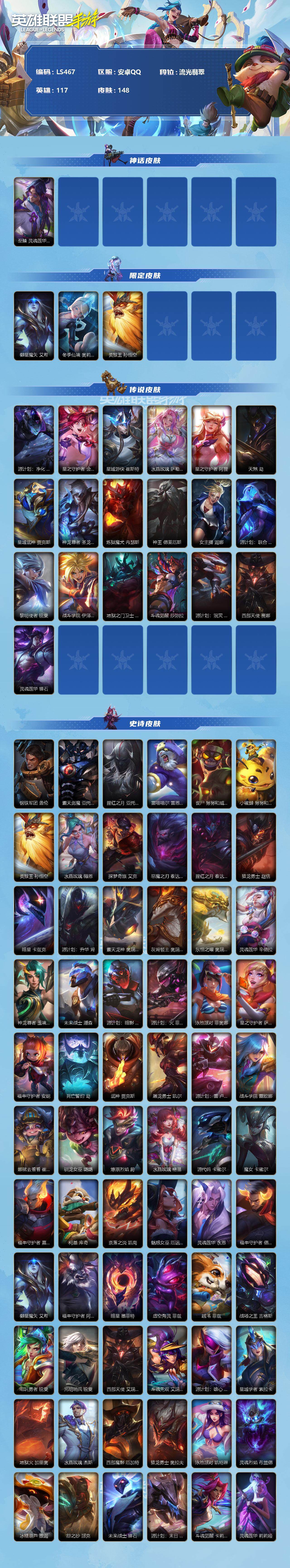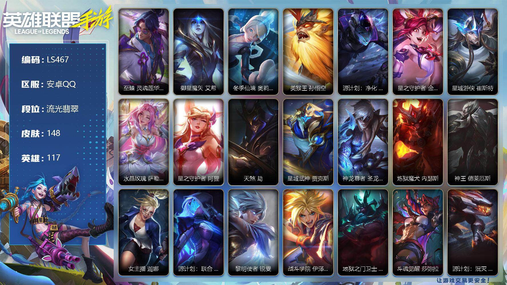 【LS467】117英雄/148皮肤/1神话/19传说/流光翡翠/至臻 灵魂莲华 易/御星魔矢 艾希/冬季仙境 奥莉安娜/美猴王 孙悟空/源计划-薇恩/星之守护者金克丝/星域游侠崔斯特/水晶玫瑰 萨勒芬妮/星之守护者-阿狸/天煞劫/星域武神 贾克斯/神龙尊者 圣龙 李青/炼狱魔犬/神王-德莱厄斯/女主播风女/源计划联合艾希/黎明使者瑞文/战斗学院伊泽瑞尔/地狱之门卫士/斗魂觉醒 莎弥拉/源计划:泯灭 雷克顿/西部天使赛娜/灵魂莲华锤石/钢铁军团盖伦/霸天剑魔 亚托克斯/腥红之月 亚托克斯/雷喵喵尔/丧尸努努和威朗普/小蜜蜂 努努和威朗普/美猴王/水晶玫瑰 薇恩/探梦奇旅 艾克/恶魔之刃泰达米尔/腥红之月 泰达米尔/猎龙勇士赵信/暗星卡兹克/源计划-烬/霸天龙神奥瑞利安索尔/灰烬领主奥瑞利安索尔/东恒之曜 奥瑞利安·索尔/灵魂莲华 辛德拉/神龙尊者 玉境灵龙 卡莎/未来战士 潘森/源计划-阿卡丽/源计划-菲奥娜/泳池派对菲奥娜/星之守护者-萨勒芬妮/福牛守护者安妮/死亡誓约劫/武神贾克斯/屠龙勇士 凯尔/源计划:雷 卢锡安/战斗学院 蕾欧娜/娜就去看看 崔丝塔娜/驯龙女巫 璐璐/燎原烈焰 蔚/水晶玫瑰 格温/源代码卡蜜尔/魔女 卡蜜尔/福牛守护者嘉文四世/柯基库奇/奈落之炎 凯南/魅惑女巫 厄运小姐/灵魂莲华 永恩/福牛守护者德莱厄斯/福牛守护者阿利斯塔/暗星 墨菲特/虚空海灵菲兹/绒毛菲兹/战场之王 吉格斯/电玩勇者瑞文/光明哨兵 锐雯/斗魂无双 艾瑞莉娅/源计划-卡特琳娜/星域学者索拉卡/地狱火 加里奥/水晶玫瑰 杰斯/西部魔影 厄加特/猎龙勇士 奥拉夫/泳池派对 凯特琳/灵魂烈焰布兰德/冰糖葫芦 维迦/怨之砂 派克/未来战士锤石/源计划:末日 沃里克/斗魂觉醒 卡莉丝塔/灵魂莲华 莉莉娅/s1光耀之刃/s3光耀之灵/s5绯金魅影/s6绯金丽刃/s7绯金战斧/s9王牌舰长/S11王牌勇将/s11王牌司令/s12龙冕先锋/s13龙冕御盾/s14龙冕神策/s15龙冕异士/s16冠翎飞行员/s17冠翎御风使/S18冠翎巨神像/海上霸主 盖伦/小小骑士 阿木木/斗战胜佛 孙悟空/时之砂 艾克/哥特女仆 奥莉安娜/光耀之刃 泰达米尔/秘密特工 赵信/龙冕先锋 赵信/死亡绽放 卡兹克/末路狂花 金克丝/龙冕御盾 布隆/龙冕异士 烬/逍遥赌侠 崔斯特/王牌舰长 崔斯特/刀锋女王 莫甘娜/探戈灵魂 伊芙琳/绯金魅影 伊芙琳/超武乾坤:暗影 阿卡丽/皇家守卫 菲奥娜/绯金丽刃 菲奥娜/擂台皇帝 布里茨/冰霜烈焰 安妮/小红帽 安妮/西部牛仔 亚索/腥红之月 亚索/宗师级钓鱼训练师 贾克斯/光明骑士 贾克斯/烧烤女神 蕾欧娜/熊猫 提莫/光耀之灵 璐璐/冰霜亚龙 希瓦娜/双城之战 蔚/冠翎飞行员 库奇/刺客信条 凯南/超级英雄 凯南/泳池派对 蒙多医生/战争血统 蒙多医生/熔火之心 拉莫斯/制胜金球 拉莫斯/单身贵族 内瑟斯/西部牛仔 厄运小姐/暗影 易/热血班长 德莱厄斯/黑暗骑士 格雷福斯/冠翎御风使 迦娜/绯金战斧 德莱文/女皇 艾希/黑暗骑士 艾希/王牌司令 艾希/哞利斯塔 阿利斯塔/兔宝宝 吉格斯/龙冕神策 吉格斯/鲛妮座人 娜美/苍穹之光 韦鲁斯/冰霜之刃 艾瑞莉娅/炼金狂士 辛吉德/蕉泥座人 索拉卡/冠翎巨神像 加里奥/王牌勇将 奥拉夫/铁血狙击手 凯特琳/鳄霸 雷克顿/战争机器 赛恩【二次实名: 可二次】