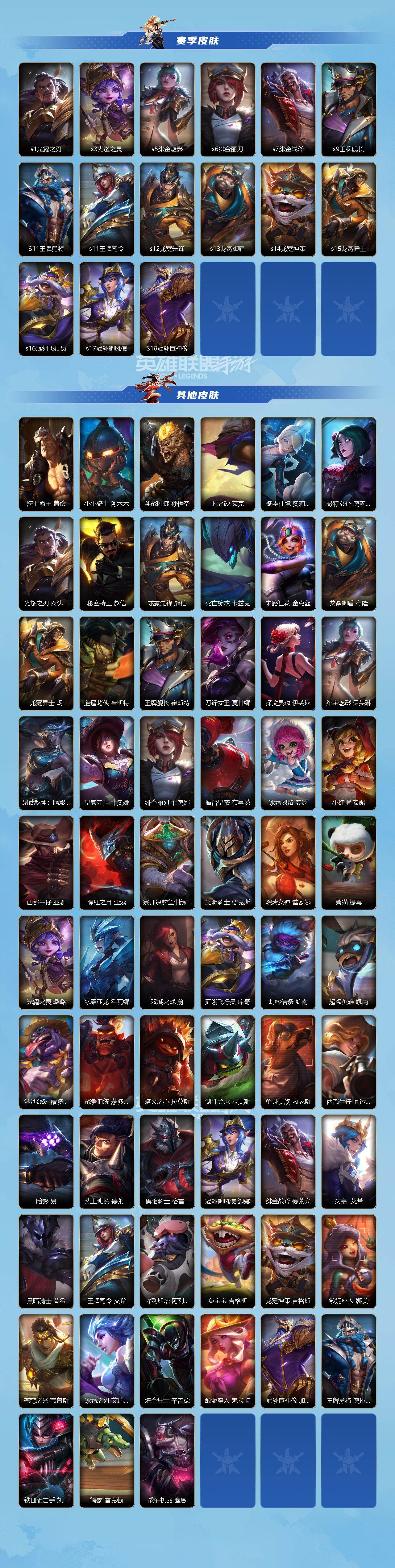 【史诗皮肤】 钢铁军团盖伦 雷喵喵尔 丧尸努努和威朗普 美猴王 恶魔之刃泰达米尔 猎龙勇士赵信 暗星卡兹克 霸天龙神奥瑞利安索尔 灰烬领主奥瑞利安索尔 泳池派对菲奥娜 福牛守护者安妮 死亡誓约劫 武神贾克斯 源代码卡蜜尔 福牛守护者嘉文四世 柯基库奇 福牛守护者德莱厄斯 福牛守护者阿利斯塔 虚空海灵菲兹 绒毛菲兹 电玩勇者瑞文 星域学者索拉卡 灵魂烈焰布兰德 未来战士锤石