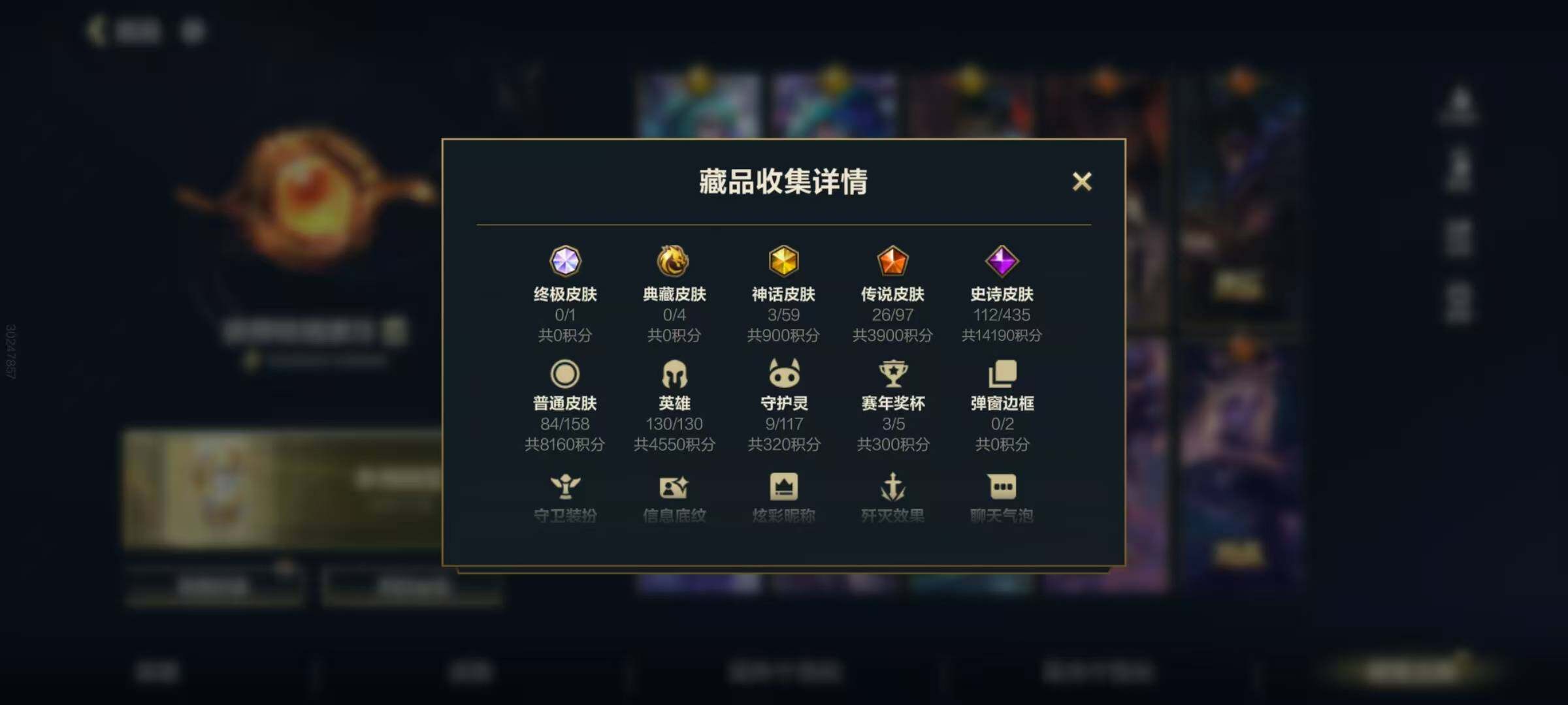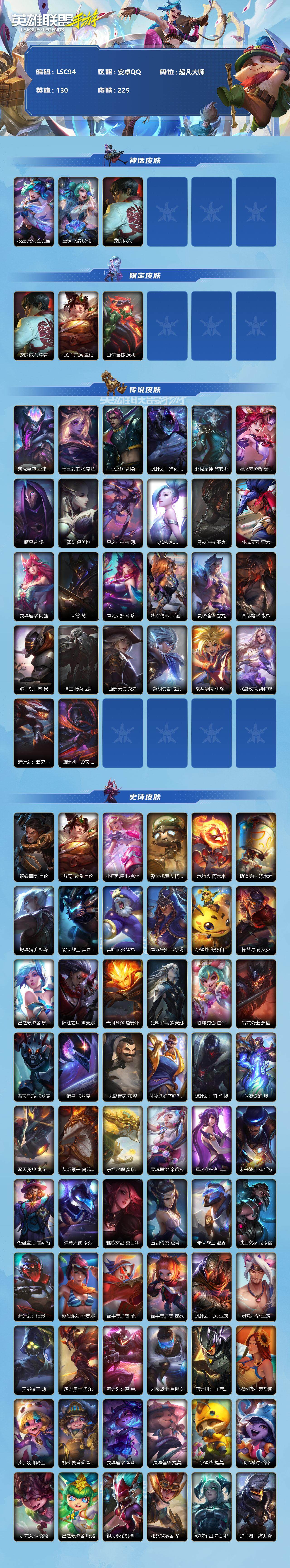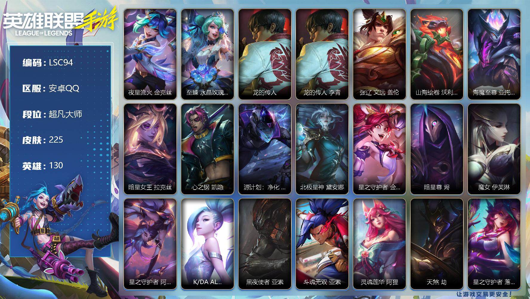 【LSC94】130英雄/225皮肤/超凡大师/夜星流火 金克丝/至臻 水晶玫瑰 格温/龙的传人 李青/张辽 文远 盖伦/山海绘卷 沃利贝尔/海魔至尊 亚托克斯/暗星女王拉克丝/心之钢 凯隐/源计划-薇恩/北极星神 黛安娜/星之守护者金克丝/暗星尊 烬/魔女 伊芙琳/星之守护者 阿卡丽/K/DA-萨勒芬妮/黑夜使者亚索/斗魂无双 亚索/灵魂莲华 阿狸/天煞劫/星之守护者 落 霞/跳跳倩影 厄运小姐/灵魂莲华 瑟提/西部魔影 永恩/源计划:林 易/神王-德莱厄斯/西部天使 艾希/黎明使者瑞文/战斗学院伊泽瑞尔/水晶玫瑰 凯特琳/源计划:泯灭 雷克顿/源计划:毁灭 派克/钢铁军团盖伦/张辽 文远/小鹿乱撞 拉克丝/殇之机器人阿木木/地狱火阿木木/劲道美味 阿木木/摄魂猎手 凯隐/霸天战士-雷恩加尔/雷喵喵尔/星域先知 卡尔玛/小蜜蜂 努努和威朗普/探梦奇旅 艾克/星之守护者-奥莉安娜/腥红之月戴安娜/无限烈焰戴安娜/光明哨兵 黛安娜/咖啡甜心 佐伊/猎龙勇士赵信/霸天异形-卡兹克/暗星卡兹克/末路管家布隆/礼物选好了吗? 布隆/源计划-烬/斗魂觉醒 烬/霸天龙神奥瑞利安索尔/灰烬领主奥瑞利安索尔/东恒之曜 奥瑞利安·索尔/灵魂莲华 辛德拉/星之守护者 辛德拉/未来战士 崔斯特/怪诞童话 崔斯特/弹幕天使卡莎/魅惑女巫 莫甘娜/玉剑传说 苍鸾 莫甘娜/未来战士 潘森/铁血女忍阿卡丽/源计划-阿卡丽/泳池派对菲奥娜/福牛守护者菲奥娜/福牛守护者安妮/源计划风亚索/灵魂莲华 亚索/灵能特工 劫/屠龙勇士 凯尔/源计划:雷 卢锡安/未来战士 卢锡安/源计划山蕾欧娜/泳池派对蕾欧娜/我,羽饰骑士 崔丝塔娜/娜就去看看 崔丝塔娜/灵魂莲华 崔丝塔娜/灵魂莲华 提莫/小蜜蜂 提莫/泳池派对璐璐/驯龙女巫 璐璐/星之守护者璐璐/银河魔装机神 希瓦娜/秘旅探索者 希瓦娜/破败军团 希瓦娜/源计划裁决蔚/太空律动 “百万调音” 格温/斗魂觉醒 格温/星域审判官卡蜜尔/暗星嘉文四世/福牛守护者嘉文四世/地下拳王李青/奈落之炎 凯南/冰封王子 蒙多医生/战地机甲 内瑟斯/盗梦者 内瑟斯/太空律动 “狗头” 内瑟斯/魅惑女巫 厄运小姐/破败军团 厄运小姐/源计划:燃 泽丽/灵魂莲华 永恩/灵魂莲华 易/西部魔影 德莱厄斯/福牛守护者德莱厄斯/灵魂收割者德莱文/霸天巨兽墨菲特/冰川巨兽墨菲特/暗星 墨菲特/银河魔装机神菲兹/虚空海灵菲兹/绒毛菲兹/泳池派对 吉格斯/玉剑传说 寒潭夭夭 娜美/玉剑传说 武剑仙 锐雯/灵魂莲华 锐雯/光明哨兵 艾瑞莉娅/死亡誓约卡特琳娜/战斗学院卡特琳娜/西部魔影 执行人 卡特琳娜/星之守护者伊泽瑞尔/秘旅探索者 加里奥/神奇先驱 杰斯/猎龙勇士 奥拉夫/奈落之炎 慎/苍穹之光布兰德/灵魂烈焰布兰德/神龙尊者 魔龙 布兰德/黯晶巨鳄 雷克顿/冰糖葫芦 维迦/梦境灵探 赛娜/怨之砂 派克/玉剑传说 无影 泰隆/西部魔影 猎天使恶魔 泰隆/星之吞噬者 费德提克/梦游仙境 莉莉娅/魅惑女巫 薇古丝/星域巫灵 薇古丝/s1光耀之刃/s2光耀之芒/s3光耀之灵/s4光耀之心/s5绯金魅影/s6绯金丽刃/s7绯金战斧/s8绯金鮫灵/s9王牌舰长/s10王牌上将/S11王牌勇将/s11王牌司令/s12龙冕先锋/s13龙冕御盾/s14龙冕神策/s16冠翎飞行员/s17冠翎御风使/S18冠翎巨神像/暗黑武士 雷恩加尔/斗战胜佛 孙悟空/苍穹之光 薇恩/猎龙勇士 薇恩/光耀之心 奥莉安娜/暗黑女武神 黛安娜/光耀之刃 泰达米尔/秘密特工 赵信/龙冕先锋 赵信/死亡绽放 卡兹克/光耀之芒 金克丝/双城之战 金克丝/猎龙勇士 布隆/龙冕御盾 布隆/探戈灵魂 崔斯特/王牌舰长 崔斯特/探戈灵魂 伊芙琳/绯金魅影 伊芙琳/钢铁意志 潘森/银色之牙 阿卡丽/皇家守卫 菲奥娜/绯金丽刃 菲奥娜/擂台皇帝 布里茨/冰霜烈焰 安妮/小红帽 安妮/西部牛仔 亚索/偶像歌手 阿狸/焰尾妖狐 阿狸/冲击之刃 劫/宗师级钓鱼训练师 贾克斯/末世天使 凯尔/兔宝宝 提莫/熊猫 提莫/缪斯女神 娑娜/邪恶女巫 璐璐/光耀之灵 璐璐/冰霜亚龙 希瓦娜/黯黑魔龙 希瓦娜/女警官 蔚/王牌上将 嘉文四世/海牛骑手 库奇/冠翎飞行员 库奇/战争血统 蒙多医生/熔火之心 拉莫斯/创世魔神 内瑟斯/女帝 厄运小姐/暗影 易/热血班长 德莱厄斯/末路教父 格雷福斯/黑暗骑士 格雷福斯/冠翎御风使 迦娜/金牌主播 德莱文/德莱德莱 德莱文/绯金战斧 德莱文/极地女神 艾希/黑暗骑士 艾希/王牌司令 艾希/哞利斯塔 阿利斯塔/无畏号 墨菲特/黑曜石守护者 墨菲特/科学狂人 吉格斯/兔宝宝 吉格斯/龙冕神策 吉格斯/飞车暴走族 古拉加斯/碎桶者 古拉加斯/鲛妮座人 娜美/绯金鲛灵 娜美/迅箭 韦鲁斯/冰霜之刃 艾瑞莉娅/莲花之令 艾瑞莉娅/海贼魅影 卡特琳娜/冲浪高手 辛吉德/炼金狂士 辛吉德/冰川勇者 伊泽瑞尔/冠翎巨神像 加里奥/光明之锤 杰斯/铁哥们儿 奥拉夫/王牌勇将 奥拉夫/铁血狙击手 凯特琳/黑暗骑士 布兰德/枯萎之壤 雷克顿/鳄霸 雷克顿/穿着正装的恶魔 维迦/腥红之月 锤石【二次实名: 不可二次】