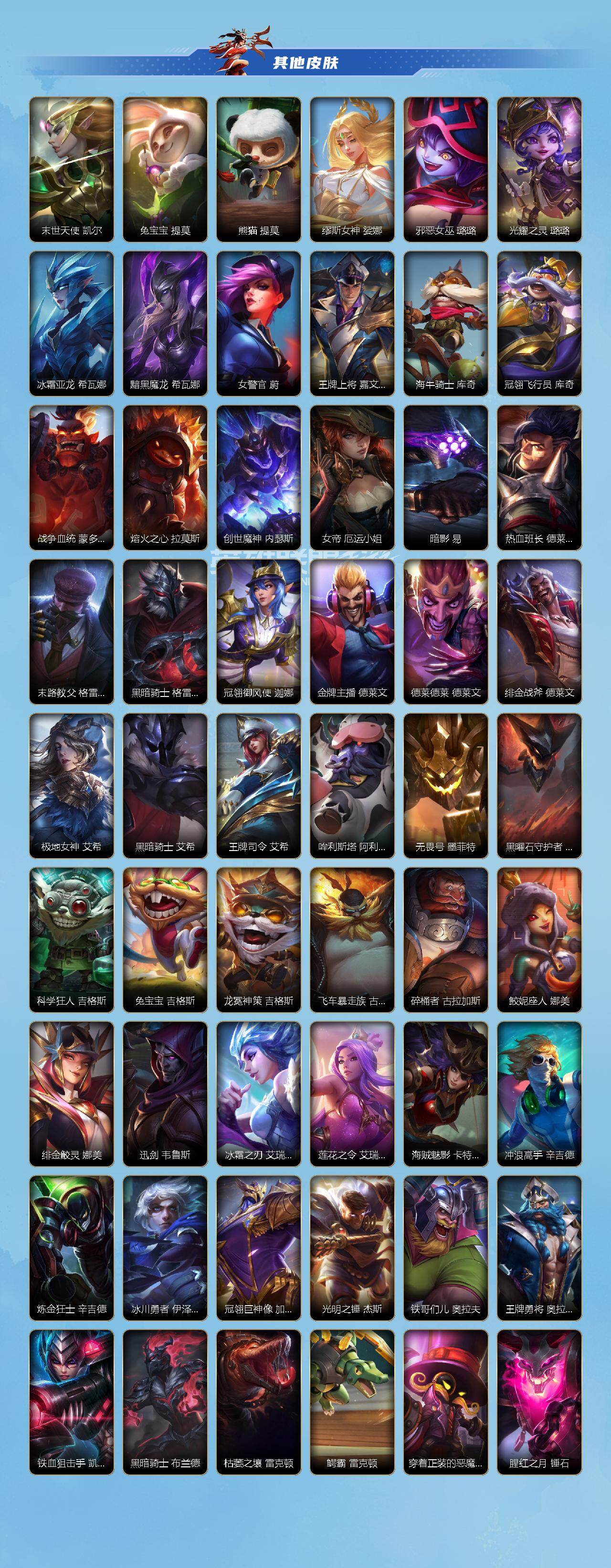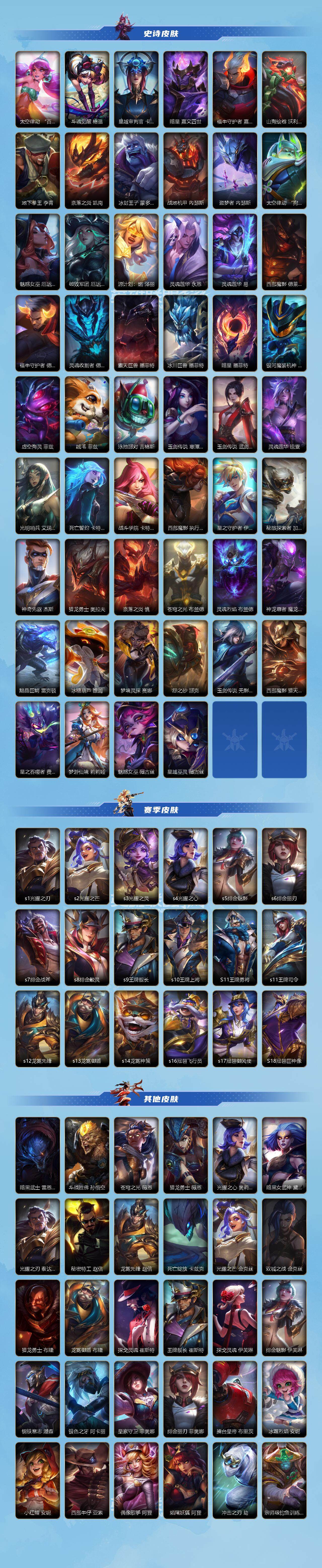 【史诗皮肤】 钢铁军团盖伦 张辽 文远 殇之机器人阿木木 地狱火阿木木 霸天战士-雷恩加尔 雷喵喵尔 腥红之月戴安娜 无限烈焰戴安娜 猎龙勇士赵信 霸天异形-卡兹克 暗星卡兹克 末路管家布隆 霸天龙神奥瑞利安索尔 灰烬领主奥瑞利安索尔 弹幕天使卡莎 铁血女忍阿卡丽 泳池派对菲奥娜 福牛守护者菲奥娜 福牛守护者安妮 源计划风亚索 源计划山蕾欧娜 泳池派对蕾欧娜 泳池派对璐璐 星之守护者璐璐 源计划裁决蔚 星域审判官卡蜜尔 暗星嘉文四世 福牛守护者嘉文四世 地下拳王李青 福牛守护者德莱厄斯 灵魂收割者德莱文 霸天巨兽墨菲特 冰川巨兽墨菲特 银河魔装机神菲兹 虚空海灵菲兹 绒毛菲兹 死亡誓约卡特琳娜 战斗学院卡特琳娜 星之守护者伊泽瑞尔 苍穹之光布兰德 灵魂烈焰布兰德