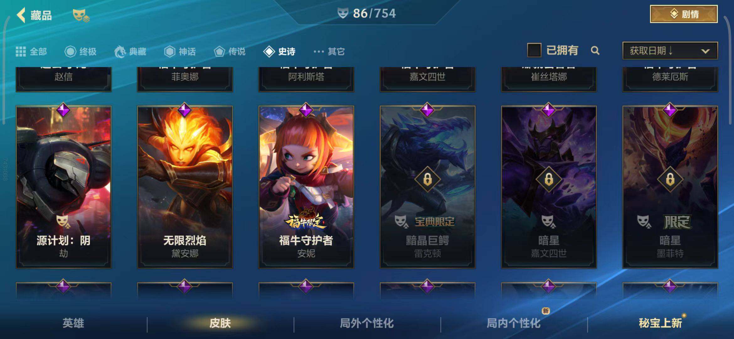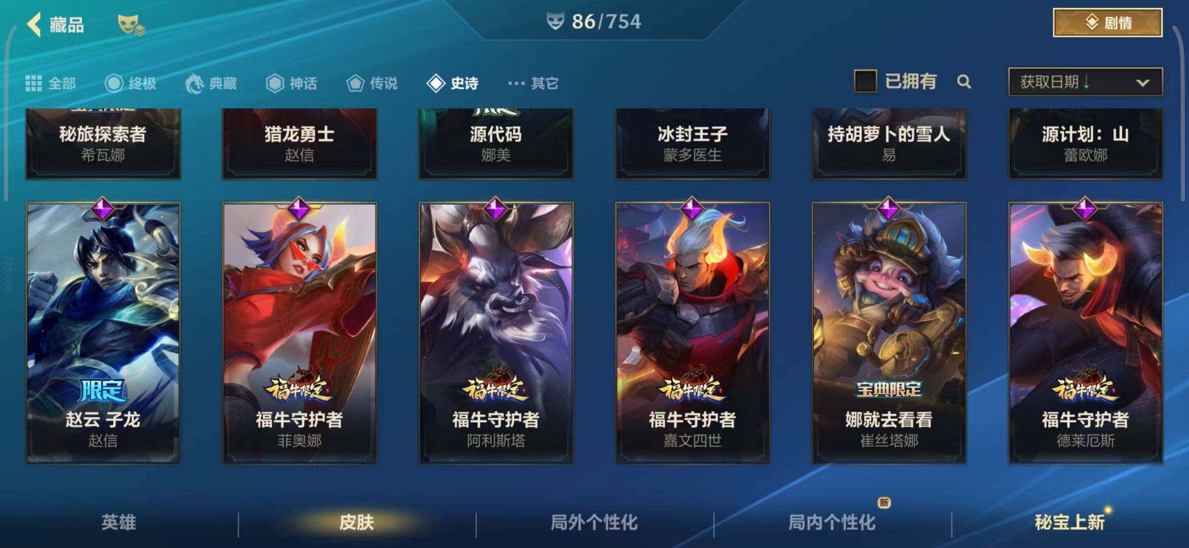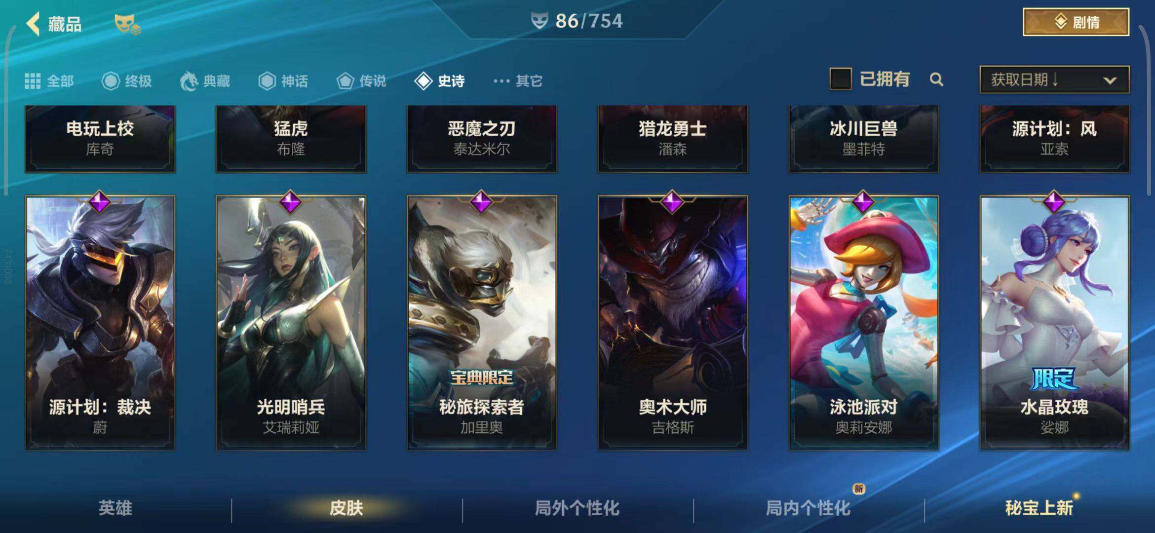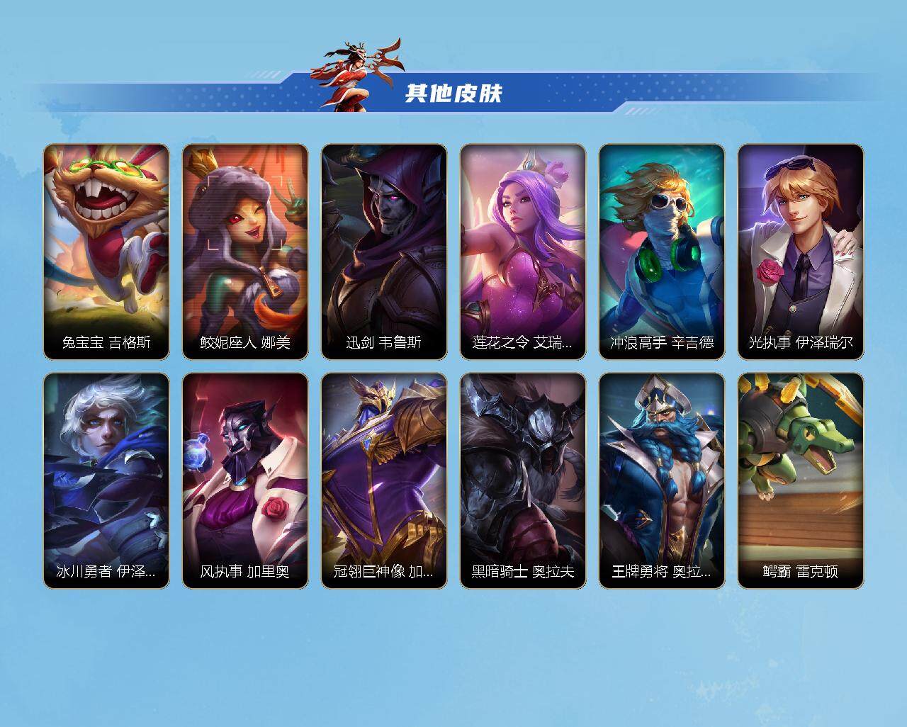 【史诗皮肤】 泳池派对奥利安娜 无限烈焰戴安娜 恶魔之刃泰达米尔 赵云 子龙 猎龙勇士赵信 猎龙勇士潘森 福牛守护者菲奥娜 福牛守护者安妮 源计划风亚索 源计划阴劫 源计划山蕾欧娜 水晶玫瑰琴女 源计划裁决蔚 福牛守护者嘉文四世 福牛守护者德莱厄斯 福牛守护者阿利斯塔 冰川巨兽墨菲特 奥术大师吉格斯