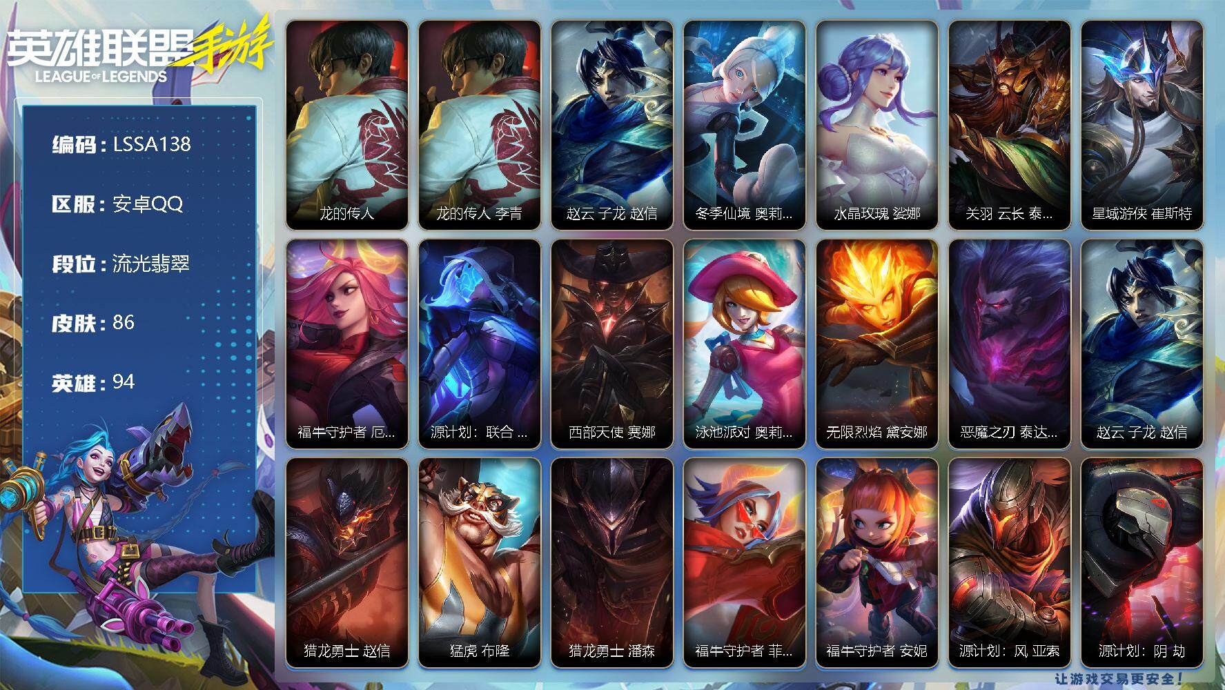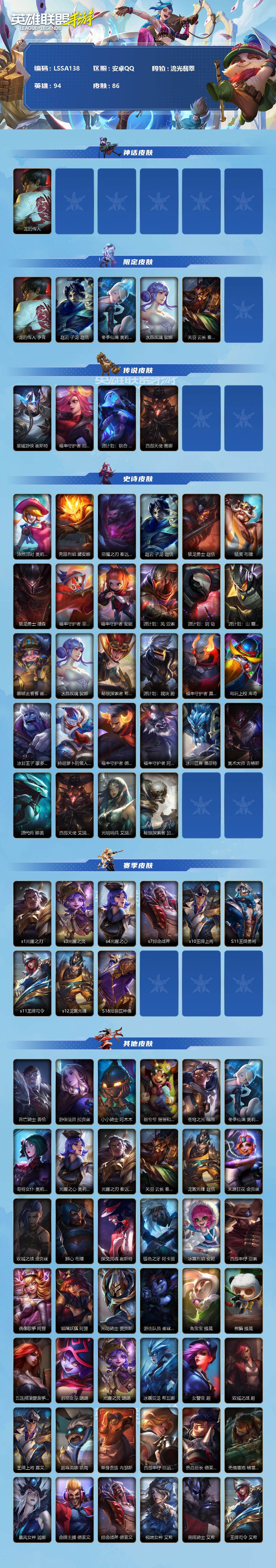 【LSSA138】94英雄/86皮肤/1神话/4传说/27史诗/流光翡翠/龙的传人 李青/赵云 子龙 赵信/冬季仙境 奥莉安娜/水晶玫瑰 娑娜/关羽 云长 泰达米尔/星域游侠崔斯特/福牛守护者女枪/源计划联合艾希/西部天使赛娜/泳池派对奥利安娜/无限烈焰戴安娜/恶魔之刃泰达米尔/赵云 子龙/猎龙勇士赵信/猛虎 布隆/猎龙勇士潘森/福牛守护者菲奥娜/福牛守护者安妮/源计划风亚索/源计划阴劫/源计划山蕾欧娜/娜就去看看 崔丝塔娜/水晶玫瑰琴女/秘旅探索者 希瓦娜/源计划裁决蔚/福牛守护者嘉文四世/电玩上校 库奇/冰封王子 蒙多医生/持胡萝卜的雪人 易/福牛守护者德莱厄斯/福牛守护者阿利斯塔/冰川巨兽墨菲特/奥术大师吉格斯/源代码 娜美/光明哨兵 艾瑞莉娅/秘旅探索者 加里奥/s1光耀之刃/s3光耀之灵/s4光耀之心/s7绯金战斧/s10王牌上将/S11王牌勇将/s11王牌司令/s12龙冕先锋/S18冠翎巨神像/死亡骑士 盖伦/游侠法师 拉克丝/小小骑士 阿木木/脏兮兮 努努和威朗普/苍穹之光 薇恩/哥特女仆 奥莉安娜/光耀之心 奥莉安娜/光耀之刃 泰达米尔/龙冕先锋 赵信/末路狂花 金克丝/双城之战 金克丝/狮心 布隆/探戈灵魂 崔斯特/银色之牙 阿卡丽/冰霜烈焰 安妮/西部牛仔 亚索/偶像歌手 阿狸/焰尾妖狐 阿狸/光明骑士 贾克斯/游击队员 崔丝塔娜/兔宝宝 提莫/熊猫 提莫/五连摇滚键盘手 娑娜/邪恶女巫 璐璐/光耀之灵 璐璐/冰霜亚龙 希瓦娜/女警官 蔚/双城之战 蔚/王牌上将 嘉文四世/超级英雄 凯南/单身贵族 内瑟斯/西部牛仔 厄运小姐/热血班长 德莱厄斯/无情重炮 格雷福斯/暴风女神 迦娜/金牌主播 德莱文/绯金战斧 德莱文/极地女神 艾希/黑暗骑士 艾希/王牌司令 艾希/兔宝宝 吉格斯/鲛妮座人 娜美/迅箭 韦鲁斯/莲花之令 艾瑞莉娅/冲浪高手 辛吉德/光执事 伊泽瑞尔/冰川勇者 伊泽瑞尔/风执事 加里奥/冠翎巨神像 加里奥/黑暗骑士 奥拉夫/王牌勇将 奥拉夫/鳄霸 雷克顿【二次实名: 可二次】