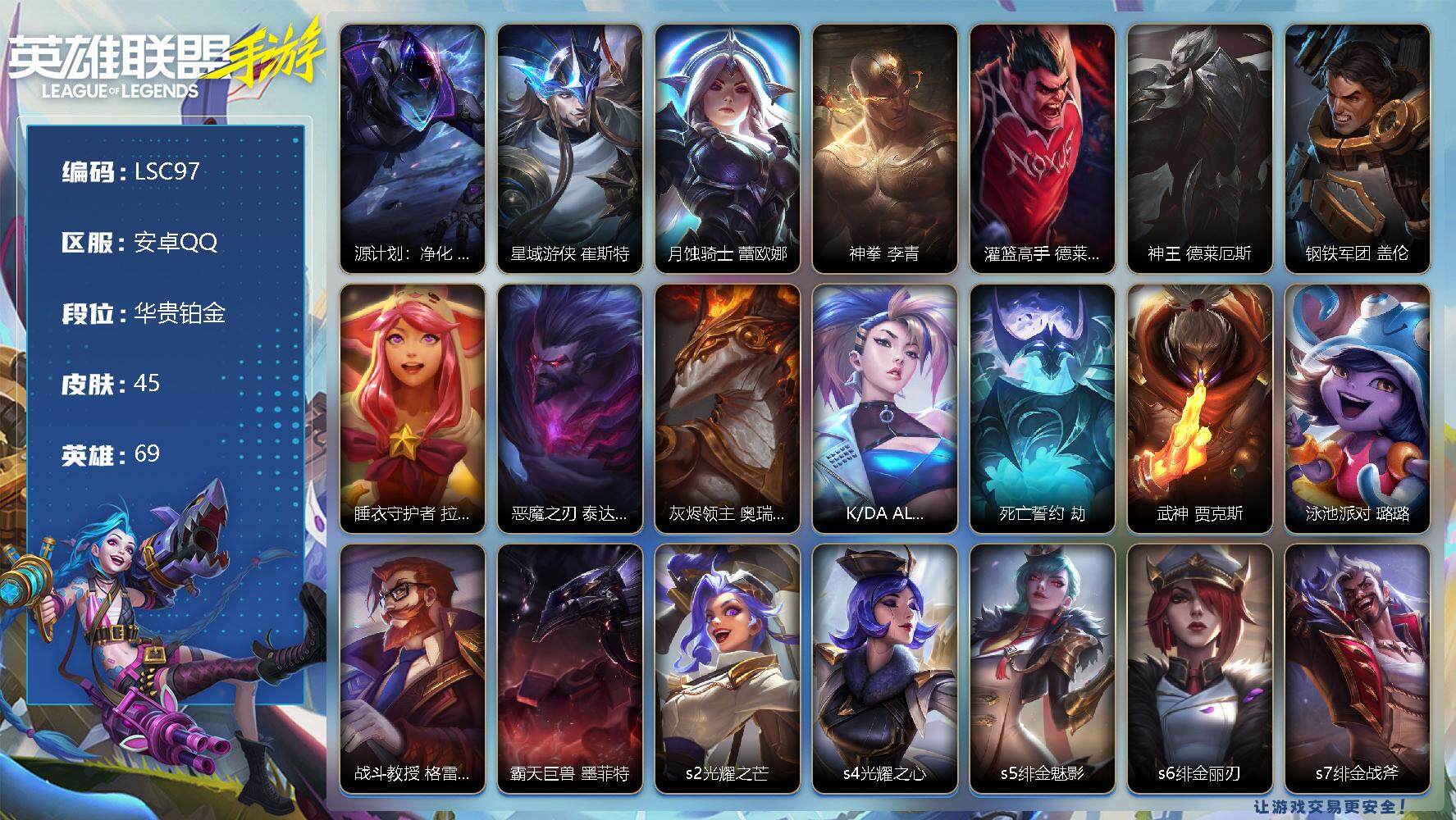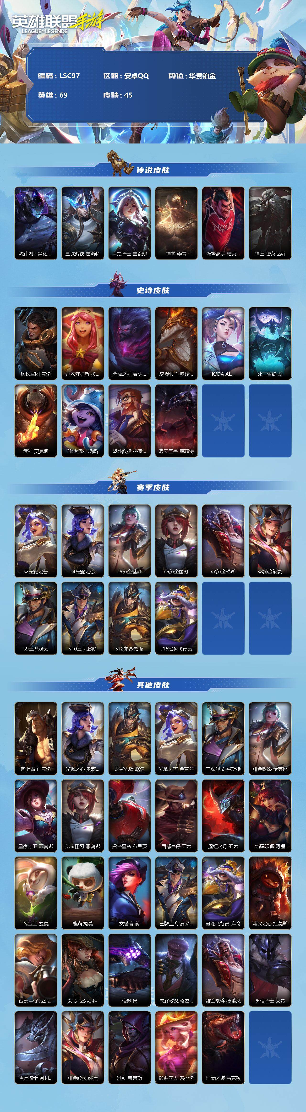 【LSC97】69英雄/45皮肤/华贵铂金/源计划-薇恩/星域游侠崔斯特/月蚀骑士 蕾欧娜/神拳-李青/灌篮高手/神王-德莱厄斯/钢铁军团盖伦/拉克丝-睡衣守护者/恶魔之刃泰达米尔/灰烬领主奥瑞利安索尔/K/DA-阿卡丽/死亡誓约劫/武神贾克斯/泳池派对璐璐/战斗教授格雷福斯/霸天巨兽墨菲特/s2光耀之芒/s4光耀之心/s5绯金魅影/s6绯金丽刃/s7绯金战斧/s8绯金鮫灵/s9王牌舰长/s10王牌上将/s12龙冕先锋/s16冠翎飞行员/海上霸主 盖伦/光耀之心 奥莉安娜/龙冕先锋 赵信/光耀之芒 金克丝/王牌舰长 崔斯特/绯金魅影 伊芙琳/皇家守卫 菲奥娜/绯金丽刃 菲奥娜/擂台皇帝 布里茨/西部牛仔 亚索/腥红之月 亚索/焰尾妖狐 阿狸/兔宝宝 提莫/熊猫 提莫/女警官 蔚/王牌上将 嘉文四世/冠翎飞行员 库奇/熔火之心 拉莫斯/西部牛仔 厄运小姐/女帝 厄运小姐/暗影 易/末路教父 格雷福斯/绯金战斧 德莱文/黑暗骑士 艾希/黑暗骑士 阿利斯塔/绯金鲛灵 娜美/迅箭 韦鲁斯/蕉泥座人 索拉卡/枯萎之壤 雷克顿【二次实名: 可二次】