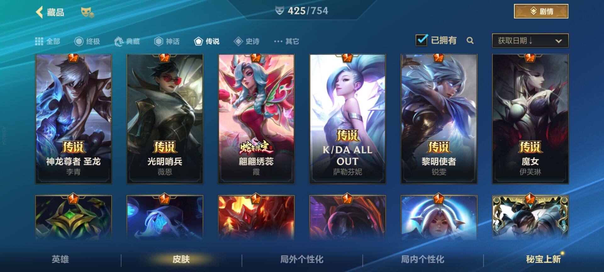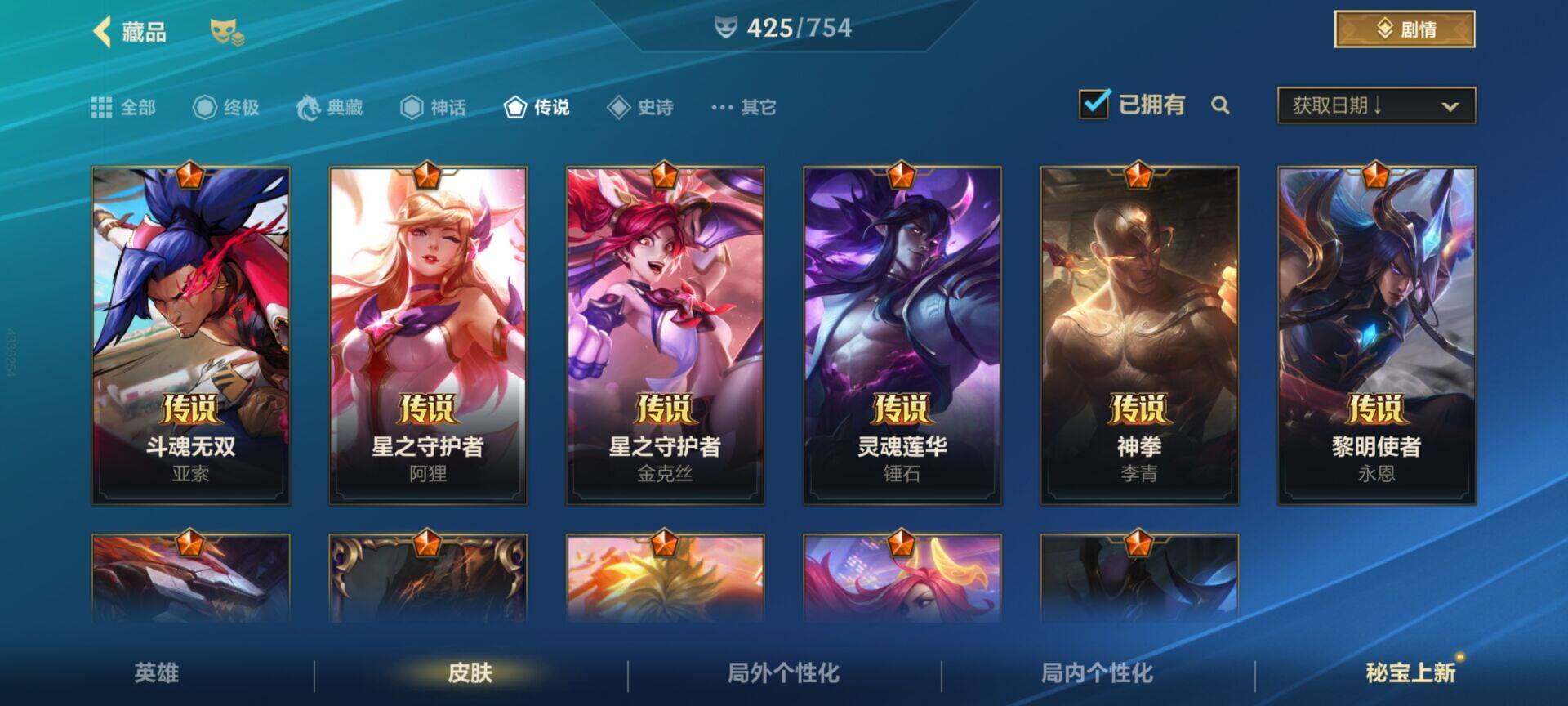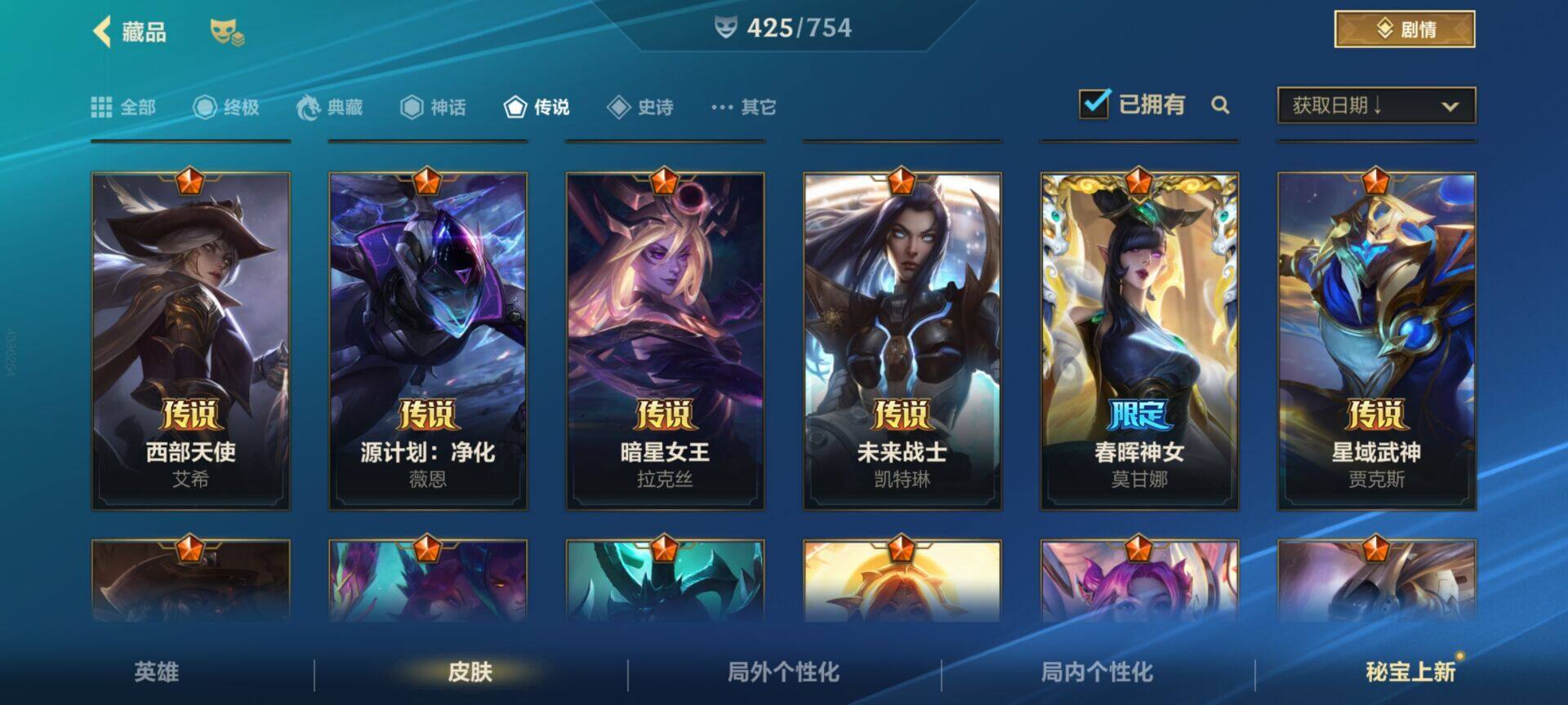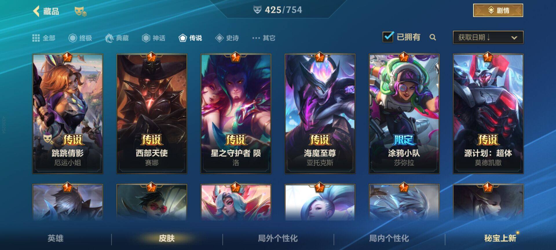 【传说皮肤】 暗星女王拉克丝 源计划-薇恩 光明哨兵薇恩 星之守护者金克丝 星域游侠崔斯特 K/DA-萨勒芬妮 黑夜使者亚索 星之守护者-阿狸 天煞劫 西部魔影卢锡安 神拳-李青 律政大亨 炼狱魔犬 福牛守护者女枪 神龙尊者御风啸龙易 神王德莱厄斯 源计划联合艾希 黎明使者锐雯 战斗学院伊泽瑞尔 地狱之门卫士 涂鸦小队莎弥拉 西部天使赛娜 灵魂莲华锤石 K/DA-卡莎 K/DA-阿卡丽 源计划-阿卡丽 星之守护者-萨勒芬妮 K/DA-阿狸 星之守护者-厄运小姐