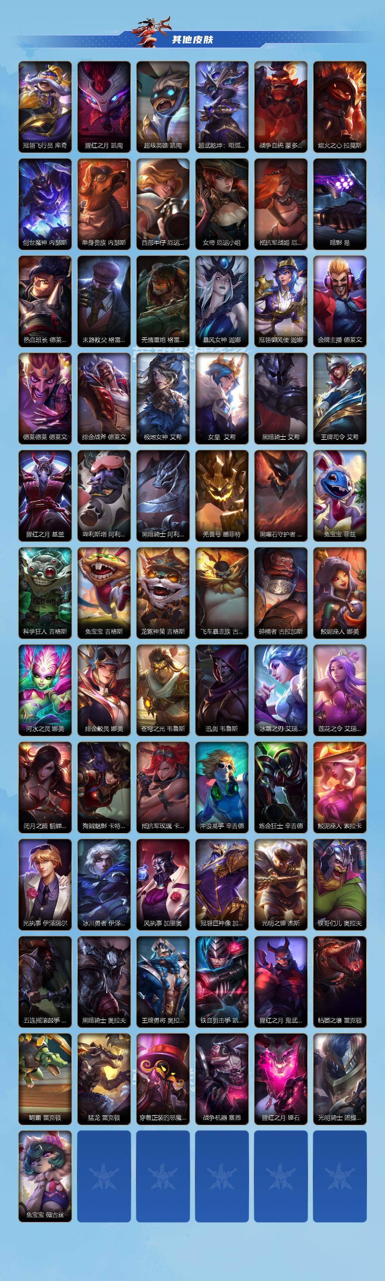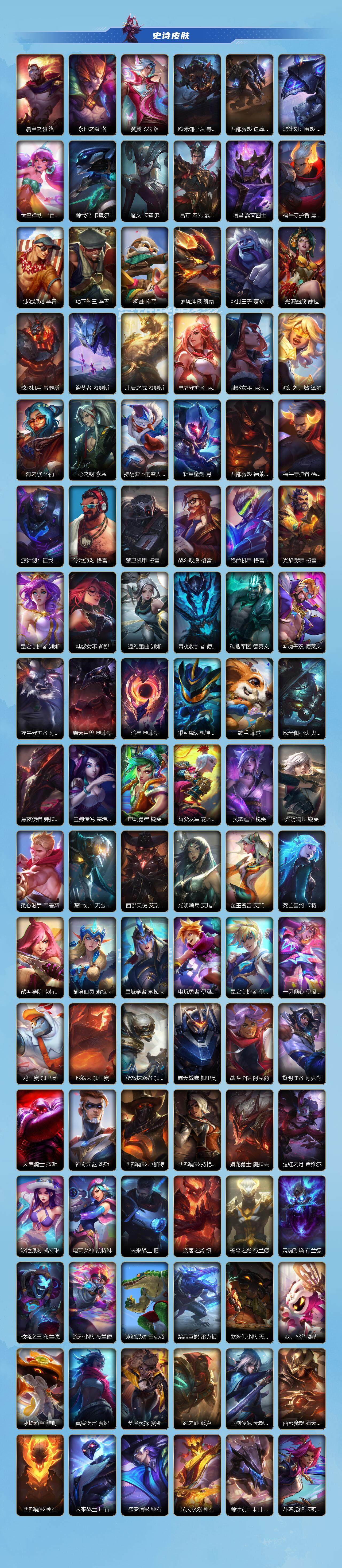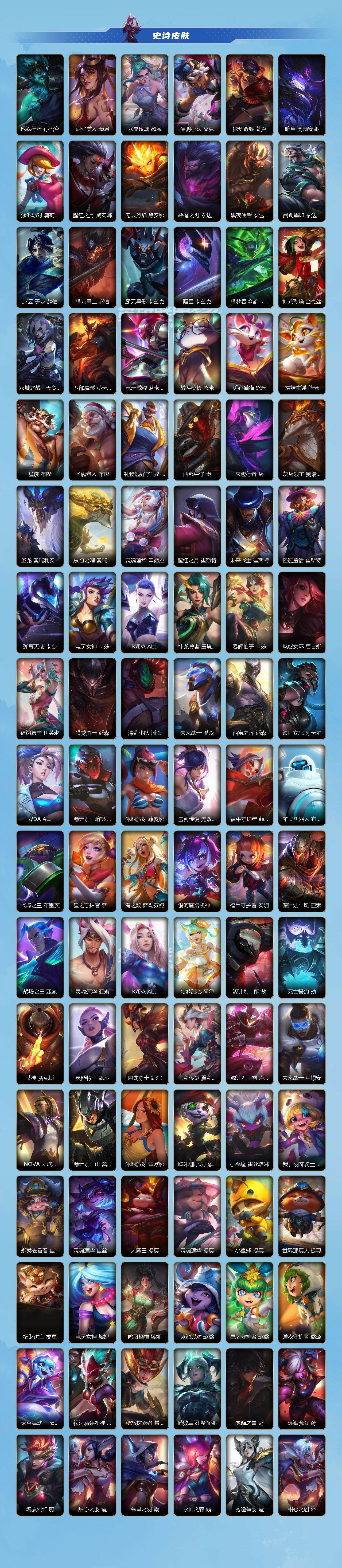 【史诗皮肤】 钢铁军团盖伦 张辽 文远 星之守护者拉克丝 殇之机器人阿木木 地狱火阿木木 霸天战士-雷恩加尔 丧尸努努和威朗普 美猴王 暗星奥莉安娜 泳池派对奥利安娜 腥红之月戴安娜 无限烈焰戴安娜 恶魔之刃泰达米尔 赵云 子龙 猎龙勇士赵信 霸天异形-卡兹克 暗星卡兹克 神龙烈焰 觅心猫猫 灰烬领主奥瑞利安索尔 腥红之月崔斯特 弹幕天使卡莎 猎龙勇士潘森 铁血女忍阿卡丽 泳池派对菲奥娜 福牛守护者菲奥娜 苹果机器人布里茨 战场之王布里茨 福牛守护者安妮 源计划风亚索 源计划阴劫 死亡誓约劫 武神贾克斯 源计划山蕾欧娜 泳池派对蕾欧娜 小恶魔崔丝塔娜 大魔王提莫 泳池派对璐璐 星之守护者璐璐 虎痴之拳 甜心之羽 暮星之羽霞 甜心之翎 晨星之翎洛 源代码卡蜜尔 暗星嘉文四世 福牛守护者嘉文四世 泳池派对李青 地下拳王李青 柯基库奇 斩星魔剑 福牛守护者德莱厄斯 禁卫机甲格雷福斯 战斗教授格雷福斯 星之守护者迦娜 灵魂收割者德莱文 福牛守护者阿利斯塔 霸天巨兽墨菲特 银河魔装机神菲兹 绒毛菲兹 电玩勇者瑞文 觅心射手-维鲁斯 死亡誓约卡特琳娜 战斗学院卡特琳娜 星域学者索拉卡 星之守护者伊泽瑞尔 苍穹之光布兰德 灵魂烈焰布兰德 泳池派对雷克顿 真实伤害赛娜 未来战士锤石