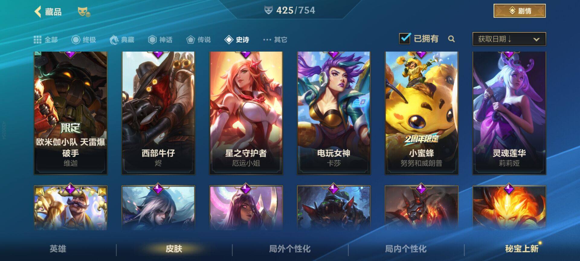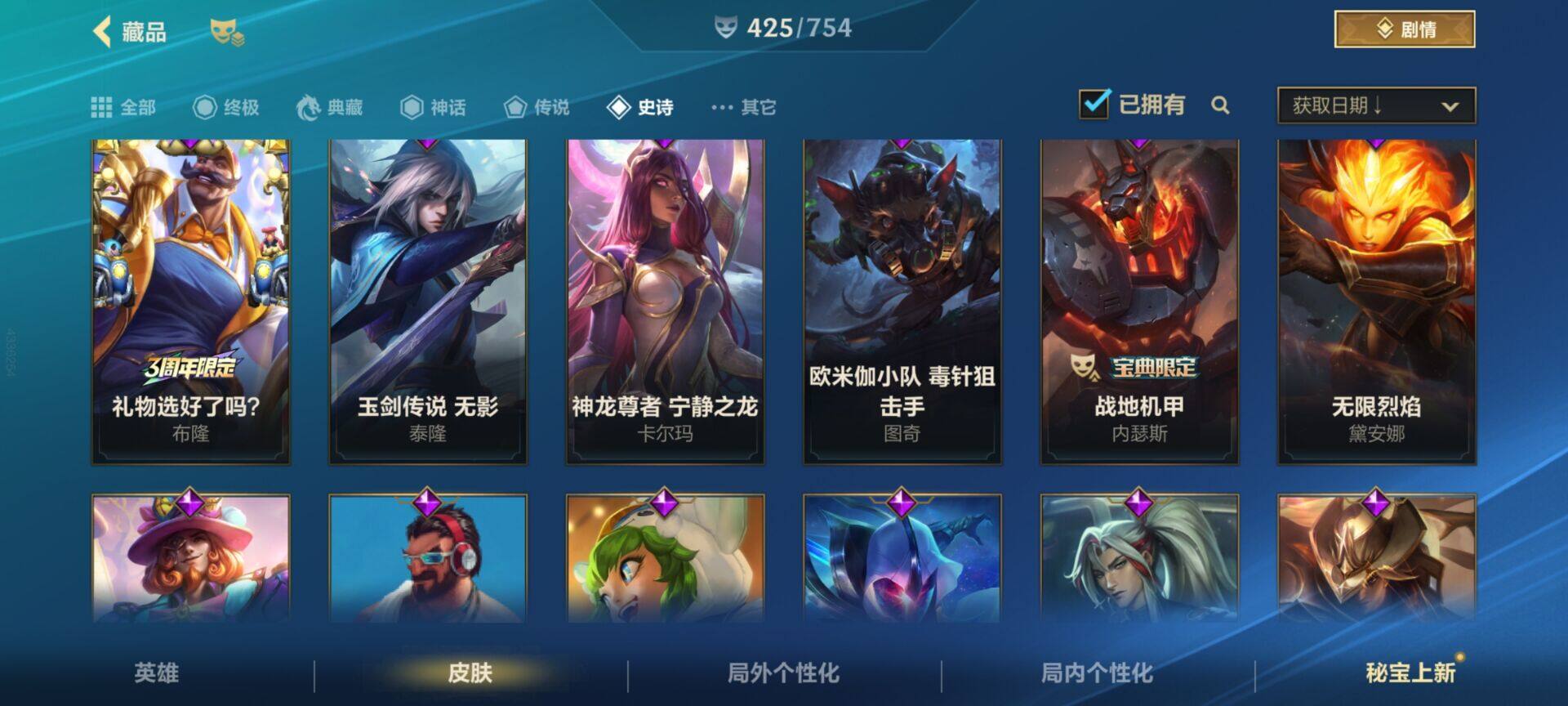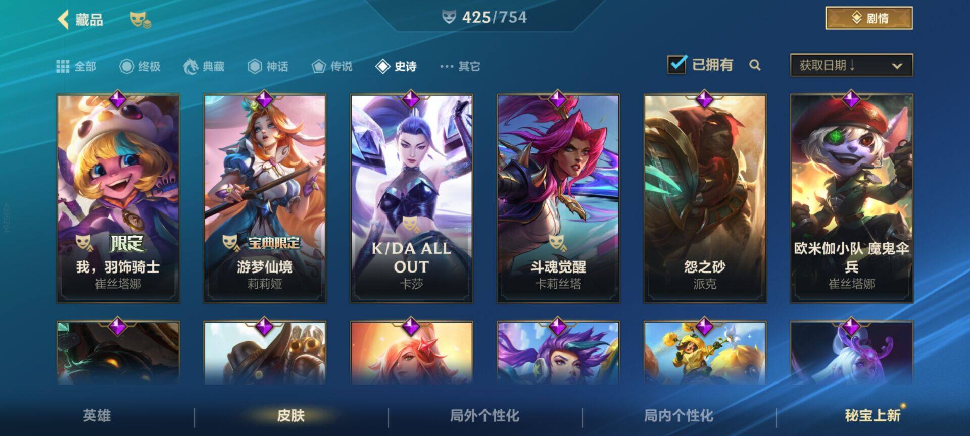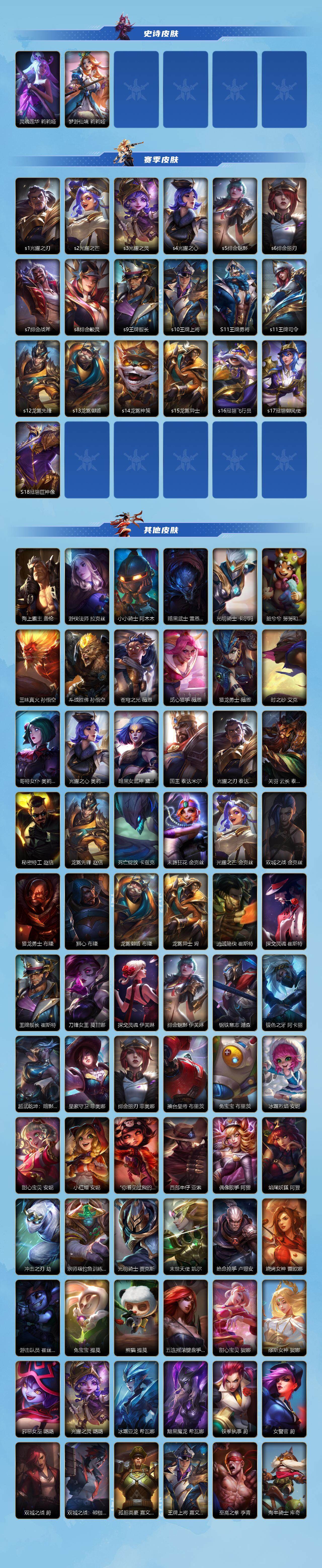【史诗皮肤】 钢铁军团盖伦 张辽 文远 星之守护者拉克丝 殇之机器人阿木木 地狱火阿木木 霸天战士-雷恩加尔 丧尸努努和威朗普 美猴王 暗星奥莉安娜 泳池派对奥利安娜 腥红之月戴安娜 无限烈焰戴安娜 恶魔之刃泰达米尔 赵云 子龙 猎龙勇士赵信 霸天异形-卡兹克 暗星卡兹克 神龙烈焰 觅心猫猫 灰烬领主奥瑞利安索尔 腥红之月崔斯特 弹幕天使卡莎 猎龙勇士潘森 铁血女忍阿卡丽 泳池派对菲奥娜 福牛守护者菲奥娜 苹果机器人布里茨 战场之王布里茨 福牛守护者安妮 源计划风亚索 源计划阴劫 死亡誓约劫 武神贾克斯 源计划山蕾欧娜 泳池派对蕾欧娜 小恶魔崔丝塔娜 大魔王提莫 泳池派对璐璐 星之守护者璐璐 虎痴之拳 甜心之羽 暮星之羽霞 甜心之翎 晨星之翎洛 源代码卡蜜尔 暗星嘉文四世 福牛守护者嘉文四世 泳池派对李青 地下拳王李青 柯基库奇 斩星魔剑 福牛守护者德莱厄斯 禁卫机甲格雷福斯 战斗教授格雷福斯 星之守护者迦娜 灵魂收割者德莱文 福牛守护者阿利斯塔 霸天巨兽墨菲特 银河魔装机神菲兹 绒毛菲兹 电玩勇者瑞文 觅心射手-维鲁斯 死亡誓约卡特琳娜 战斗学院卡特琳娜 星域学者索拉卡 星之守护者伊泽瑞尔 苍穹之光布兰德 灵魂烈焰布兰德 泳池派对雷克顿 真实伤害赛娜 未来战士锤石