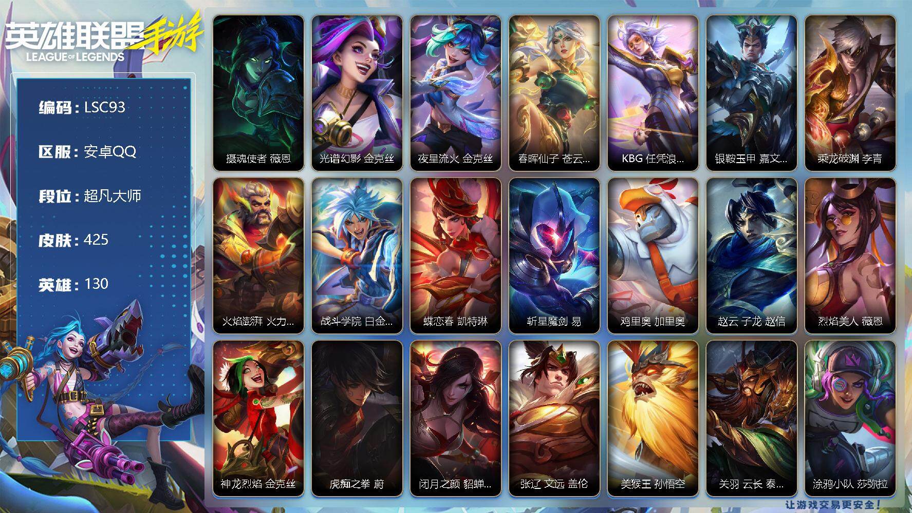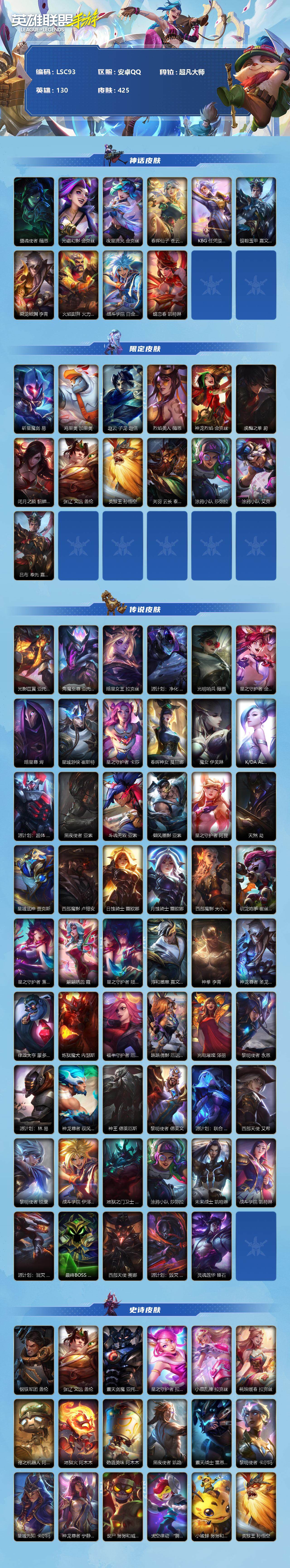 【LSC93】130英雄/425皮肤/10神话/53传说/223史诗/超凡大师/摄魂使者 薇恩/光谱幻影金克丝/夜星流火 金克丝/春晖仙子 苍云缥缈 卡莎/KBG 任凭浪起 破浪 菲奥娜/银鞍玉甲 嘉文四世/乘龙破渊 李青/火焰澎湃 火力全开 格雷福斯/EZ白金学长/蝶恋春女警/斩星魔剑 易/鸡里奥 加里奥/赵云 子龙 赵信/烈焰美人 薇恩/神龙烈焰 金克丝/虎痴之拳 蔚/闭月之颜 貂蝉 卡特琳娜/张辽 文远 盖伦/美猴王 孙悟空/关羽 云长 泰达米尔/涂鸦小队 莎弥拉/涂鸦小队 艾克/吕布 奉先 嘉文四世/光影巨翼 亚托克斯/海魔至尊 亚托克斯/暗星女王拉克丝/源计划-薇恩/光明哨兵薇恩/星之守护者金克丝/暗星尊 烬/星域游侠崔斯特/星之守护者 卡莎/春晖神女 莫甘娜/魔女 伊芙琳/K/DA-萨勒芬妮/源计划:超体 莫德凯撒/黑夜使者亚索/斗魂无双 亚索/御风墨影 亚索/星之守护者-阿狸/天煞劫/星域武神 贾克斯/西部魔影卢锡安/日蚀骑士 蕾欧娜/月蚀骑士 蕾欧娜/西部魔影 大小姐 蕾欧娜/驯龙炮手 崔丝塔娜/星之守护者 落 霞/翩翩绣蕊 霞/星之守护者 陨 洛/淳和墨意 嘉文四世/神拳-李青/神龙尊者 圣龙 李青/律政大亨/炼狱魔犬/福牛守护者女枪/跳跳倩影 厄运小姐/光电璀璨 泽丽/黎明使者 永恩/源计划:林 易/神龙尊者御风啸龙易/神王-德莱厄斯/黎明使者 德莱文/源计划联合艾希/西部天使 艾希/黎明使者瑞文/战斗学院伊泽瑞尔/地狱之门卫士/涂鸦小队莎弥拉/未来战士 凯特琳/战斗学院 凯特琳/源计划:泯灭 雷克顿/最终BOSS维迦/西部天使赛娜/源计划:毁灭 派克/灵魂莲华锤石/钢铁军团盖伦/张辽 文远/霸天剑魔 亚托克斯/星之守护者拉克丝/小鹿乱撞 拉克丝/桃映暖春 拉克丝/殇之机器人阿木木/地狱火阿木木/劲道美味 阿木木/黑夜使者 凯隐/霸天战士-雷恩加尔/黎明使者 卡尔玛/星域先知 卡尔玛/神龙尊者 宁静之龙 卡尔玛/丧尸努努和威朗普/太空律动 “舞林双子” 努努和威朗普/小蜜蜂 努努和威朗普/美猴王/地狱行者 孙悟空/水晶玫瑰 薇恩/探梦奇旅 艾克/暗星奥莉安娜/泳池派对奥利安娜/腥红之月戴安娜/无限烈焰戴安娜/恶魔之刃泰达米尔/黑夜使者 泰达米尔/端劲墨印 泰达米尔/赵云 子龙/猎龙勇士赵信/霸天异形-卡兹克/暗星卡兹克/猎梦吞噬者 卡兹克/神龙烈焰/双城之战:天资 金克丝/西部魔影 赫卡里姆/电玩战魂 赫卡里姆/战斗校长 悠米/觅心猫猫/烘焙童谣 悠米/猛虎 布隆/圣诞老人 布隆/礼物选好了吗? 布隆/西部牛仔 烬/灭迹行者 烬/灰烬领主奥瑞利安索尔/圣龙 奥瑞利安·索尔/东恒之曜 奥瑞利安·索尔/灵魂莲华 辛德拉/腥红之月崔斯特/未来战士 崔斯特/怪诞童话 崔斯特/弹幕天使卡莎/电玩女神 卡莎/K/DA-卡莎/神龙尊者 玉境灵龙 卡莎/春晖仙子 卡莎/魅惑女巫 莫甘娜/福纳康宁 伊芙琳/猎龙勇士潘森/清剿小队 潘森/未来战士 潘森/西宙之晖 潘森/铁血女忍阿卡丽/K/DA-阿卡丽/源计划-阿卡丽/泳池派对菲奥娜/玉剑传说 无双 菲奥娜/福牛守护者菲奥娜/苹果机器人布里茨/战场之王布里茨/星之守护者-萨勒芬妮/海之歌 萨勒芬妮/银河魔装机神 安妮/福牛守护者安妮/源计划风亚索/战场之王 亚索/灵魂莲华 亚索/K/DA-阿狸/幻梦甜心 阿狸/源计划阴劫/死亡誓约劫/武神贾克斯/灵能特工 凯尔/屠龙勇士 凯尔/玉剑传说 翼剑仙 凯尔/源计划:雷 卢锡安/未来战士 卢锡安/NOVA 天赋觉醒 卢锡安/源计划山蕾欧娜/泳池派对蕾欧娜/欧米伽小队 魔鬼伞兵 崔丝塔娜/小恶魔崔丝塔娜/我,羽饰骑士 崔丝塔娜/娜就去看看 崔丝塔娜/灵魂莲华 崔丝塔娜/大魔王提莫/灵魂莲华 提莫/小蜜蜂 提莫/世界那莫大 提莫/招财进宝 提莫/电玩女神 娑娜/鸣凤栖梧 娑娜/泳池派对璐璐/星之守护者璐璐/睡衣守护者 璐璐/太空律动 “节奏幻师” 璐璐/银河魔装机神 希瓦娜/秘旅探索者 希瓦娜/破败军团 希瓦娜/虎痴之拳/炼狱魔女 蔚/燎原烈焰 蔚/甜心之羽/暮星之羽霞/永恒之森 霞/秀逸墨羽 霞/甜心之翎/晨星之翎洛/永恒之森 洛/翼翼飞花 洛/欧米伽小队 毒针狙击手 图奇/西部魔影 送葬人 图奇/源计划:匿影 图奇/太空律动 “百万调音” 格温/源代码卡蜜尔/魔女 卡蜜尔/暗星嘉文四世/福牛守护者嘉文四世/泳池派对李青/地下拳王李青/柯基库奇/梦境绅探 凯南/冰封王子 蒙多医生/光源盛放 婕拉/战地机甲 内瑟斯/盗梦者 内瑟斯/北辰之威 内瑟斯/星之守护者-厄运小姐/魅惑女巫 厄运小姐/源计划:燃 泽丽/海之歌 泽丽/心之钢 永恩/持胡萝卜的雪人 易/斩星魔剑/西部魔影 德莱厄斯/福牛守护者德莱厄斯/源计划:征伐 德莱厄斯/泳池派对 格雷福斯/禁卫机甲格雷福斯/战斗教授格雷福斯/绝命机甲 格雷福斯/光焰澎湃 格雷福斯/星之守护者迦娜/魅惑女巫 迦娜/温雅墨曲 迦娜/灵魂收割者德莱文/破败军团 德莱文/斗魂无双 德莱文/福牛守护者阿利斯塔/霸天巨兽墨菲特/暗星 墨菲特/银河魔装机神菲兹/绒毛菲兹/欧米伽小队 鬼影蛙人 菲兹/黑夜使者 弗拉基米尔/玉剑传说 寒潭夭夭 娜美/电玩勇者瑞文/替父从军 花木兰 锐雯/灵魂莲华 锐雯/光明哨兵 锐雯/觅心射手-维鲁斯/源计划:天眼 韦鲁斯/光明哨兵 艾瑞莉娅/金玉贺吉 艾瑞莉娅/死亡誓约卡特琳娜/战斗学院卡特琳娜/冬境仙灵 索拉卡/星域学者索拉卡/电玩勇者 伊泽瑞尔/星之守护者伊泽瑞尔/一见倾心 伊泽瑞尔/地狱火 加里奥/秘旅探索者 加里奥/霸天战鹰 加里奥/战斗学院 阿克尚/黎明使者 阿克尚/天启