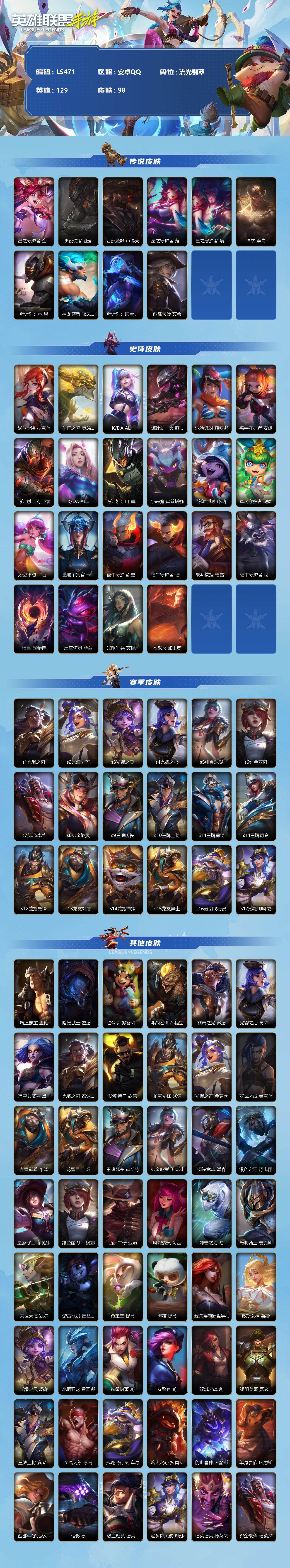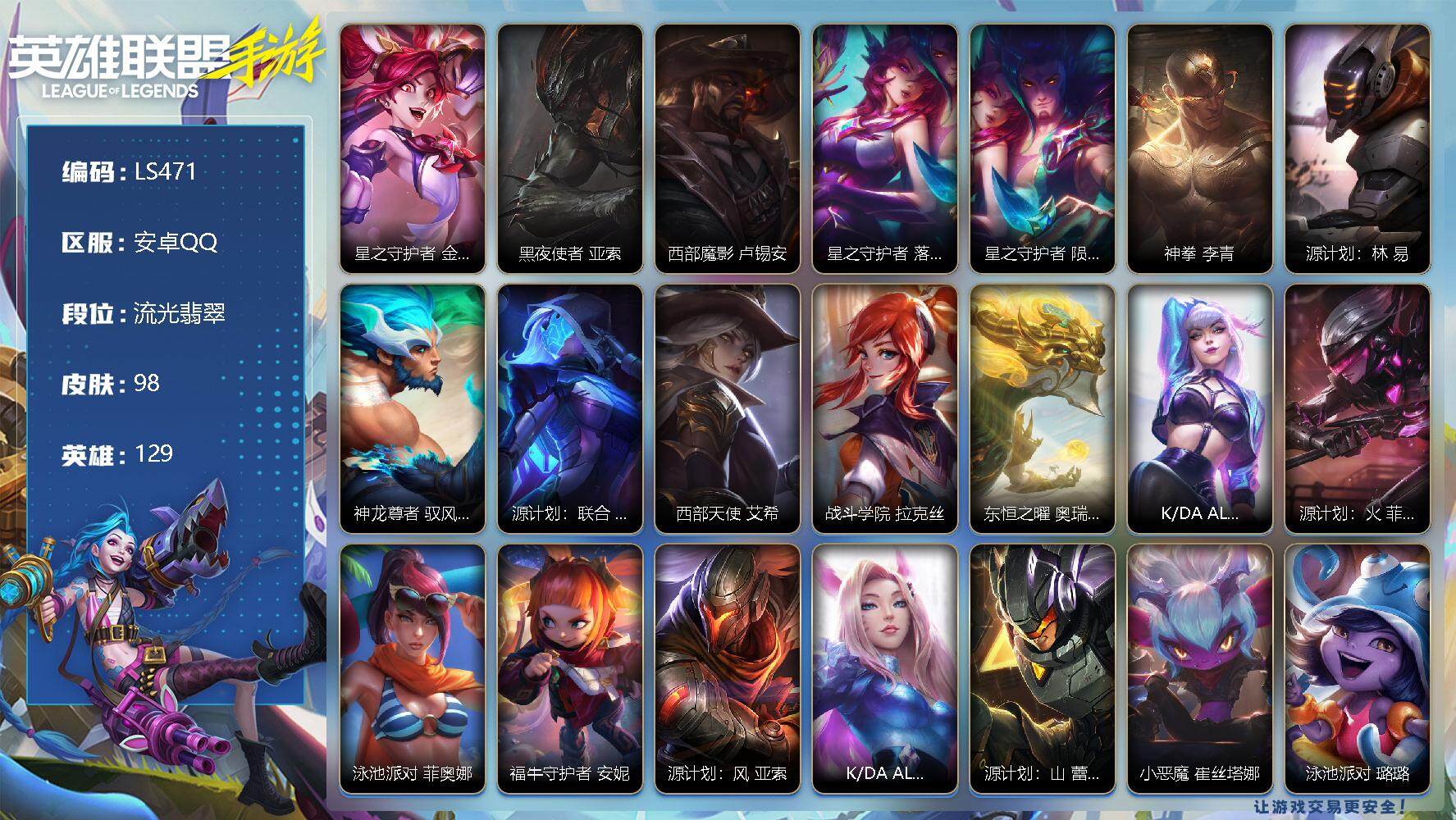 【LS471】129英雄/98皮肤/流光翡翠/星之守护者金克丝/黑夜使者亚索/西部魔影卢锡安/星之守护者 落 霞/星之守护者 陨 洛/神拳-李青/源计划:林 易/神龙尊者御风啸龙易/源计划联合艾希/西部天使 艾希/战斗学院拉克丝/东恒之曜 奥瑞利安·索尔/K/DA-伊芙琳/源计划-菲奥娜/泳池派对菲奥娜/福牛守护者安妮/源计划风亚索/K/DA-阿狸/源计划山蕾欧娜/小恶魔崔丝塔娜/泳池派对璐璐/星之守护者璐璐/太空律动 “百万调音” 格温/星域审判官卡蜜尔/福牛守护者嘉文四世/福牛守护者德莱厄斯/战斗教授格雷福斯/福牛守护者阿利斯塔/暗星 墨菲特/虚空海灵菲兹/光明哨兵 艾瑞莉娅/地狱火 加里奥/s1光耀之刃/s2光耀之芒/s3光耀之灵/s4光耀之心/s5绯金魅影/s6绯金丽刃/s7绯金战斧/s8绯金鮫灵/s9王牌舰长/s10王牌上将/S11王牌勇将/s11王牌司令/s12龙冕先锋/s13龙冕御盾/s14龙冕神策/s15龙冕异士/s16冠翎飞行员/s17冠翎御风使/海上霸主 盖伦/暗黑武士 雷恩加尔/脏兮兮 努努和威朗普/斗战胜佛 孙悟空/苍穹之光 薇恩/光耀之心 奥莉安娜/暗黑女武神 黛安娜/光耀之刃 泰达米尔/秘密特工 赵信/龙冕先锋 赵信/光耀之芒 金克丝/双城之战 金克丝/龙冕御盾 布隆/龙冕异士 烬/王牌舰长 崔斯特/绯金魅影 伊芙琳/钢铁意志 潘森/银色之牙 阿卡丽/皇家守卫 菲奥娜/绯金丽刃 菲奥娜/西部牛仔 亚索/风纪委员 阿狸/冲击之刃 劫/光明骑士 贾克斯/末世天使 凯尔/游击队员 崔丝塔娜/兔宝宝 提莫/熊猫 提莫/五连摇滚键盘手 娑娜/缪斯女神 娑娜/光耀之灵 璐璐/冰霜亚龙 希瓦娜/铁拳执事 蔚/女警官 蔚/双城之战 蔚/孤胆英豪 嘉文四世/王牌上将 嘉文四世/至高之拳 李青/冠翎飞行员 库奇/熔火之心 拉莫斯/创世魔神 内瑟斯/单身贵族 内瑟斯/西部牛仔 厄运小姐/暗影 易/热血班长 德莱厄斯/冠翎御风使 迦娜/德莱德莱 德莱文/绯金战斧 德莱文/极地女神 艾希/王牌司令 艾希/黑暗骑士 阿利斯塔/龙冕神策 吉格斯/飞车暴走族 古拉加斯/绯金鲛灵 娜美/冰霜之刃 艾瑞莉娅/蕉泥座人 索拉卡/冰川勇者 伊泽瑞尔/风执事 加里奥/光明之锤 杰斯/先驱行者 卡萨丁/黑暗骑士 奥拉夫/王牌勇将 奥拉夫/铁血狙击手 凯特琳/腥红之月 鬼武者 慎/枯萎之壤 雷克顿/鳄霸 雷克顿【二次实名: 可二次】
