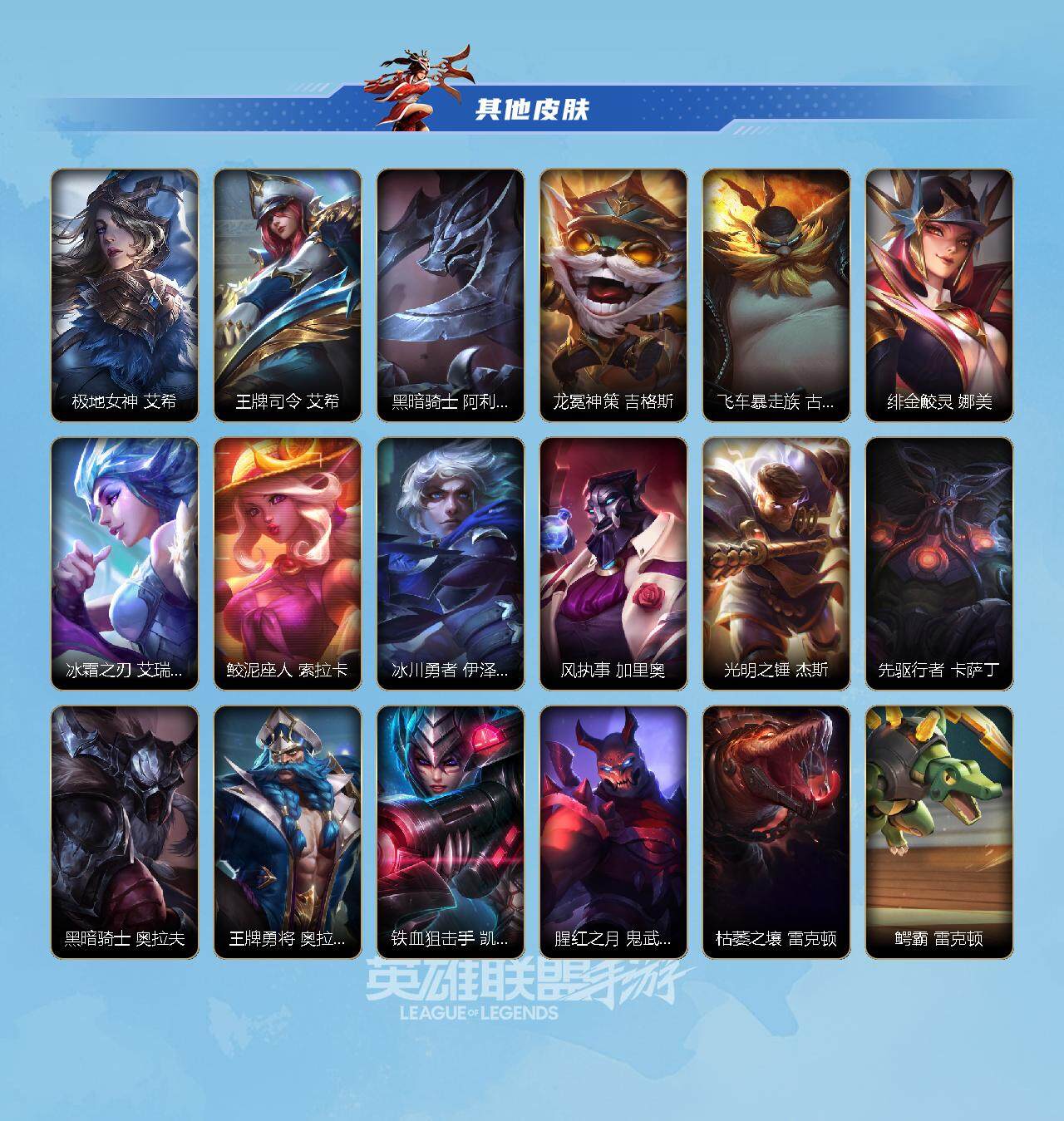 【史诗皮肤】 战斗学院拉克丝 泳池派对菲奥娜 福牛守护者安妮 源计划风亚索 源计划山蕾欧娜 小恶魔崔丝塔娜 泳池派对璐璐 星之守护者璐璐 星域审判官卡蜜尔 福牛守护者嘉文四世 福牛守护者德莱厄斯 战斗教授格雷福斯 福牛守护者阿利斯塔 虚空海灵菲兹