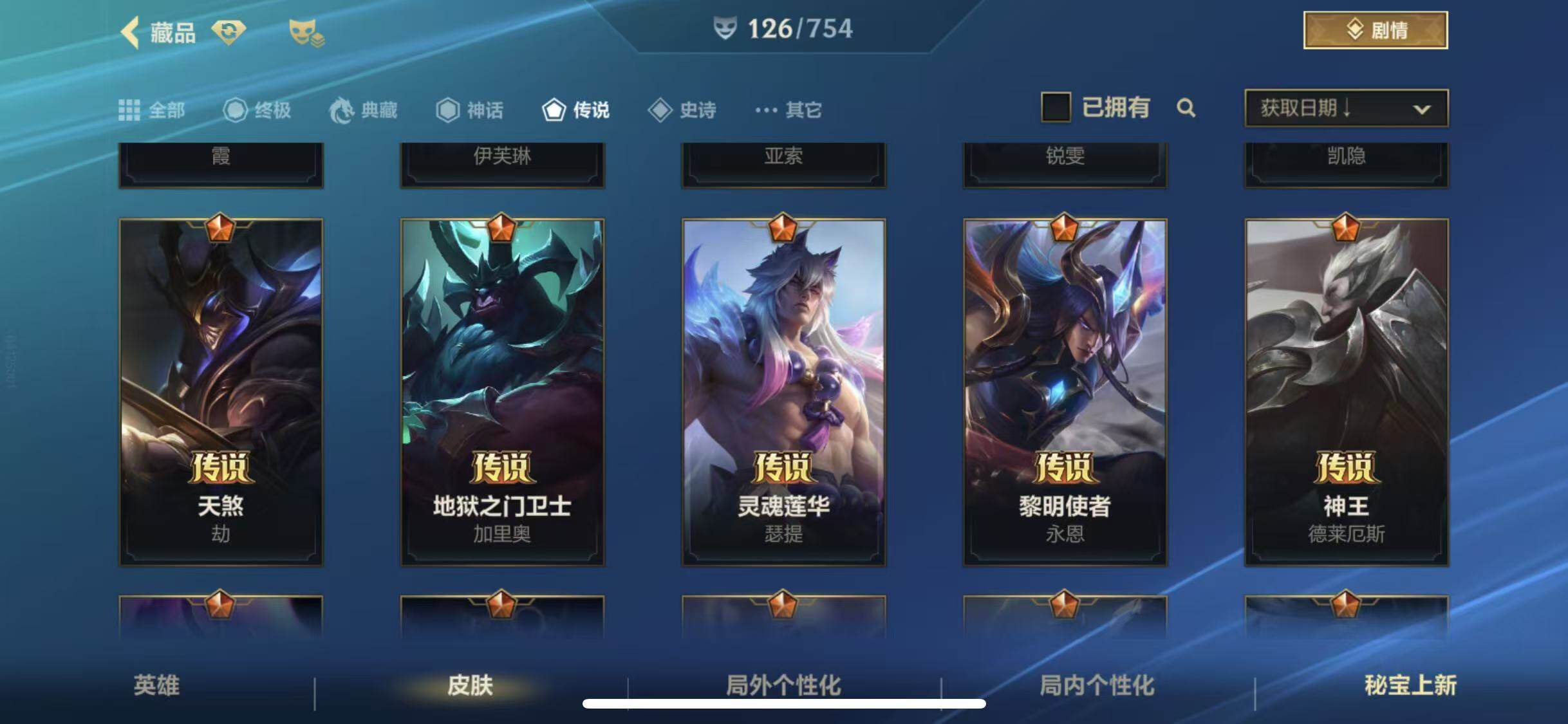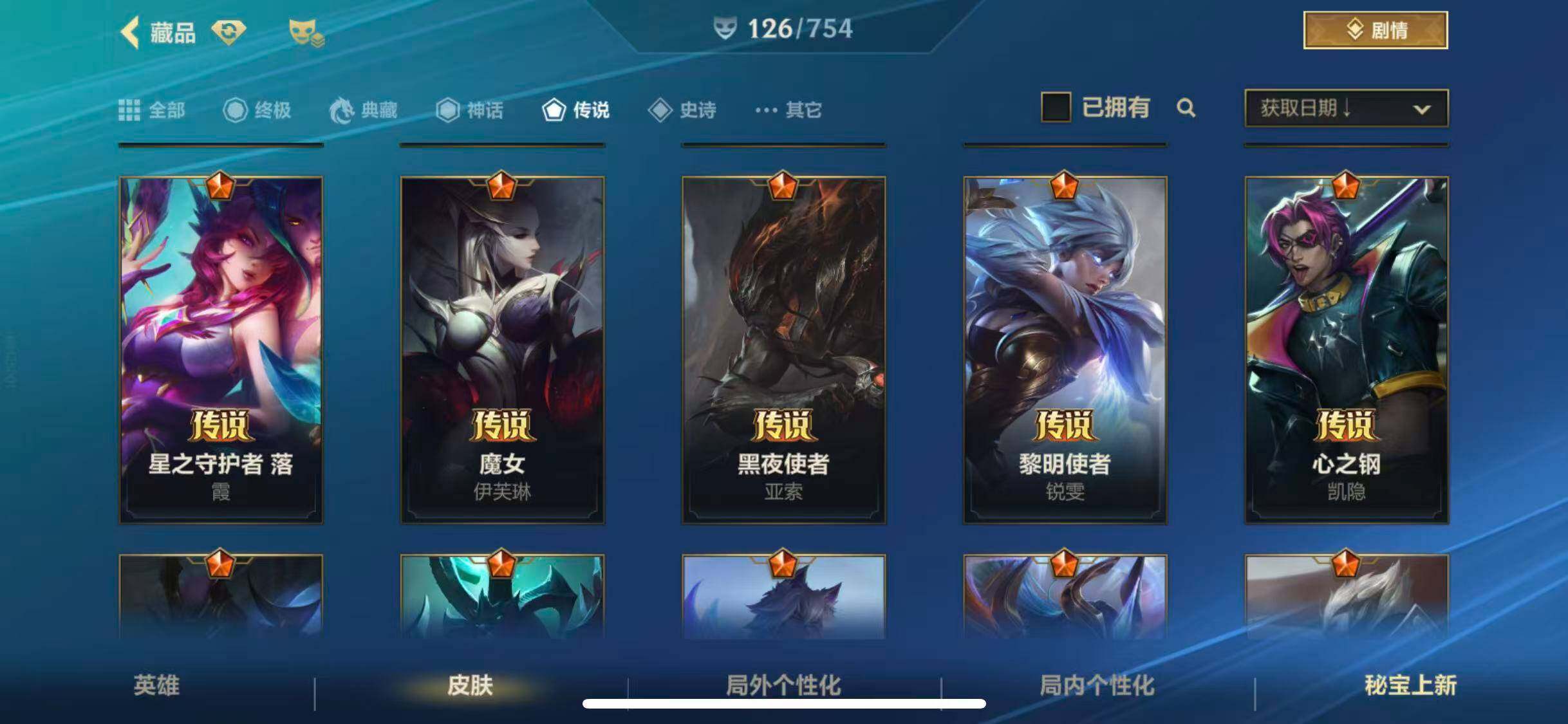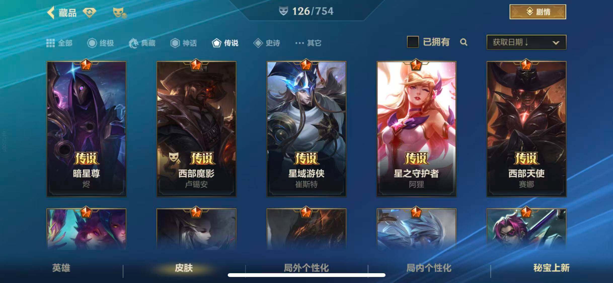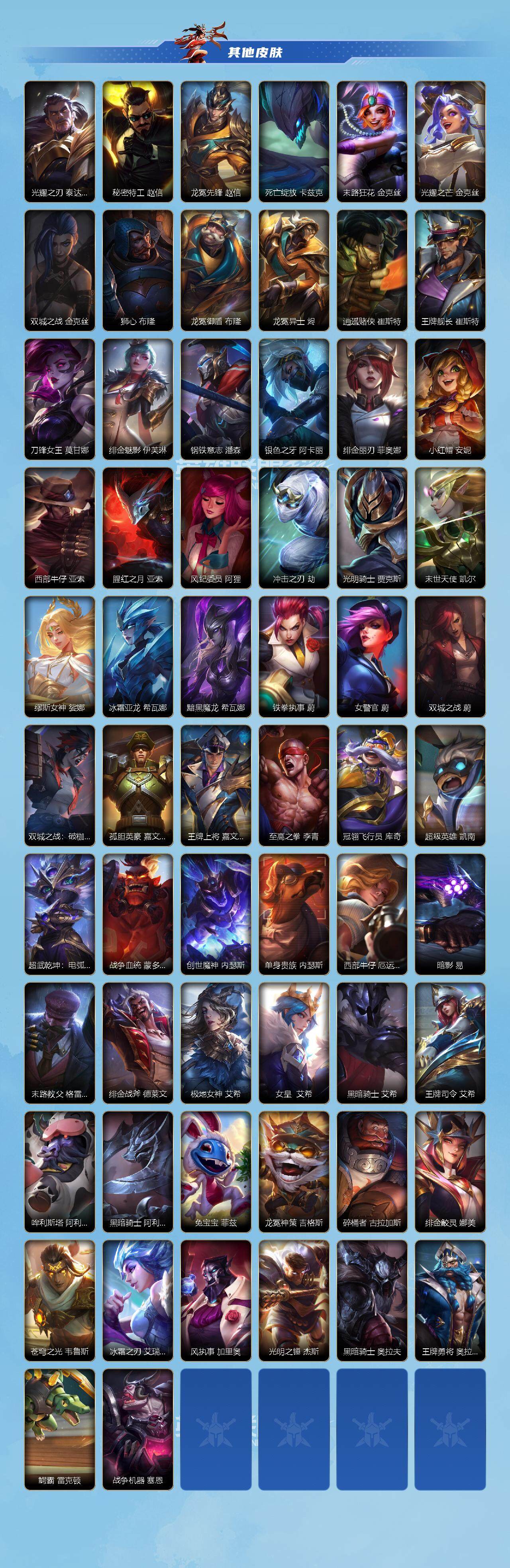 【传说皮肤】 星域游侠崔斯特 黑夜使者亚索 星之守护者-阿狸 天煞劫 西部魔影卢锡安 神王德莱厄斯 黎明使者锐雯 地狱之门卫士 西部天使赛娜 K/DA-伊芙琳 K/DA-阿卡丽