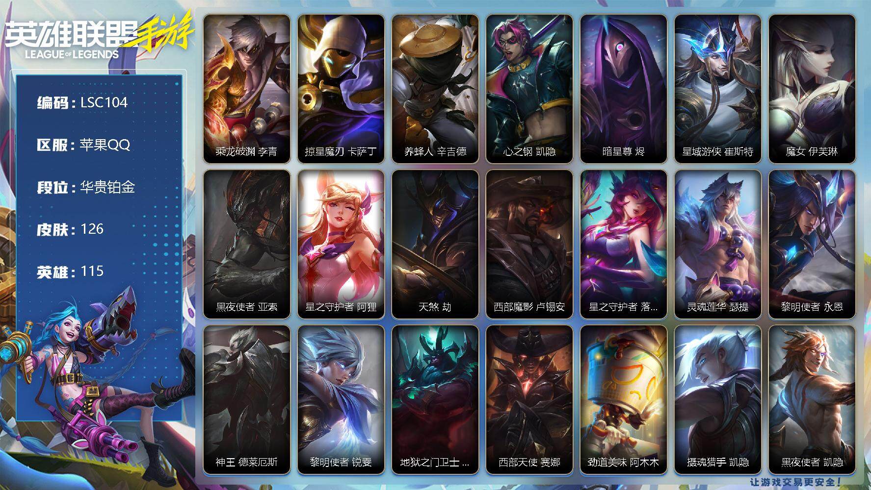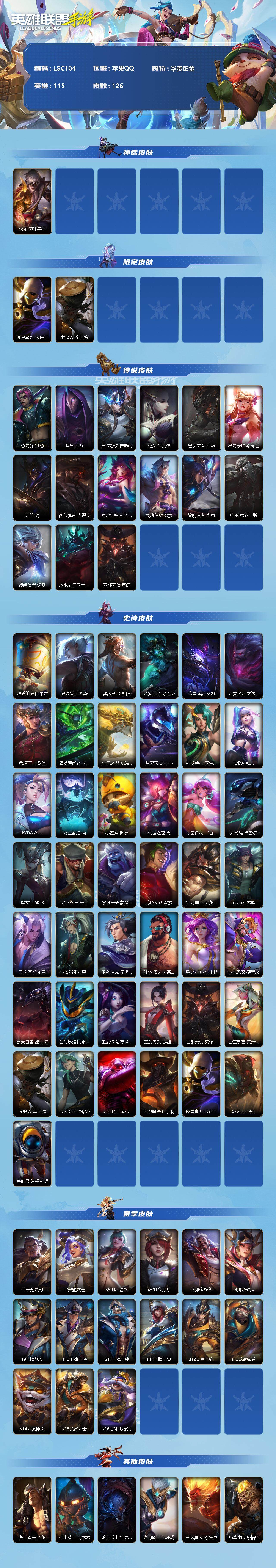 【LSC104】115英雄/126皮肤/1神话/15传说/42史诗/华贵铂金/乘龙破渊 李青/掠星魔刃 卡萨丁/养蜂人 辛吉德/心之钢 凯隐/暗星尊 烬/星域游侠崔斯特/魔女 伊芙琳/黑夜使者亚索/星之守护者-阿狸/天煞劫/西部魔影卢锡安/星之守护者 落 霞/灵魂莲华 瑟提/黎明使者 永恩/神王-德莱厄斯/黎明使者瑞文/地狱之门卫士/西部天使赛娜/劲道美味 阿木木/摄魂猎手 凯隐/黑夜使者 凯隐/地狱行者 孙悟空/暗星奥莉安娜/恶魔之刃泰达米尔/猛虎下山 赵信/猎梦吞噬者 卡兹克/东恒之曜 奥瑞利安·索尔/弹幕天使卡莎/神龙尊者 玉境灵龙 卡莎/K/DA-伊芙琳/K/DA-阿卡丽/死亡誓约劫/小蜜蜂 提莫/永恒之森 霞/太空律动 “百万调音” 格温/源代码卡蜜尔/魔女 卡蜜尔/地下拳王李青/冰封王子 蒙多医生/龙腾虎跃 瑟提/神龙尊者 炎龙 瑟提/心之钢 瑟提/灵魂莲华 永恩/心之钢 永恩/玉剑传说无极易/泳池派对 格雷福斯/星之守护者迦娜/斗魂无双 德莱文/霸天巨兽墨菲特/银河魔装机神菲兹/玉剑传说 寒潭夭夭 娜美/玉剑传说 武剑仙 锐雯/金玉贺吉 艾瑞莉娅/养蜂人/心之钢 伊泽瑞尔/天启骑士 杰斯/西部魔影 厄加特/怨之砂 派克/宇航员 诺提勒斯/s1光耀之刃/s2光耀之芒/s5绯金魅影/s6绯金丽刃/s7绯金战斧/s8绯金鮫灵/s9王牌舰长/s10王牌上将/S11王牌勇将/s11王牌司令/s12龙冕先锋/s13龙冕御盾/s14龙冕神策/s15龙冕异士/s16冠翎飞行员/海上霸主 盖伦/小小骑士 阿木木/暗黑武士 雷恩加尔/光明骑士 卡尔玛/三昧真火 孙悟空/斗战胜佛 孙悟空/光耀之刃 泰达米尔/秘密特工 赵信/龙冕先锋 赵信/死亡绽放 卡兹克/末路狂花 金克丝/光耀之芒 金克丝/双城之战 金克丝/狮心 布隆/龙冕御盾 布隆/龙冕异士 烬/逍遥赌侠 崔斯特/王牌舰长 崔斯特/刀锋女王 莫甘娜/绯金魅影 伊芙琳/钢铁意志 潘森/银色之牙 阿卡丽/绯金丽刃 菲奥娜/小红帽 安妮/西部牛仔 亚索/腥红之月 亚索/风纪委员 阿狸/冲击之刃 劫/光明骑士 贾克斯/末世天使 凯尔/缪斯女神 娑娜/冰霜亚龙 希瓦娜/黯黑魔龙 希瓦娜/铁拳执事 蔚/女警官 蔚/双城之战 蔚/双城之战:破枷 蔚/孤胆英豪 嘉文四世/王牌上将 嘉文四世/至高之拳 李青/冠翎飞行员 库奇/超级英雄 凯南/超武乾坤:电弧 凯南/战争血统 蒙多医生/创世魔神 内瑟斯/单身贵族 内瑟斯/西部牛仔 厄运小姐/暗影 易/末路教父 格雷福斯/绯金战斧 德莱文/极地女神 艾希/女皇 艾希/黑暗骑士 艾希/王牌司令 艾希/哞利斯塔 阿利斯塔/黑暗骑士 阿利斯塔/兔宝宝 菲兹/龙冕神策 吉格斯/碎桶者 古拉加斯/绯金鲛灵 娜美/苍穹之光 韦鲁斯/冰霜之刃 艾瑞莉娅/风执事 加里奥/光明之锤 杰斯/黑暗骑士 奥拉夫/王牌勇将 奥拉夫/鳄霸 雷克顿/战争机器 赛恩【二次实名: 不可二次】