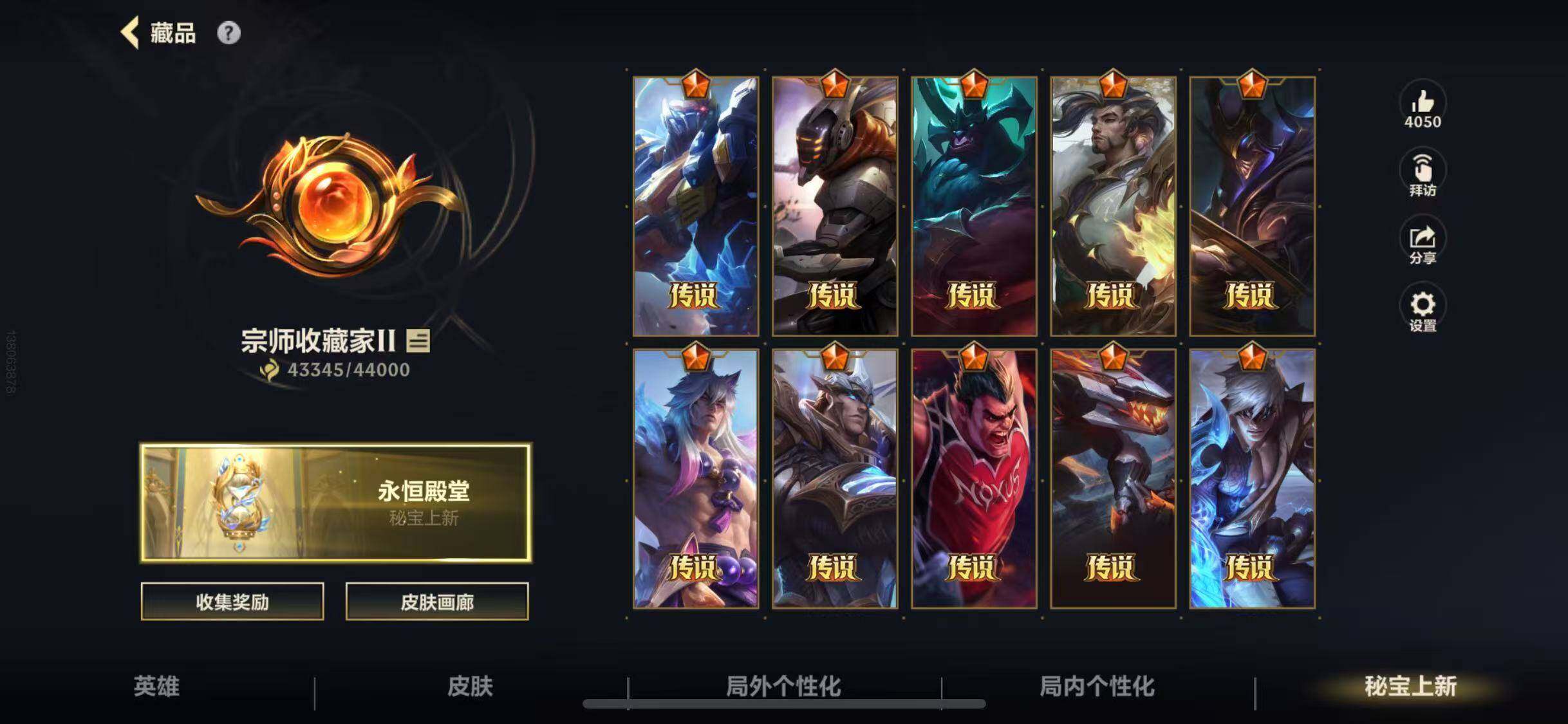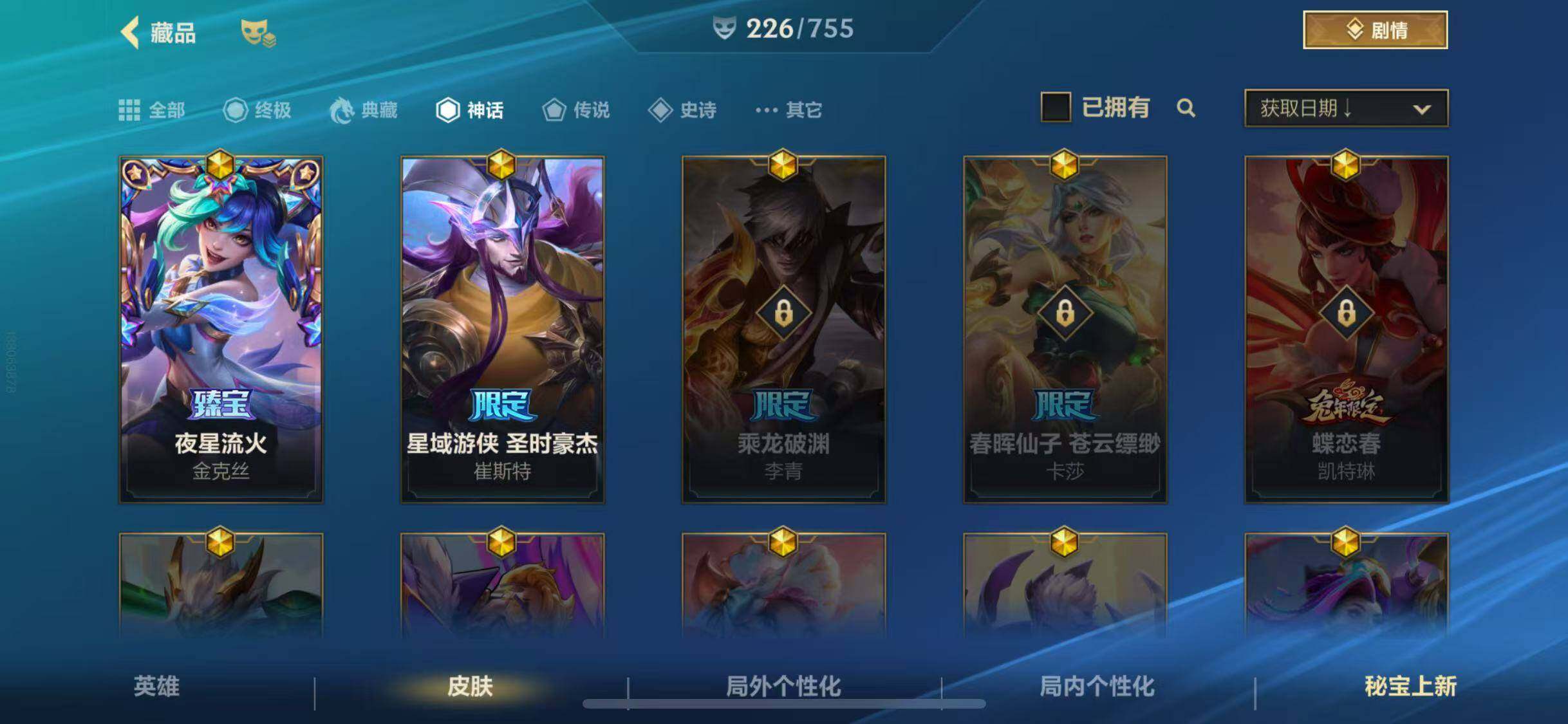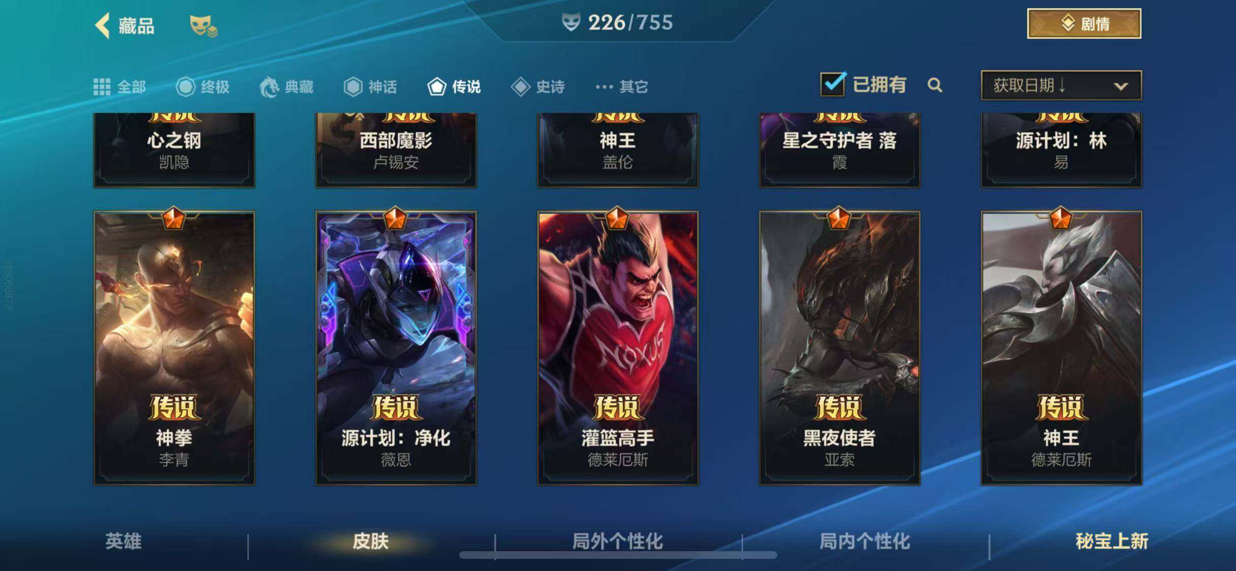 神话:夜星流火金克丝,星域游侠 圣时豪杰 崔斯特,夜星流火 金克丝,神王 盖伦,心之钢 凯隐,神龙尊者 昼日真龙 亚索,天煞 劫,西部魔影 卢锡安,星之守护者 辉 霞,霸天原祖 沃利贝尔,天棱快晴 伊泽瑞尔,星域游侠 崔斯特,地狱之门卫士 加里奥,跳跳倩影 厄运小姐,日蚀骑士 蕾欧娜,黎明使者 锐雯,灌篮高手 德莱厄斯,灵魂莲华 瑟提,源计划:泯灭 雷克顿,星之守护者 金克丝,黑夜使者 泰达米尔,猛虎下山 赵信,平湖秋月 黛安娜,沧浪破云 泰达米尔,焕影迎春 佐伊,天棱信风 奥莉安娜,腥红之月 黛安娜,涂鸦小队 金克丝,咖啡甜心 佐伊,喵喵魅影金克丝,黑夜使者 凯隐,黎明使者 卡尔玛,神龙尊者 宁静之龙 卡尔玛,殇之机器人 阿木木,小蜜蜂 努努和威朗普,s3光耀之灵,s16冠翎飞行员,s17冠翎御风使,S11王牌勇将,s9王牌舰长,s15龙冕异士,s14龙冕神策,s11王牌司令,s5绯金魅影【二次实名: 可二次】
