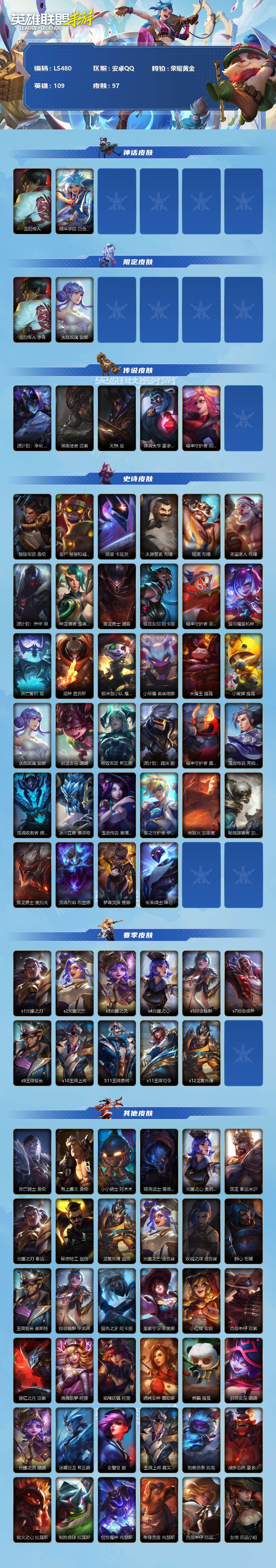 【LS480】109英雄/97皮肤/1神话/3传说/荣耀黄金/龙的传人 李青/EZ白金学长/水晶玫瑰 娑娜/源计划-薇恩/黑夜使者亚索/天煞劫/律政大亨/福牛守护者女枪/钢铁军团盖伦/丧尸努努和威朗普/暗星卡兹克/末路管家布隆/猛虎 布隆/圣诞老人 布隆/源计划-烬/神龙尊者 玉境灵龙 卡莎/猎龙勇士潘森/铁血女忍阿卡丽/福牛守护者菲奥娜/银河魔装机神 安妮/死亡誓约劫/武神贾克斯/欧米伽小队 魔鬼伞兵 崔丝塔娜/小恶魔崔丝塔娜/大魔王提莫/小蜜蜂 提莫/水晶玫瑰琴女/驯龙女巫 璐璐/破败军团 希瓦娜/源计划裁决蔚/福牛守护者嘉文四世/玉剑传说无极易/灵魂收割者德莱文/冰川巨兽墨菲特/玉剑传说 寒潭夭夭 娜美/星之守护者伊泽瑞尔/地狱火 加里奥/秘旅探索者 加里奥/猎龙勇士 奥拉夫/灵魂烈焰布兰德/梦境灵探 赛娜/未来战士锤石/s1光耀之刃/s2光耀之芒/s3光耀之灵/s4光耀之心/s5绯金魅影/s7绯金战斧/s9王牌舰长/s10王牌上将/S11王牌勇将/s11王牌司令/s12龙冕先锋/死亡骑士 盖伦/海上霸主 盖伦/小小骑士 阿木木/暗黑武士 雷恩加尔/光耀之心 奥莉安娜/国王 泰达米尔/光耀之刃 泰达米尔/秘密特工 赵信/龙冕先锋 赵信/光耀之芒 金克丝/双城之战 金克丝/狮心 布隆/王牌舰长 崔斯特/绯金魅影 伊芙琳/银色之牙 阿卡丽/皇家守卫 菲奥娜/小红帽 安妮/西部牛仔 亚索/腥红之月 亚索/偶像歌手 阿狸/焰尾妖狐 阿狸/烧烤女神 蕾欧娜/熊猫 提莫/邪恶女巫 璐璐/光耀之灵 璐璐/冰霜亚龙 希瓦娜/女警官 蔚/王牌上将 嘉文四世/刺客信条 凯南/战争血统 蒙多医生/熔火之心 拉莫斯/制胜金球 拉莫斯/创世魔神 内瑟斯/单身贵族 内瑟斯/西部牛仔 厄运小姐/女帝 厄运小姐/暗影 易/暴风女神 迦娜/德莱德莱 德莱文/绯金战斧 德莱文/极地女神 艾希/王牌司令 艾希/科学狂人 吉格斯/飞车暴走族 古拉加斯/河水之灵 娜美/迅箭 韦鲁斯/莲花之令 艾瑞莉娅/炼金狂士 辛吉德/蕉泥座人 索拉卡/冰川勇者 伊泽瑞尔/风执事 加里奥/先驱行者 卡萨丁/铁哥们儿 奥拉夫/王牌勇将 奥拉夫/鳄霸 雷克顿/穿着正装的恶魔 维迦【二次实名: 可二次】