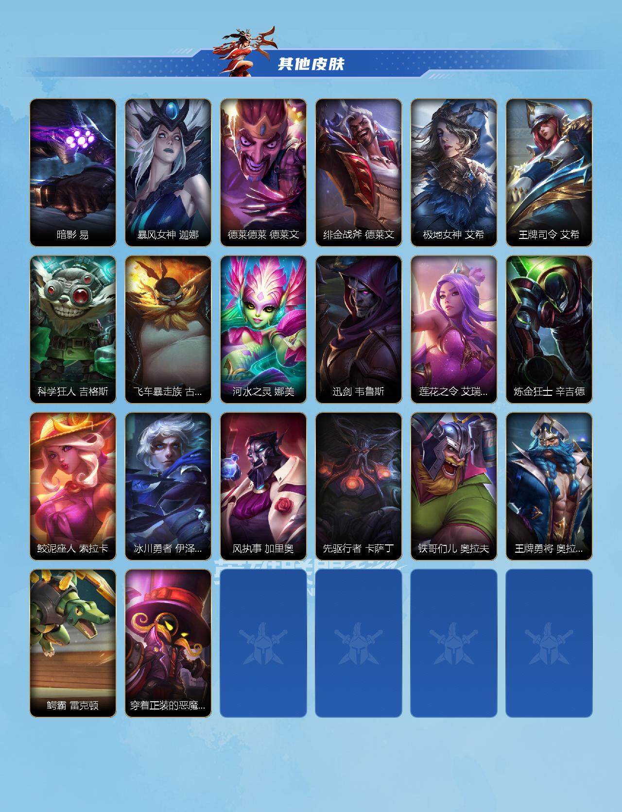 【史诗皮肤】 钢铁军团盖伦 丧尸努努和威朗普 暗星卡兹克 末路管家布隆 猎龙勇士潘森 铁血女忍阿卡丽 福牛守护者菲奥娜 死亡誓约劫 武神贾克斯 小恶魔崔丝塔娜 大魔王提莫 水晶玫瑰琴女 源计划裁决蔚 福牛守护者嘉文四世 玉剑传说无极易 灵魂收割者德莱文 冰川巨兽墨菲特 星之守护者伊泽瑞尔 灵魂烈焰布兰德 未来战士锤石