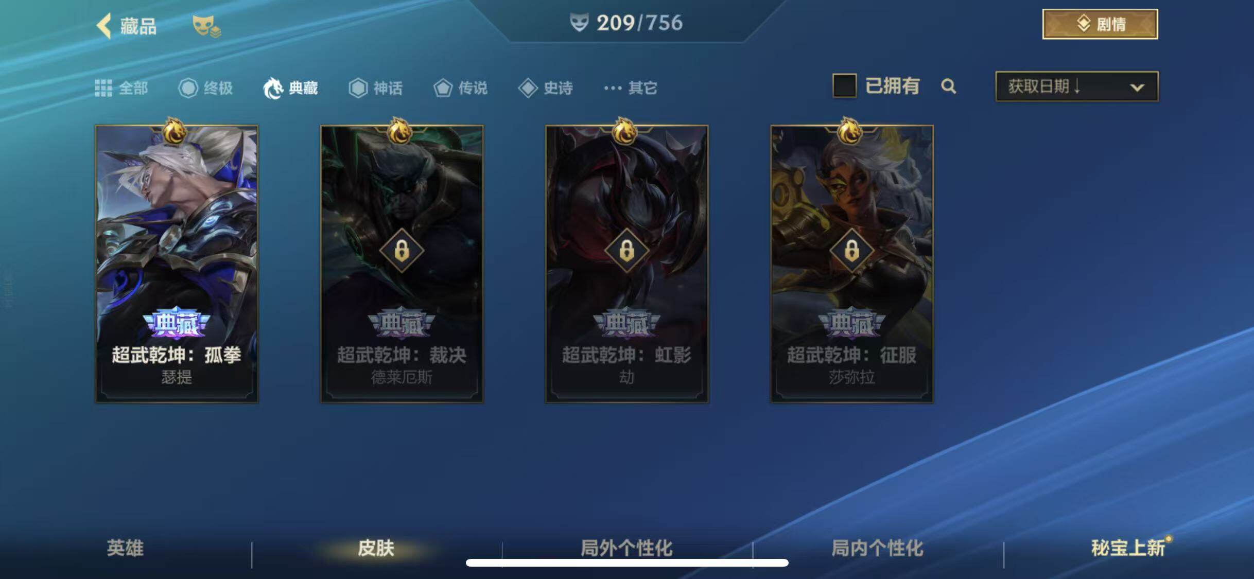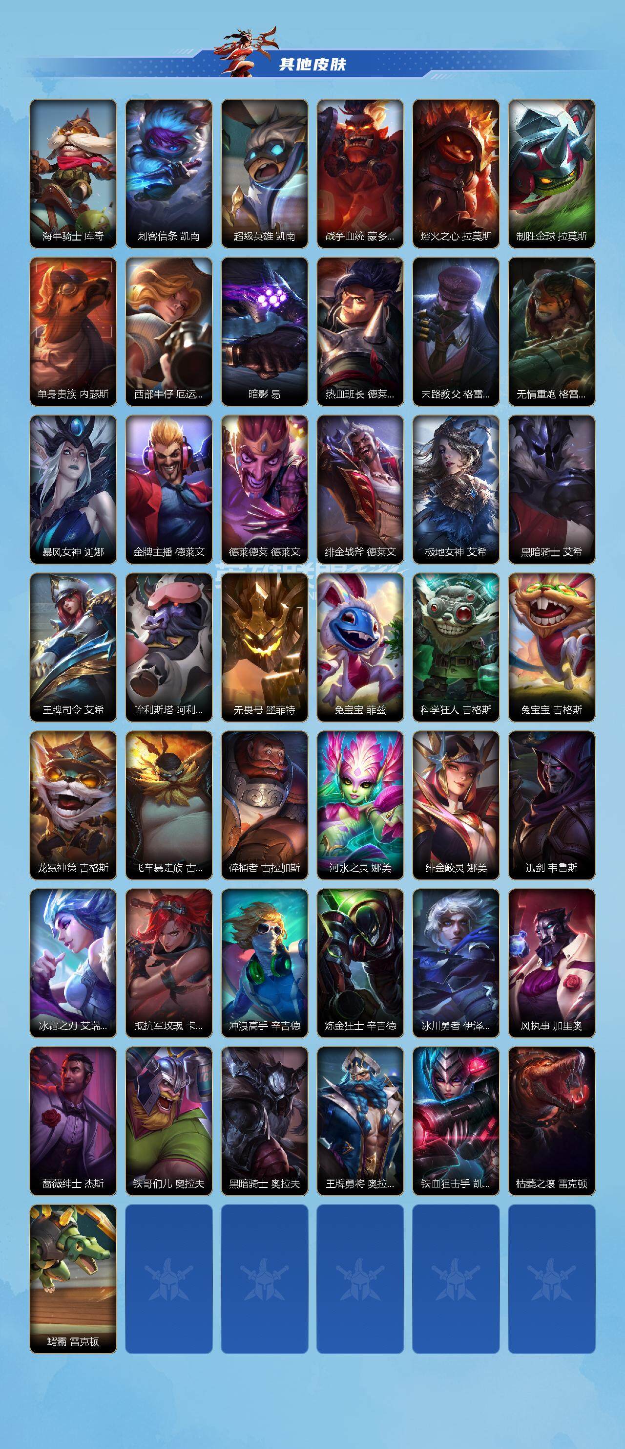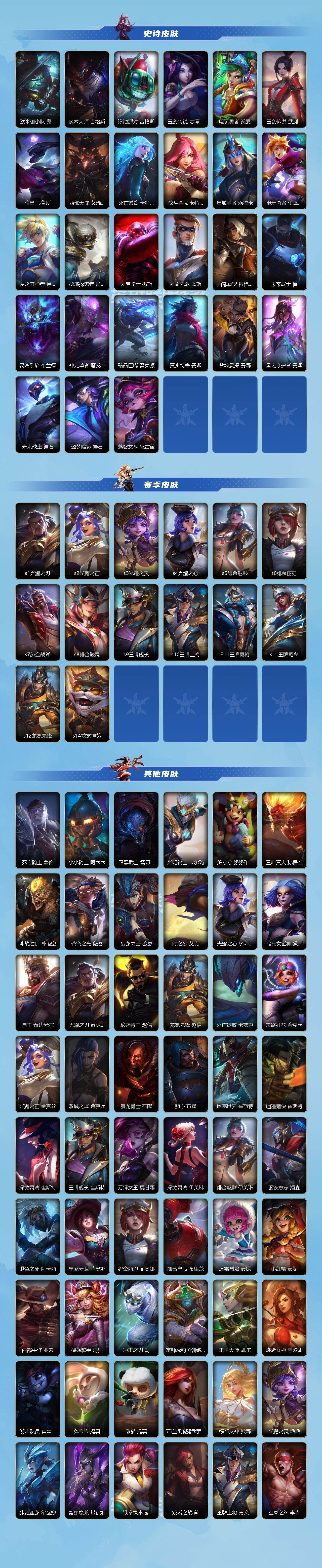【史诗皮肤】 钢铁军团盖伦 殇之机器人阿木木 霸天战士-雷恩加尔 暗星奥莉安娜 腥红之月戴安娜 无限烈焰戴安娜 猎龙勇士赵信 霸天异形-卡兹克 腥红之月烬 霸天龙神奥瑞利安索尔 腥红之月崔斯特 泳池派对菲奥娜 福牛守护者菲奥娜 战场之王布里茨 福牛守护者安妮 源计划阴劫 死亡誓约劫 源计划山蕾欧娜 泳池派对蕾欧娜 大魔王提莫 创星之灵 源计划裁决蔚 星域审判官卡蜜尔 暗星嘉文四世 福牛守护者嘉文四世 地下拳王李青 水晶玫瑰永恩 玉剑传说无极易 福牛守护者德莱厄斯 禁卫机甲格雷福斯 星之守护者迦娜 福牛守护者阿利斯塔 霸天巨兽墨菲特 虚空海灵菲兹 绒毛菲兹 奥术大师吉格斯 电玩勇者瑞文 暗星维鲁斯 死亡誓约卡特琳娜 战斗学院卡特琳娜 星域学者索拉卡 星之守护者伊泽瑞尔 灵魂烈焰布兰德 真实伤害赛娜 未来战士锤石