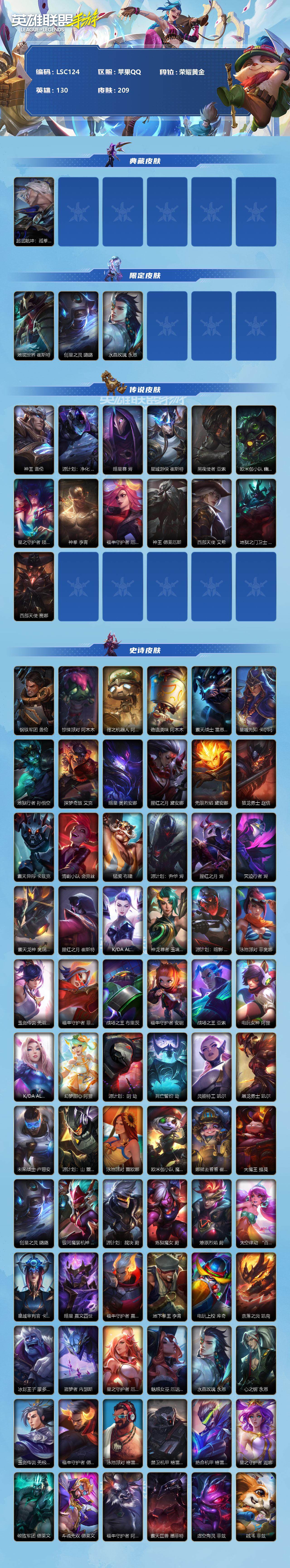 【LSC124】130英雄/209皮肤/1典藏/13传说/98史诗/荣耀黄金/超武乾坤:孤拳/地底世界 崔斯特/创星之灵 璐璐/水晶玫瑰 永恩/神王盖伦/源计划-薇恩/暗星尊 烬/星域游侠崔斯特/黑夜使者亚索/欧米伽小队 幽灵特工 提莫/星之守护者 陨 洛/神拳-李青/福牛守护者女枪/神王-德莱厄斯/西部天使 艾希/地狱之门卫士/西部天使赛娜/钢铁军团盖伦/惊悚派对 阿木木/殇之机器人阿木木/劲道美味 阿木木/霸天战士-雷恩加尔/星域先知 卡尔玛/地狱行者 孙悟空/探梦奇旅 艾克/暗星奥莉安娜/腥红之月戴安娜/无限烈焰戴安娜/猎龙勇士赵信/霸天异形-卡兹克/清剿小队 金克丝/猛虎 布隆/源计划-烬/腥红之月烬/灭迹行者 烬/霸天龙神奥瑞利安索尔/腥红之月崔斯特/K/DA-卡莎/神龙尊者 玉境灵龙 卡莎/源计划-阿卡丽/泳池派对菲奥娜/玉剑传说 无双 菲奥娜/福牛守护者菲奥娜/战场之王布里茨/福牛守护者安妮/战场之王 亚索/电玩女神 阿狸/K/DA-阿狸/幻梦甜心 阿狸/源计划阴劫/死亡誓约劫/灵能特工 凯尔/屠龙勇士 凯尔/未来战士 卢锡安/源计划山蕾欧娜/泳池派对蕾欧娜/欧米伽小队 魔鬼伞兵 崔丝塔娜/娜就去看看 崔丝塔娜/大魔王提莫/创星之灵/银河魔装机神 希瓦娜/源计划裁决蔚/炼狱魔女 蔚/燎原烈焰 蔚/太空律动 “百万调音” 格温/星域审判官卡蜜尔/暗星嘉文四世/福牛守护者嘉文四世/地下拳王李青/电玩上校 库奇/奈落之炎 凯南/冰封王子 蒙多医生/盗梦者 内瑟斯/星之守护者-厄运小姐/魅惑女巫 厄运小姐/水晶玫瑰永恩/心之钢 永恩/玉剑传说无极易/福牛守护者德莱厄斯/泳池派对 格雷福斯/禁卫机甲格雷福斯/绝命机甲 格雷福斯/星之守护者迦娜/破败军团 德莱文/斗魂无双 德莱文/福牛守护者阿利斯塔/霸天巨兽墨菲特/虚空海灵菲兹/绒毛菲兹/欧米伽小队 鬼影蛙人 菲兹/奥术大师吉格斯/泳池派对 吉格斯/玉剑传说 寒潭夭夭 娜美/电玩勇者瑞文/玉剑传说 武剑仙 锐雯/暗星维鲁斯/死亡誓约卡特琳娜/战斗学院卡特琳娜/星域学者索拉卡/电玩勇者 伊泽瑞尔/星之守护者伊泽瑞尔/秘旅探索者 加里奥/天启骑士 杰斯/神奇先驱 杰斯/西部魔影 持枪女巫 莎弥拉/未来战士 慎/灵魂烈焰布兰德/神龙尊者 魔龙 布兰德/黯晶巨鳄 雷克顿/真实伤害赛娜/梦境灵探 赛娜/星之守护者-赛娜/未来战士锤石/盗梦暗影 锤石/魅惑女巫 薇古丝/s1光耀之刃/s2光耀之芒/s3光耀之灵/s4光耀之心/s5绯金魅影/s6绯金丽刃/s7绯金战斧/s8绯金鮫灵/s9王牌舰长/s10王牌上将/S11王牌勇将/s11王牌司令/s12龙冕先锋/s14龙冕神策/死亡骑士 盖伦/小小骑士 阿木木/暗黑武士 雷恩加尔/光明骑士 卡尔玛/脏兮兮 努努和威朗普/三昧真火 孙悟空/斗战胜佛 孙悟空/苍穹之光 薇恩/猎龙勇士 薇恩/时之砂 艾克/光耀之心 奥莉安娜/暗黑女武神 黛安娜/国王 泰达米尔/光耀之刃 泰达米尔/秘密特工 赵信/龙冕先锋 赵信/死亡绽放 卡兹克/末路狂花 金克丝/光耀之芒 金克丝/双城之战 金克丝/猎龙勇士 布隆/狮心 布隆/逍遥赌侠 崔斯特/探戈灵魂 崔斯特/王牌舰长 崔斯特/刀锋女王 莫甘娜/探戈灵魂 伊芙琳/绯金魅影 伊芙琳/钢铁意志 潘森/银色之牙 阿卡丽/皇家守卫 菲奥娜/绯金丽刃 菲奥娜/擂台皇帝 布里茨/冰霜烈焰 安妮/小红帽 安妮/西部牛仔 亚索/偶像歌手 阿狸/冲击之刃 劫/宗师级钓鱼训练师 贾克斯/末世天使 凯尔/烧烤女神 蕾欧娜/游击队员 崔丝塔娜/兔宝宝 提莫/熊猫 提莫/五连摇滚键盘手 娑娜/缪斯女神 娑娜/光耀之灵 璐璐/冰霜亚龙 希瓦娜/黯黑魔龙 希瓦娜/铁拳执事 蔚/双城之战 蔚/王牌上将 嘉文四世/至高之拳 李青/海牛骑手 库奇/刺客信条 凯南/超级英雄 凯南/战争血统 蒙多医生/熔火之心 拉莫斯/制胜金球 拉莫斯/单身贵族 内瑟斯/西部牛仔 厄运小姐/暗影 易/热血班长 德莱厄斯/末路教父 格雷福斯/无情重炮 格雷福斯/暴风女神 迦娜/金牌主播 德莱文/德莱德莱 德莱文/绯金战斧 德莱文/极地女神 艾希/黑暗骑士 艾希/王牌司令 艾希/哞利斯塔 阿利斯塔/无畏号 墨菲特/兔宝宝 菲兹/科学狂人 吉格斯/兔宝宝 吉格斯/龙冕神策 吉格斯/飞车暴走族 古拉加斯/碎桶者 古拉加斯/河水之灵 娜美/绯金鲛灵 娜美/迅箭 韦鲁斯/冰霜之刃 艾瑞莉娅/抵抗军玫瑰 卡特琳娜/冲浪高手 辛吉德/炼金狂士 辛吉德/冰川勇者 伊泽瑞尔/风执事 加里奥/蔷薇绅士 杰斯/铁哥们儿 奥拉夫/黑暗骑士 奥拉夫/王牌勇将 奥拉夫/铁血狙击手 凯特琳/枯萎之壤 雷克顿/鳄霸 雷克顿【二次实名: 可二次】