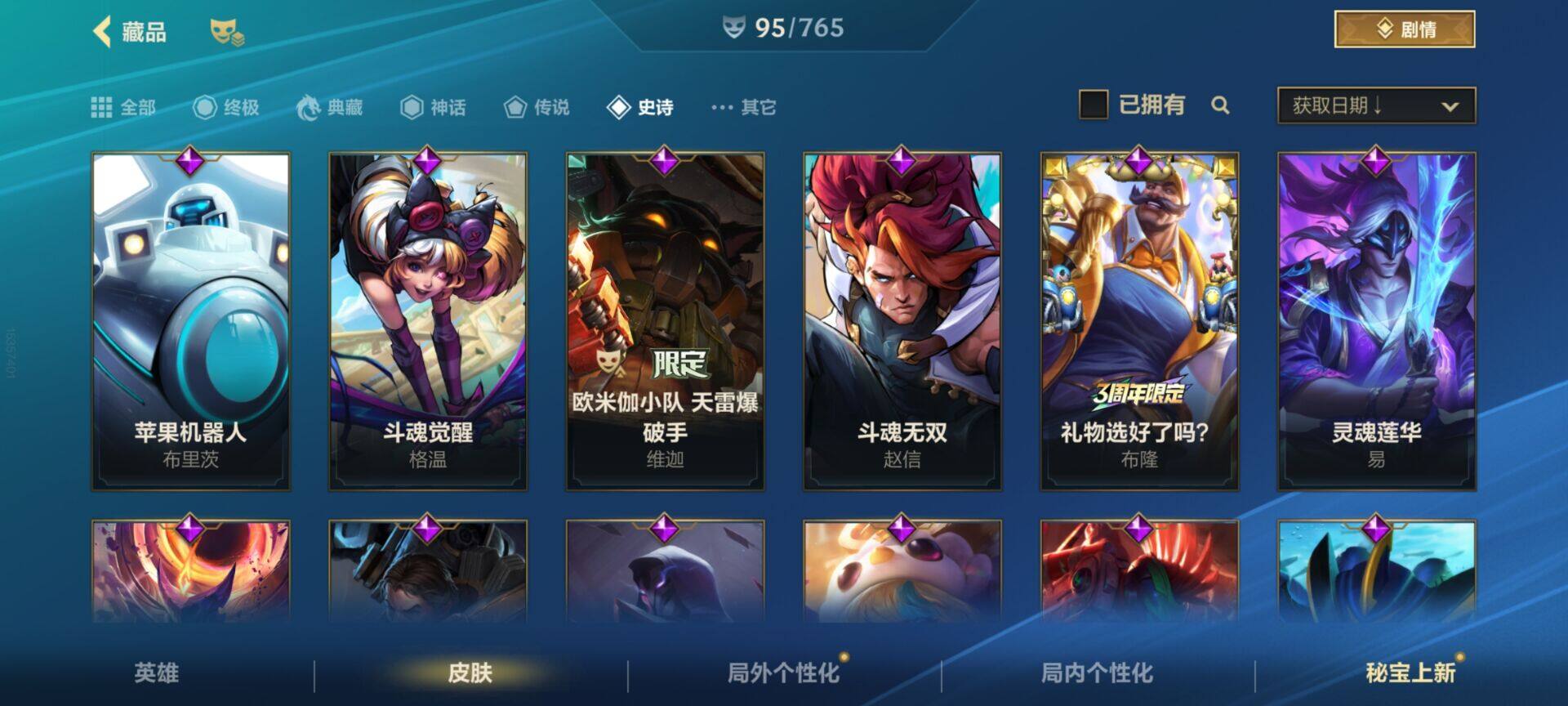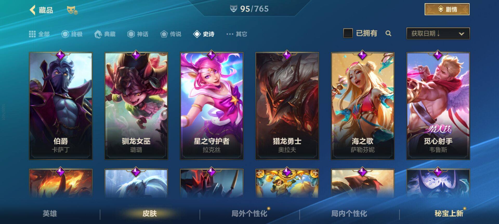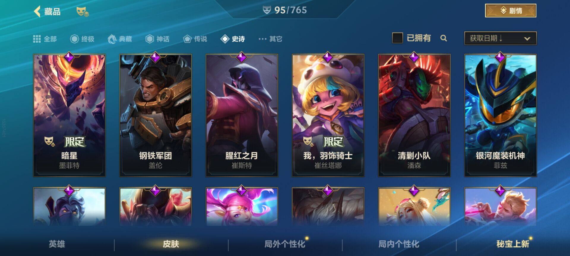 【史诗皮肤】 钢铁军团盖伦 星之守护者拉克丝 恶魔之刃泰达米尔 霸天异形-卡兹克 腥红之月崔斯特 苹果机器人布里茨 死亡誓约劫 源计划山蕾欧娜 星之守护者迦娜 冰川巨兽墨菲特 银河魔装机神菲兹 觅心射手-维鲁斯